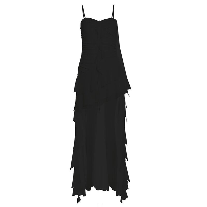 ギャザー入りの胸元やティアード風の裾が女性らしいシルエットを引き立てます。
