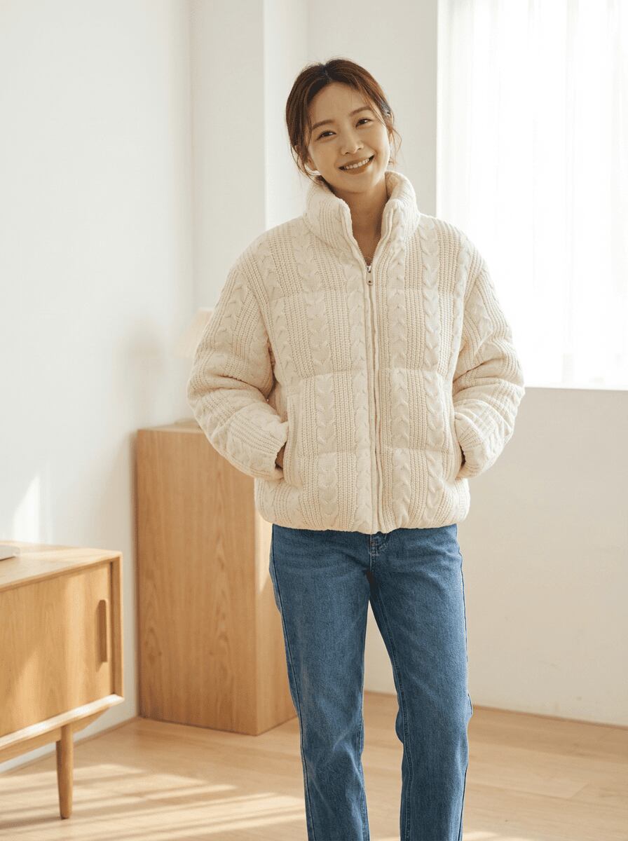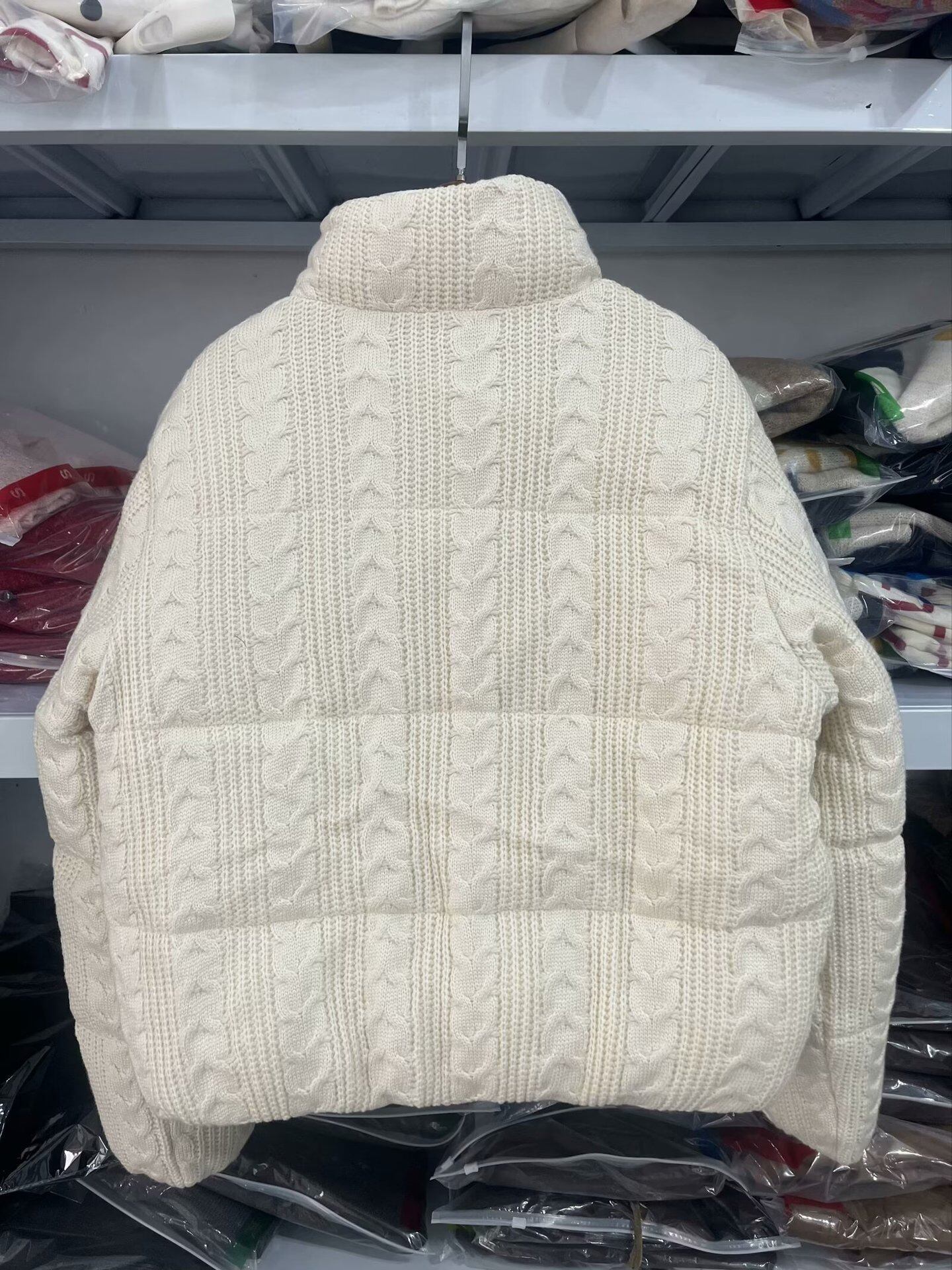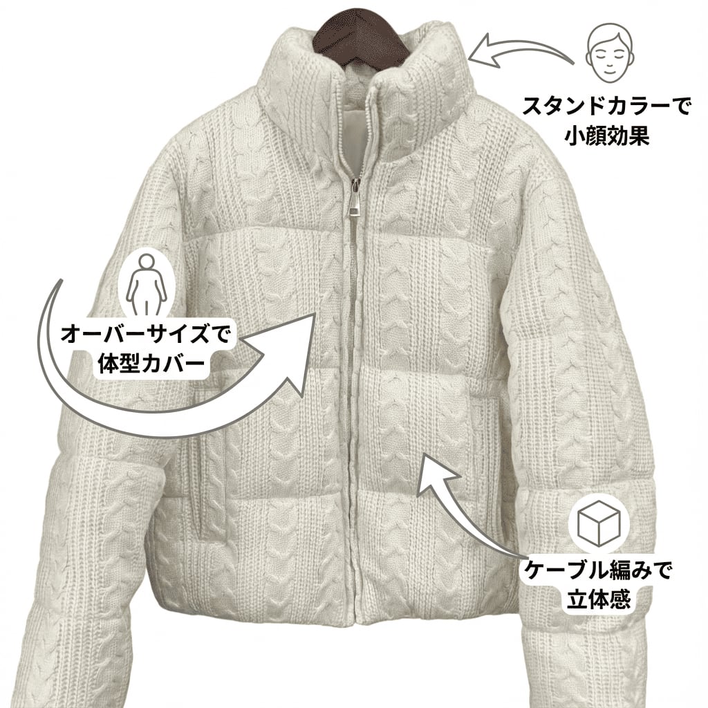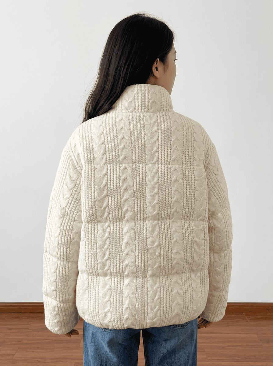優しさあふれるケーブル編みのニットデザインが魅力の厚手ジャケットです。