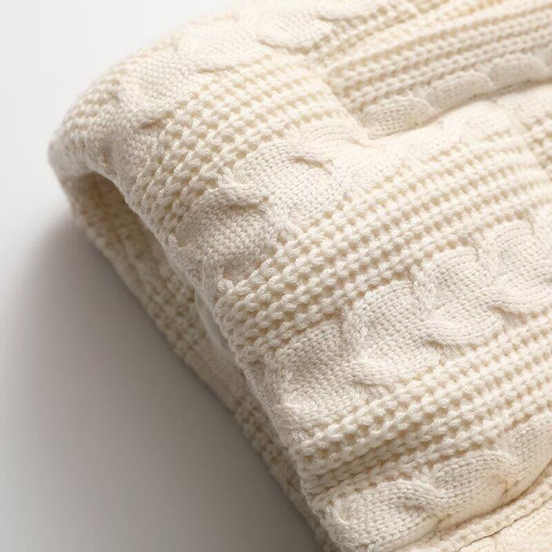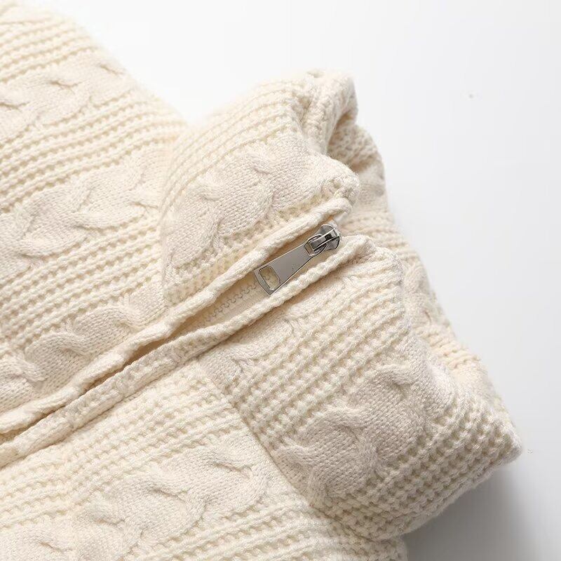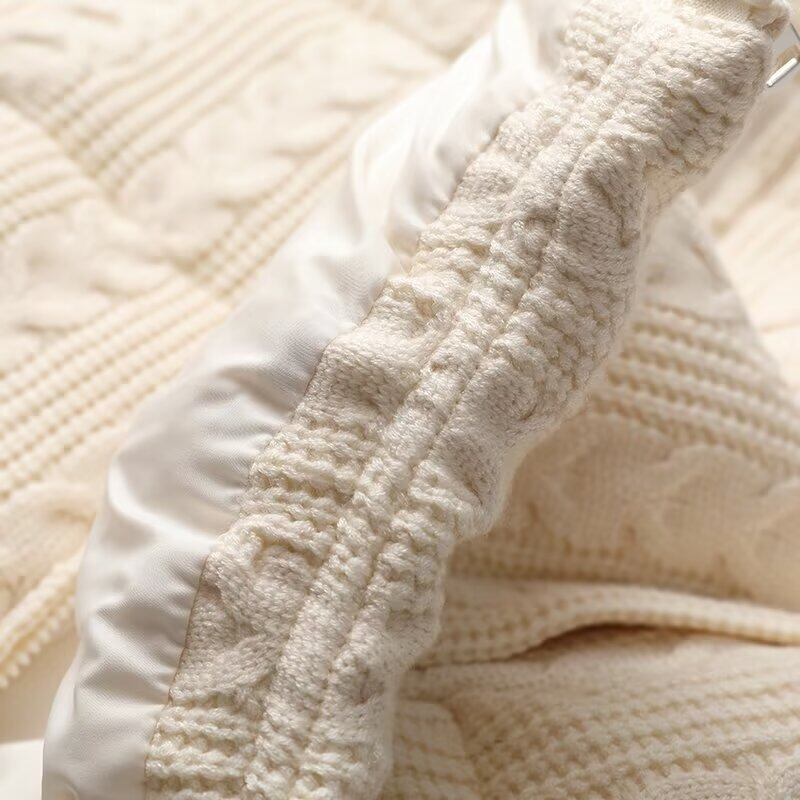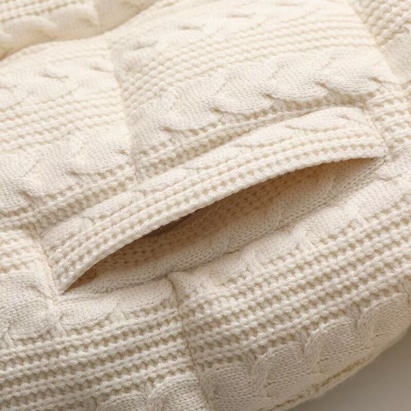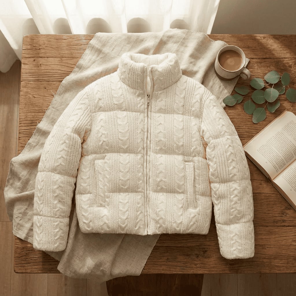 優しさあふれるケーブル編みのニットデザインが魅力の厚手ジャケットです。