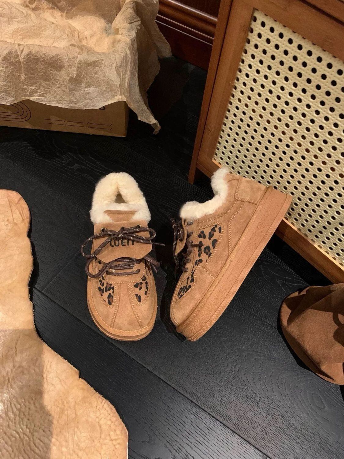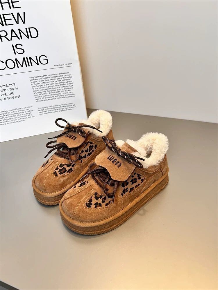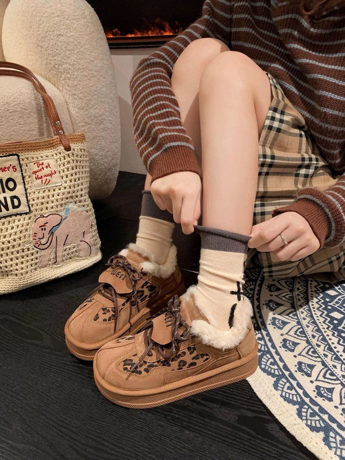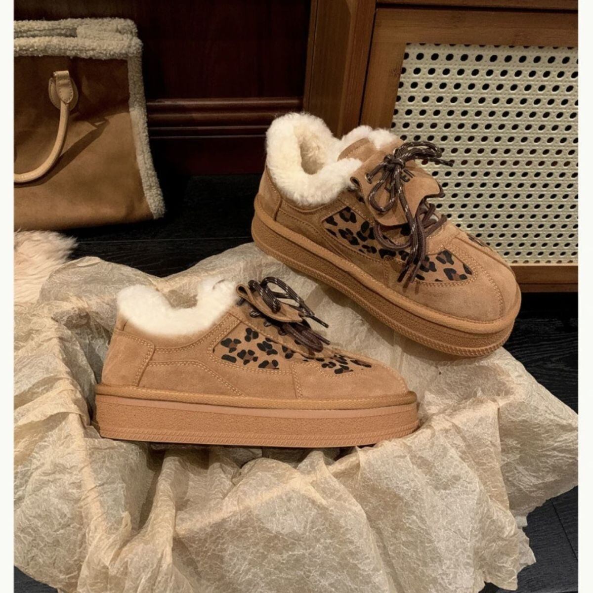 もこもこのファーと無地×レオパード柄の切り替えデザインが目を引く、キュートな厚底スニーカーです。