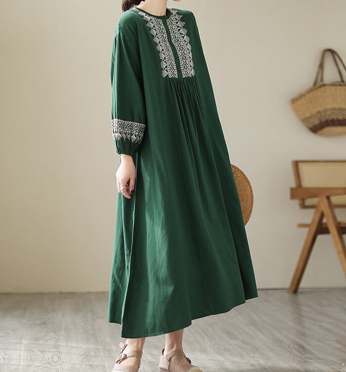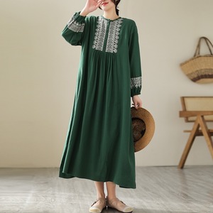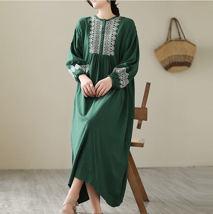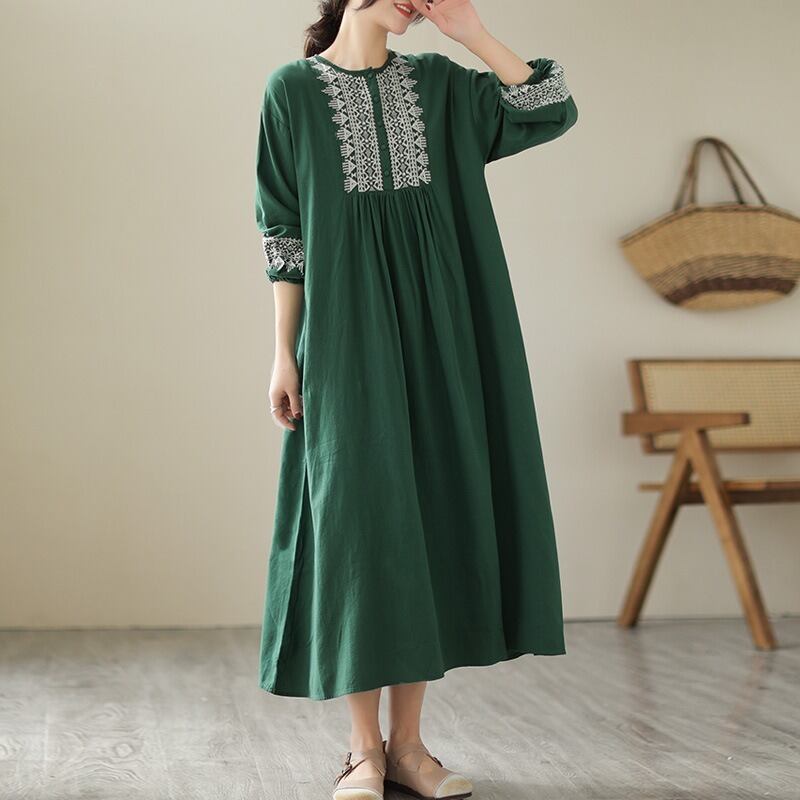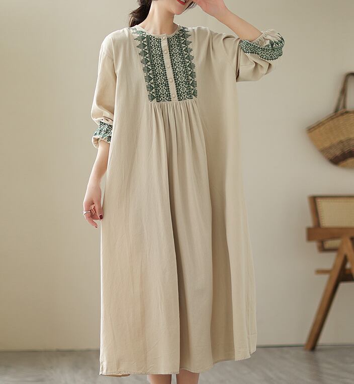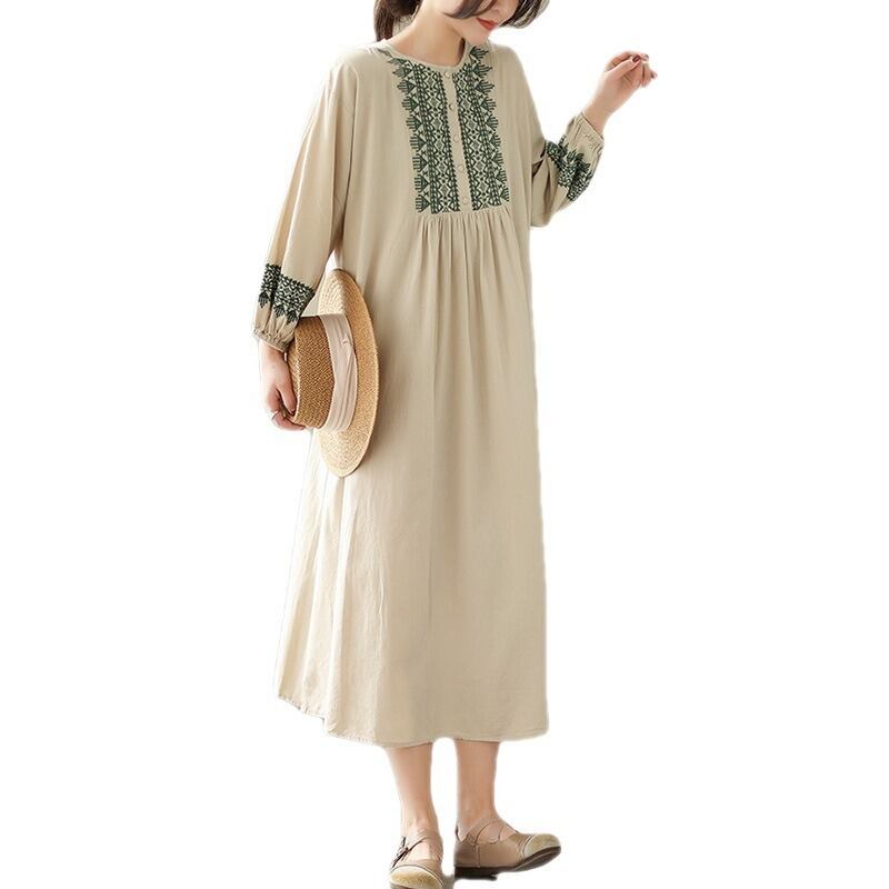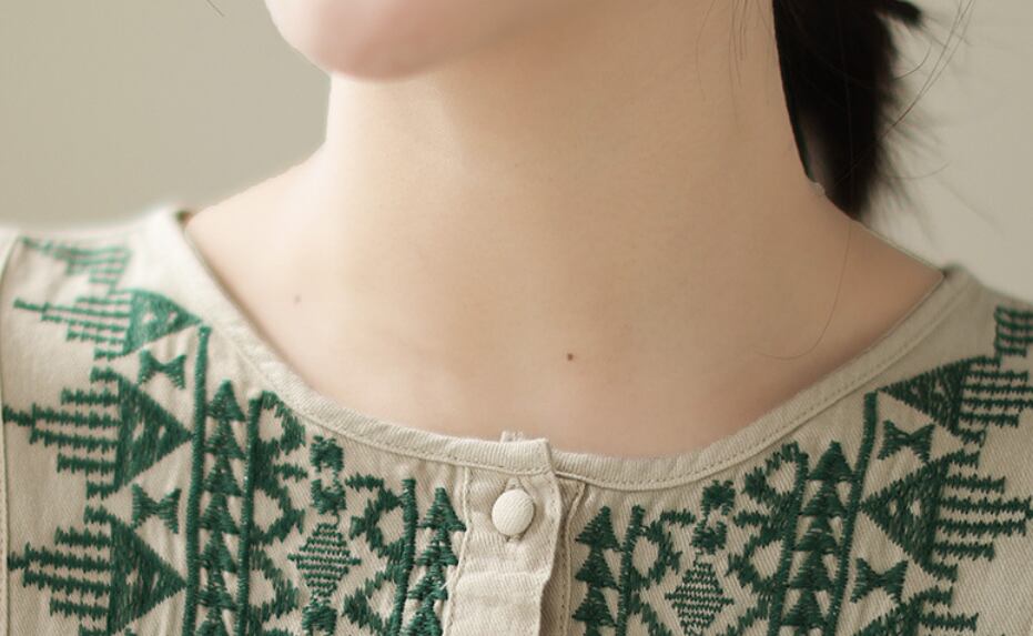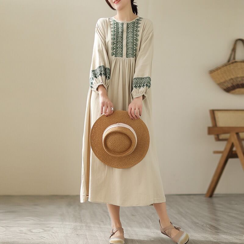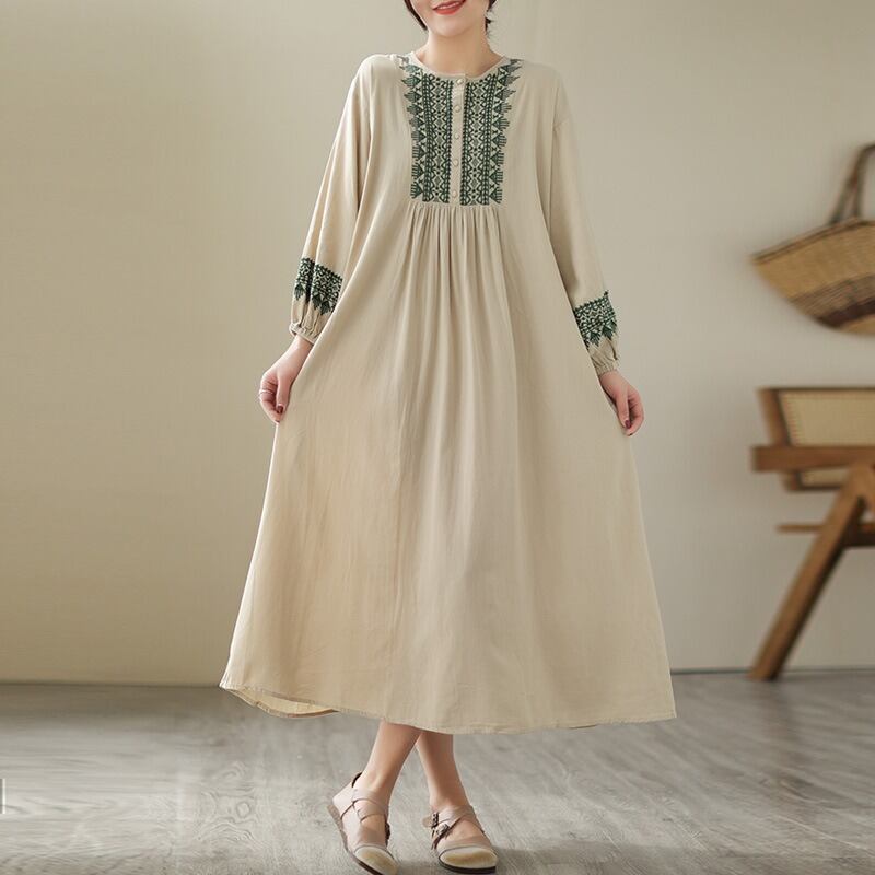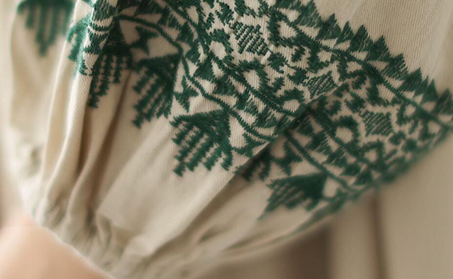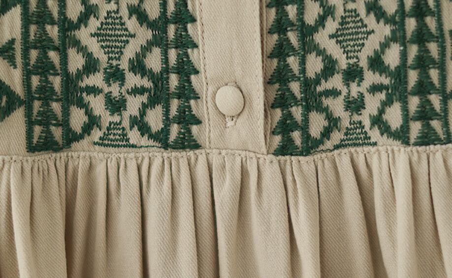 9分丈の長袖で、ラウンドネックとおしゃれな刺繍のデザインが、異国風の魅力を引き立てます。