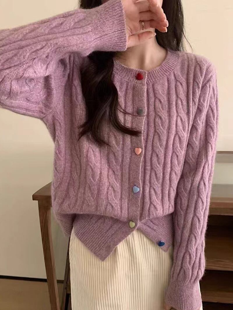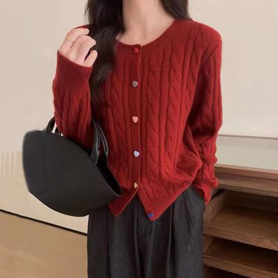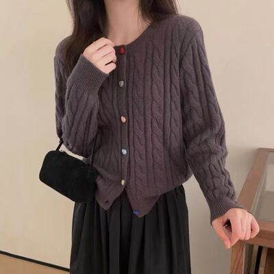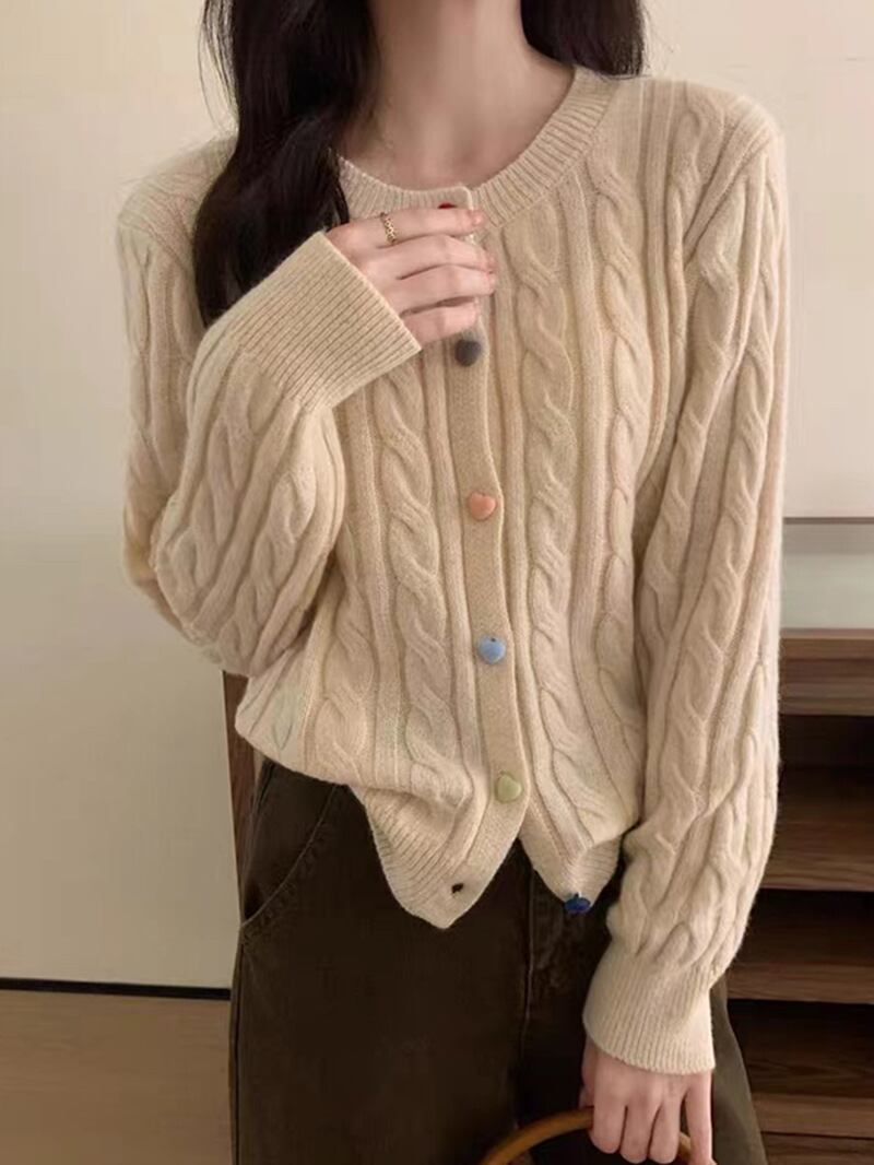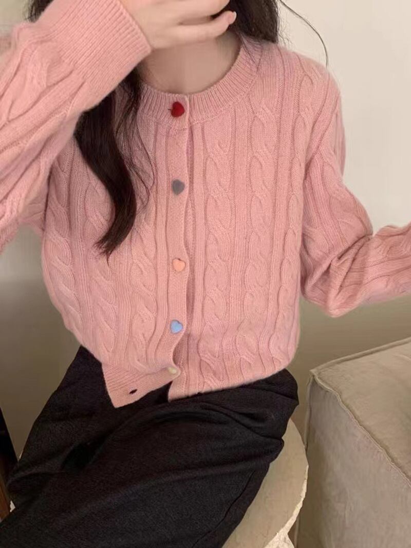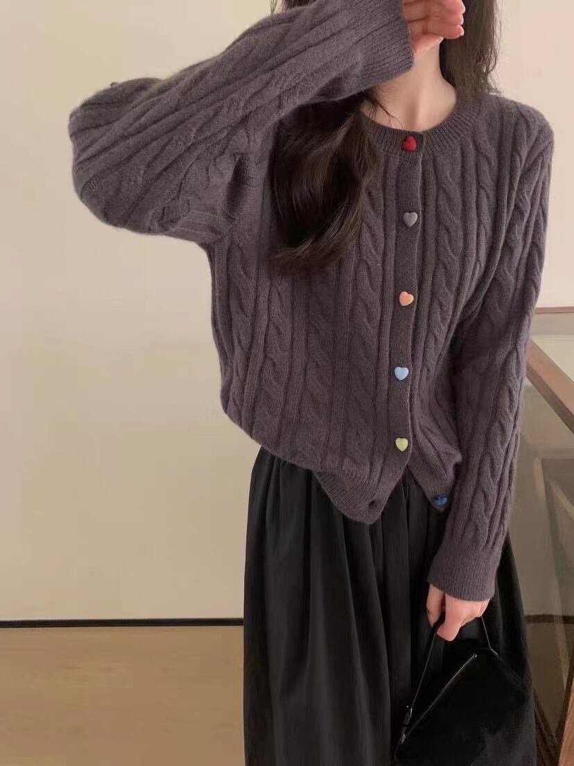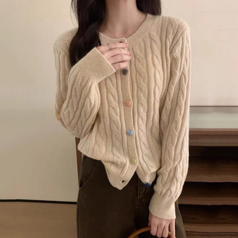 このレディースニットカーディガンは、シンプルでありながらも大人可愛い印象を与えます。
