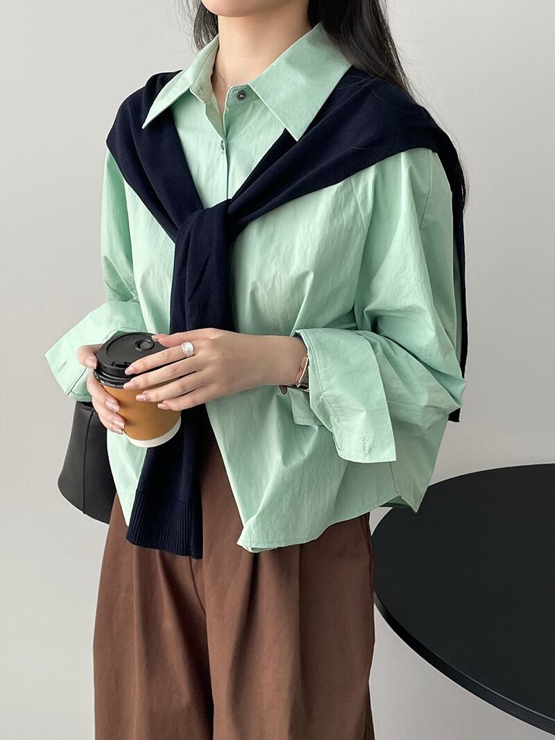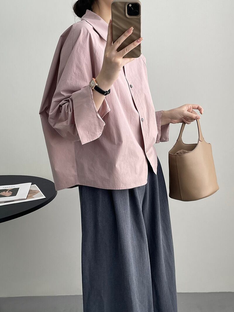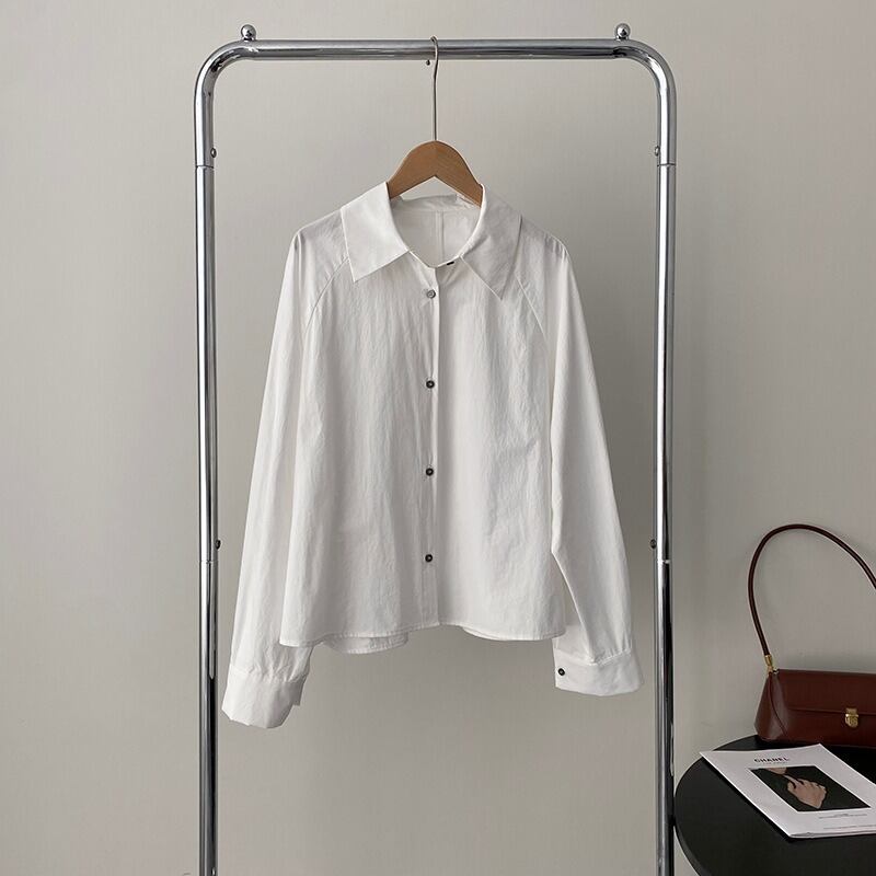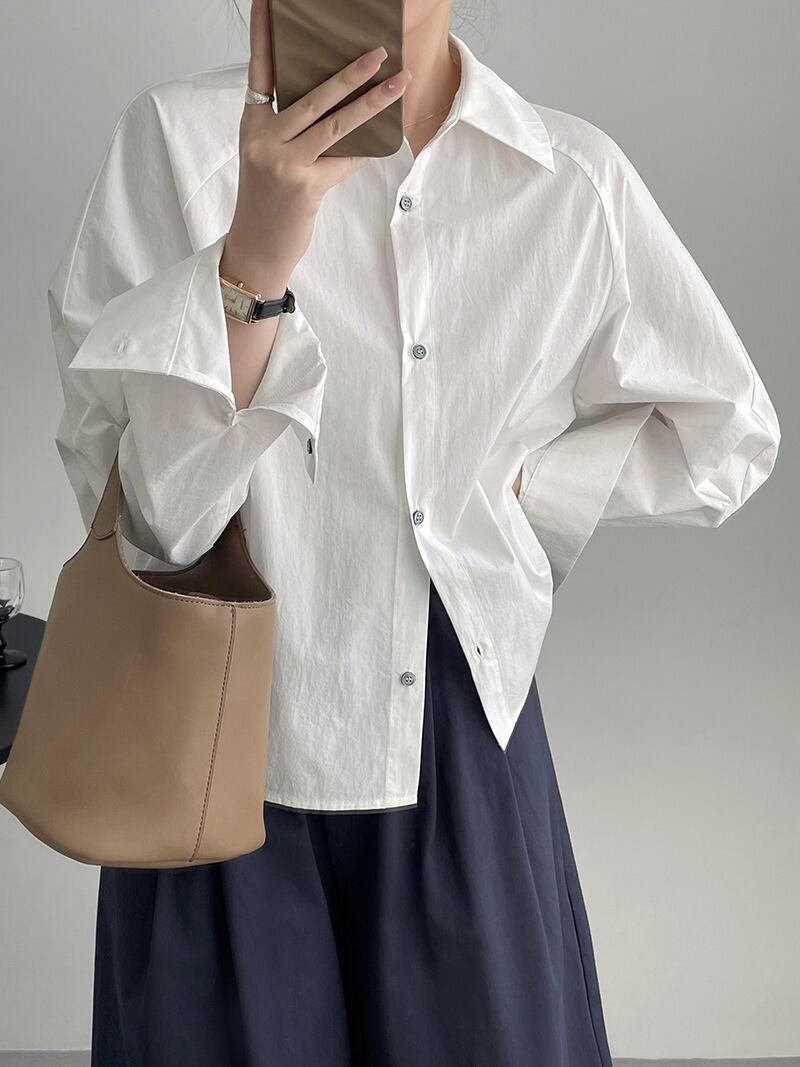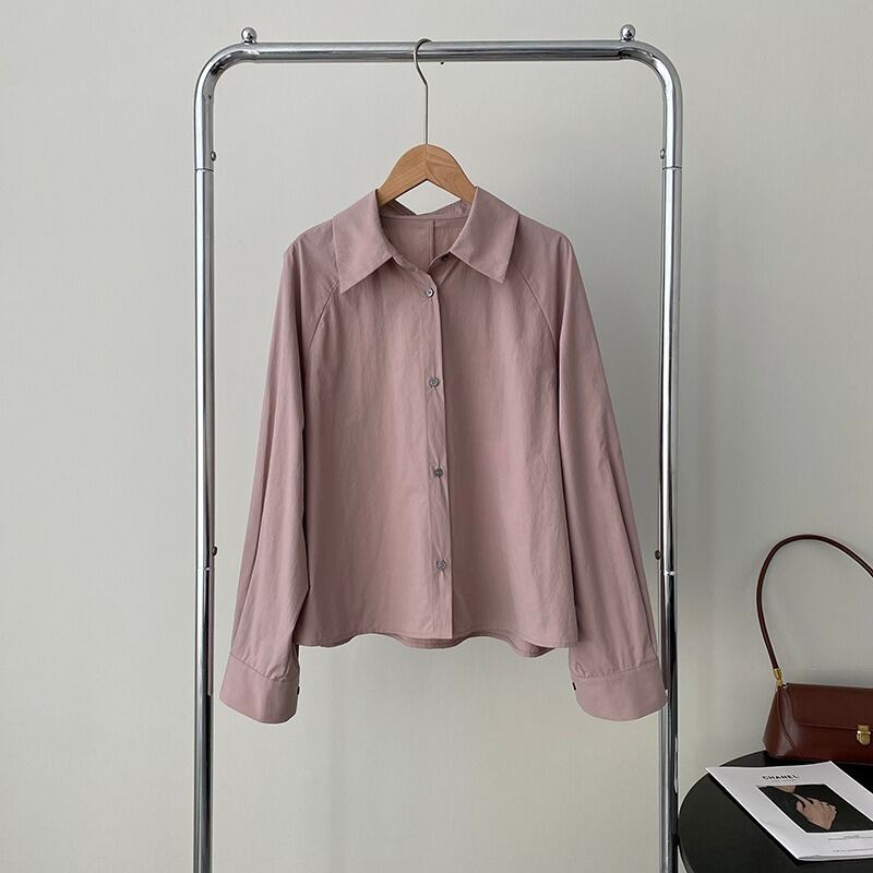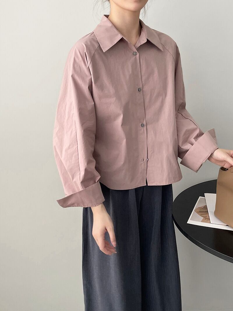 前開き&オーバーサイズデザインで、こなれ感と抜け感のある大人可愛いスタイルを演出できる、襟付きラグランシャツです。