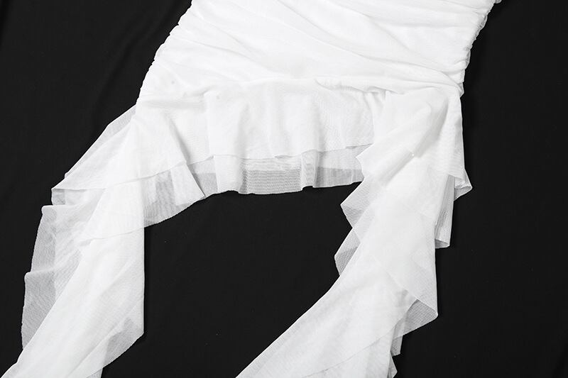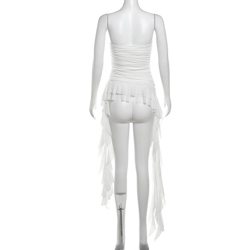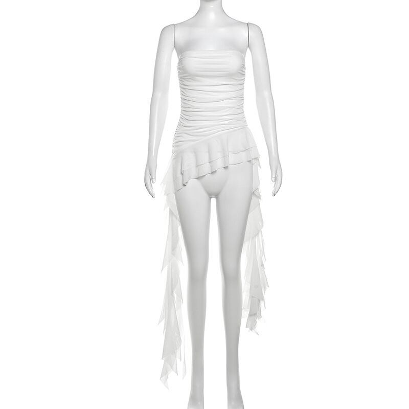 大胆なチューブトップと華やかなロングフリルが視線を集める主役級トップス。