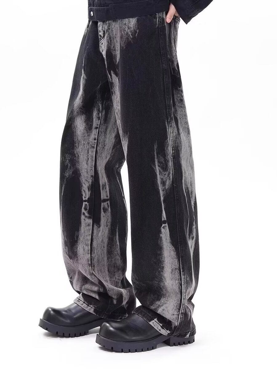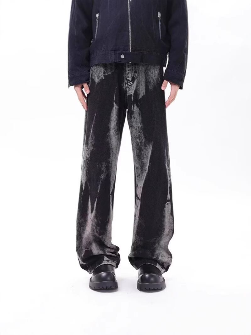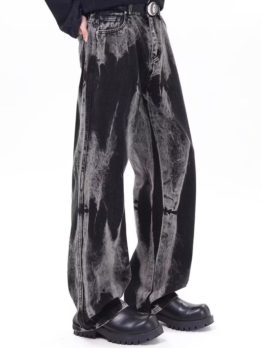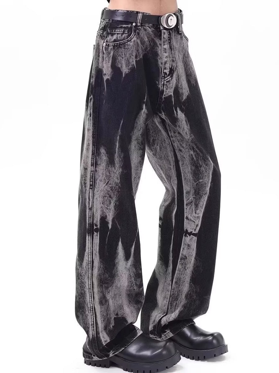 大胆なウォッシュ加工が視線を惹きつける、クールなワイドデニムパンツ。
