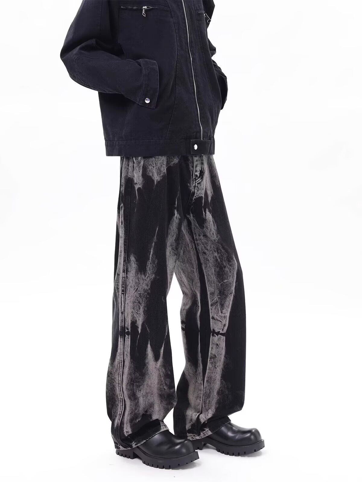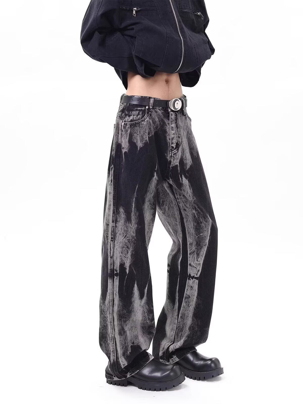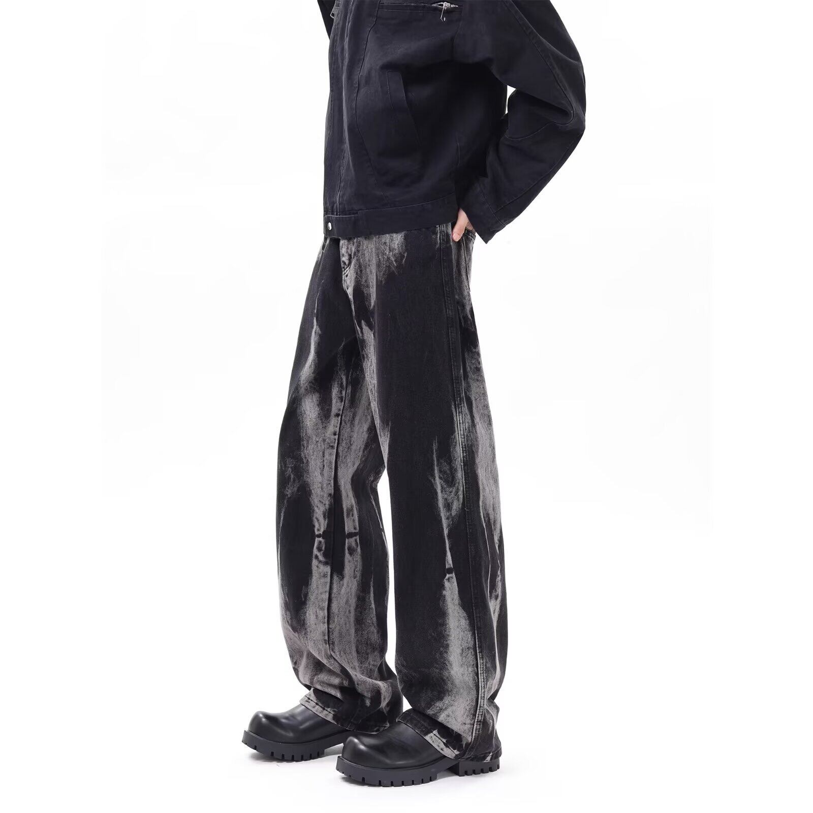 大胆なウォッシュ加工が視線を惹きつける、クールなワイドデニムパンツ。