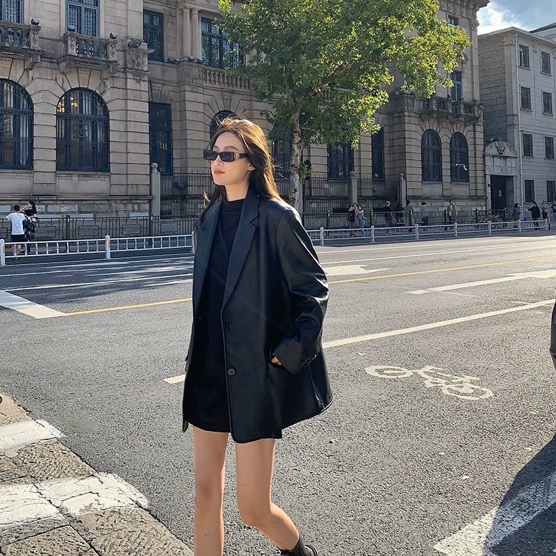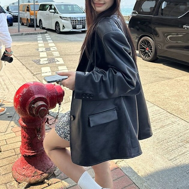 存在感のあるロング丈のフェイクレザージャケットが、この秋冬のコーデを格上げ。