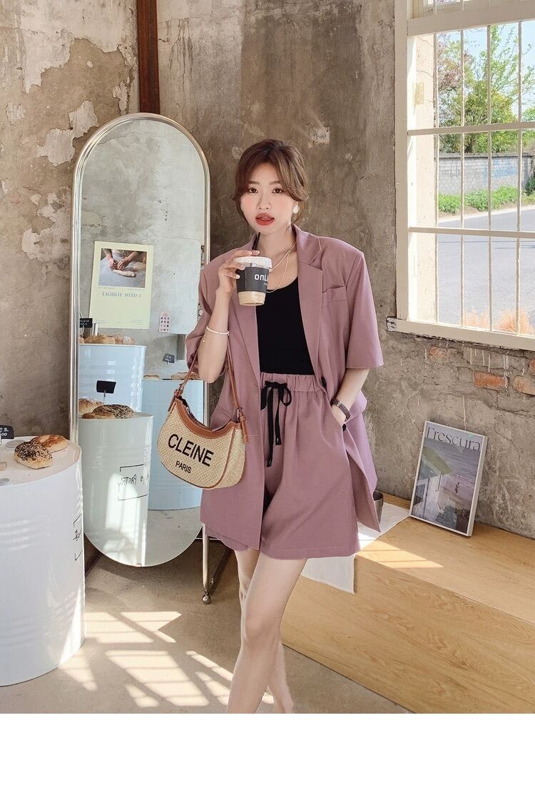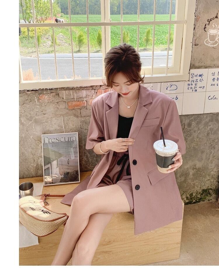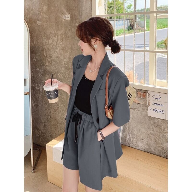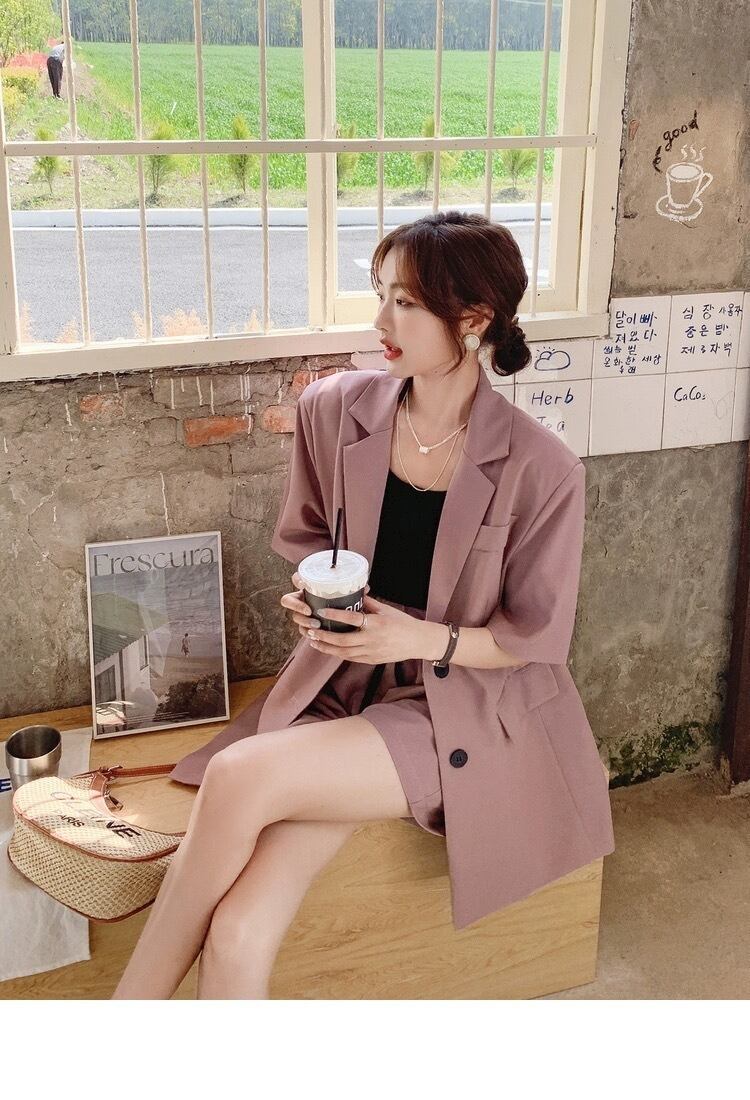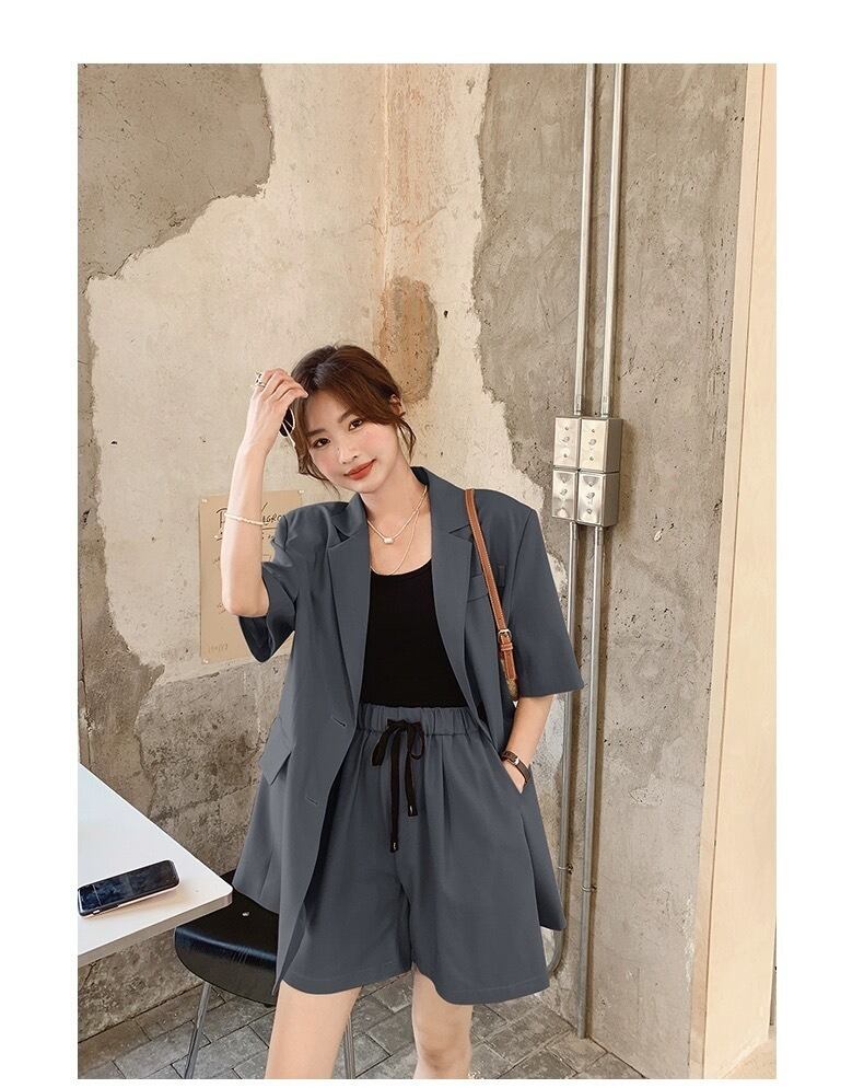 シンプルでありながらもこだわりのあるデザインが特徴のレディース用ジャケットとショートパンツのセットアップです。