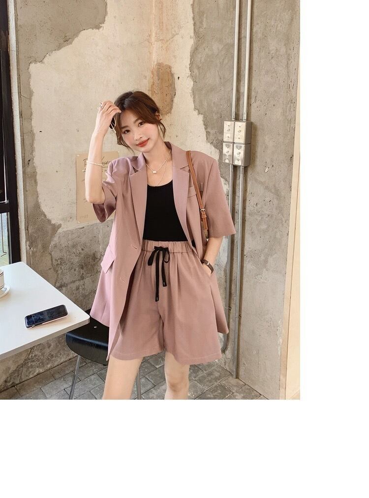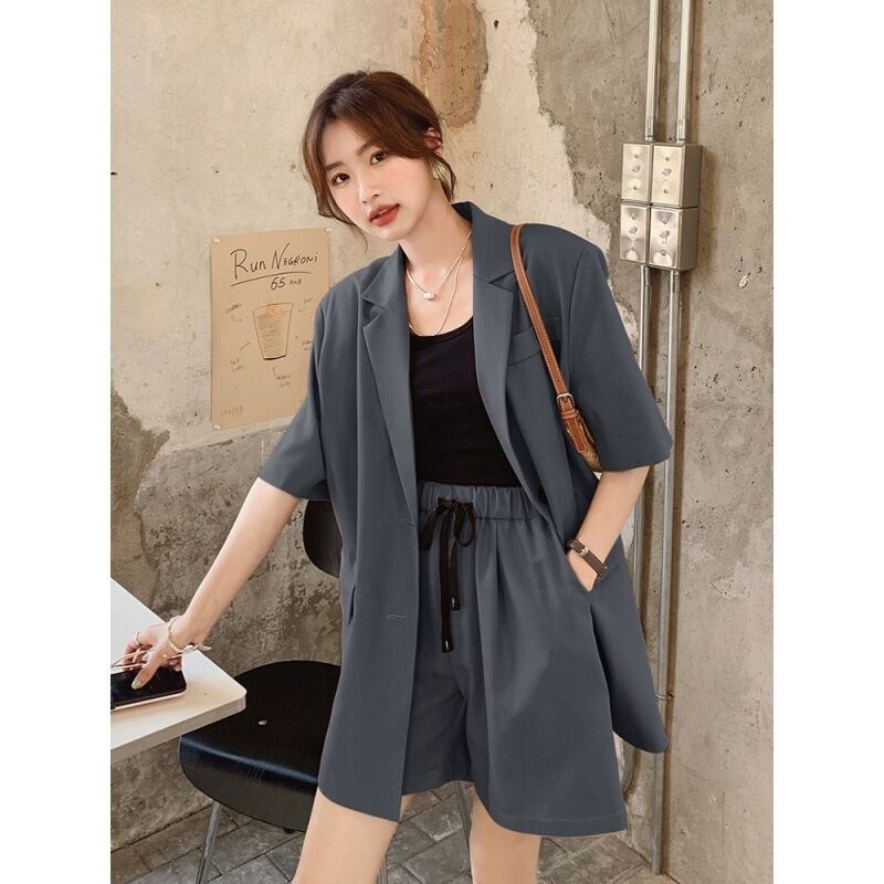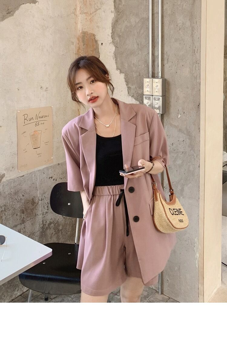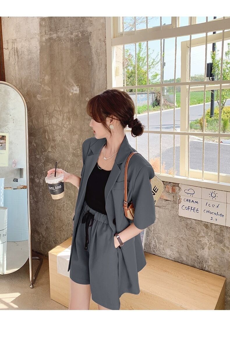 シンプルでありながらもこだわりのあるデザインが特徴のレディース用ジャケットとショートパンツのセットアップです。