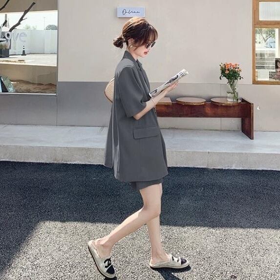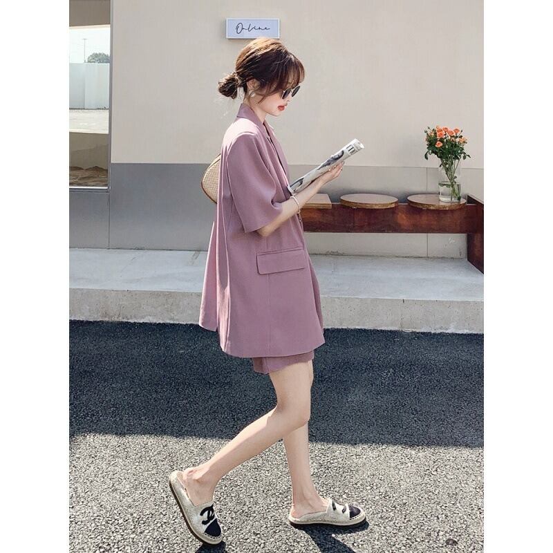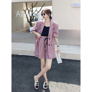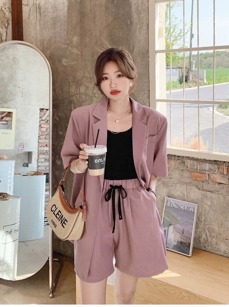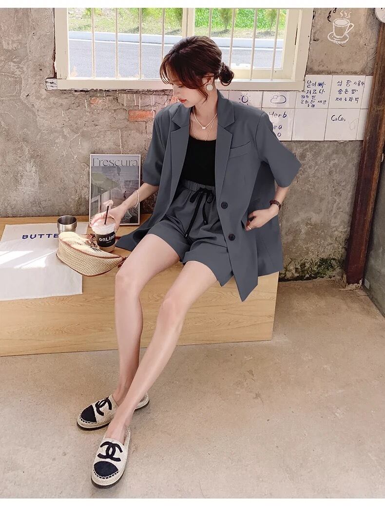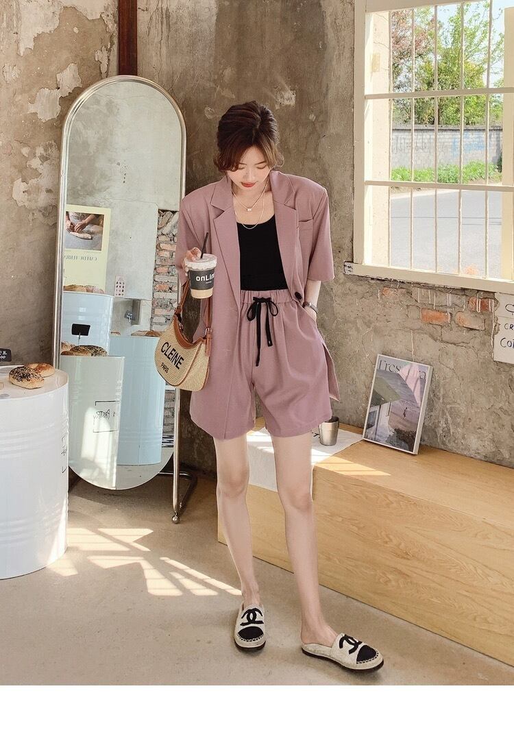 前開きの羽織りやすいジャケットと、カジュアルにもきれいめにも使えるショートパンツの組み合わせは、春夏にぴったりです。