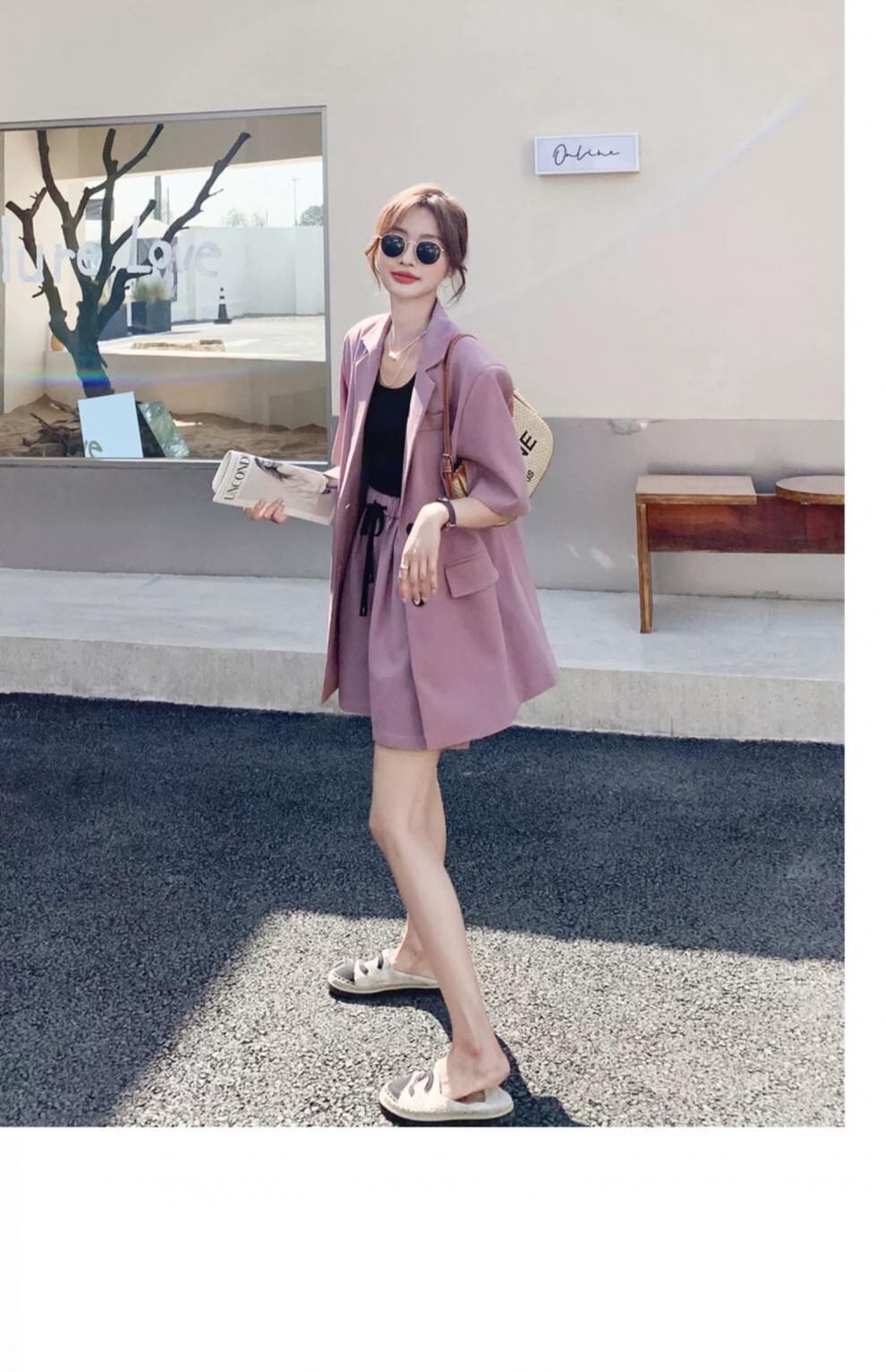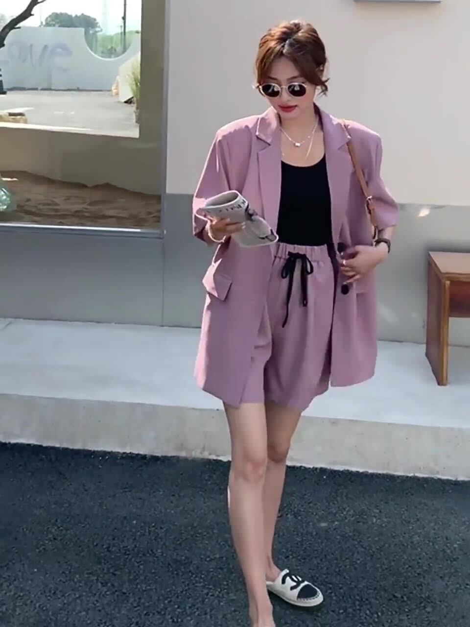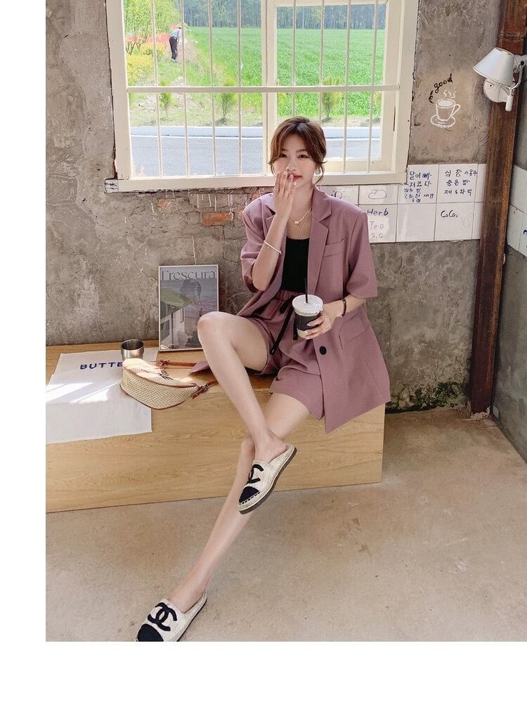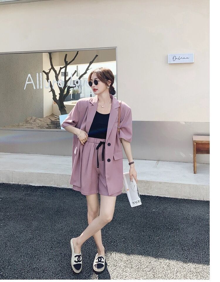 前開きの羽織りやすいジャケットと、カジュアルにもきれいめにも使えるショートパンツの組み合わせは、春夏にぴったりです。
