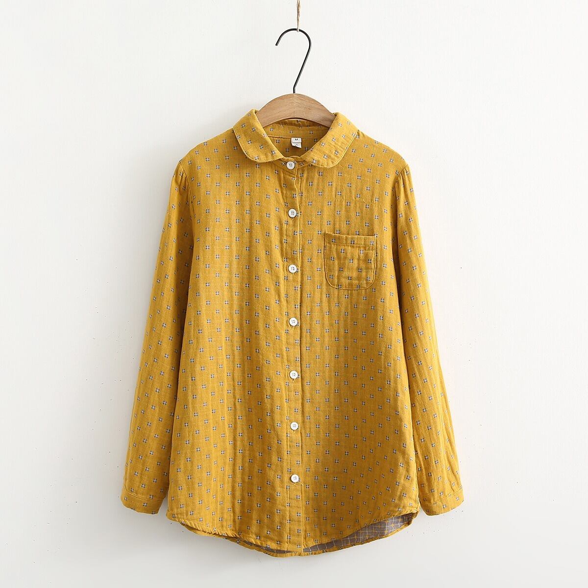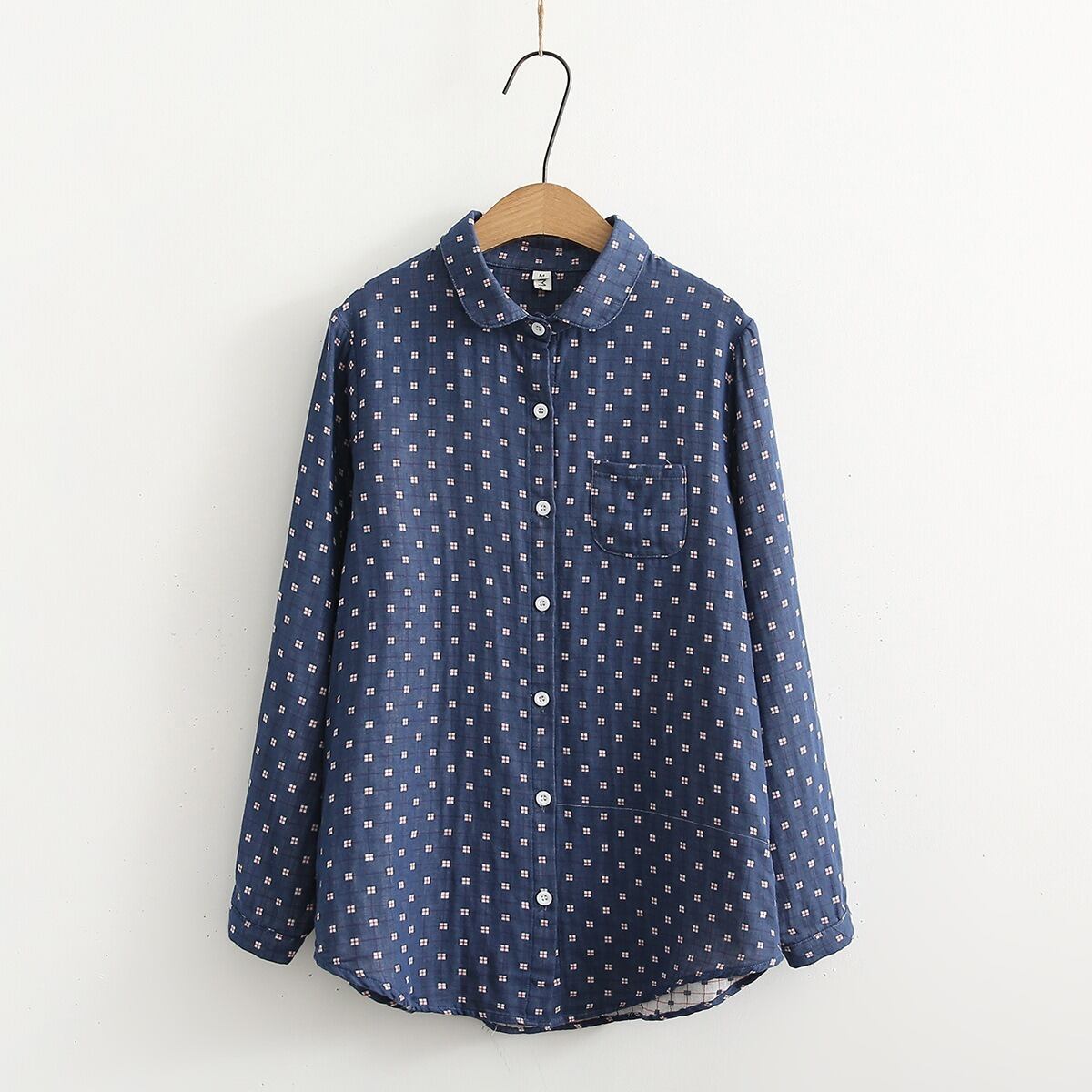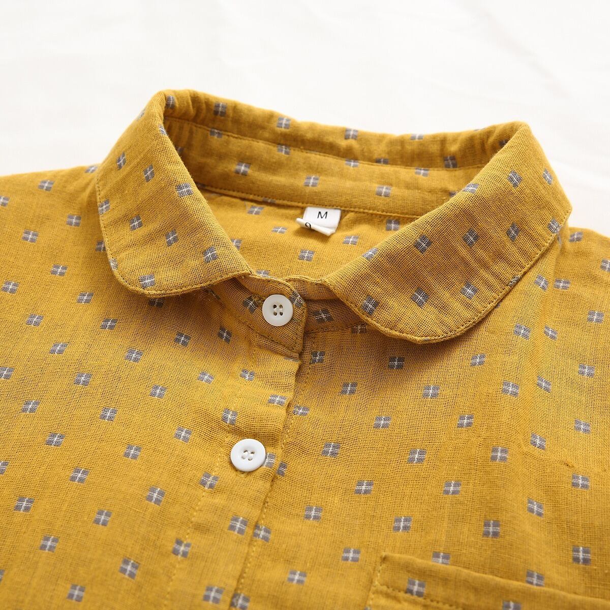 どこか懐かしくて新しい、レトロなプリントが魅力の丸襟シャツ。