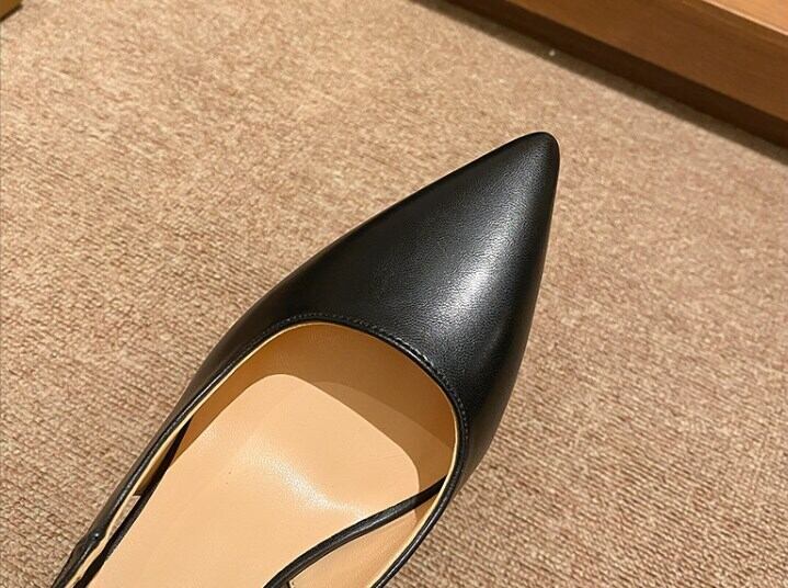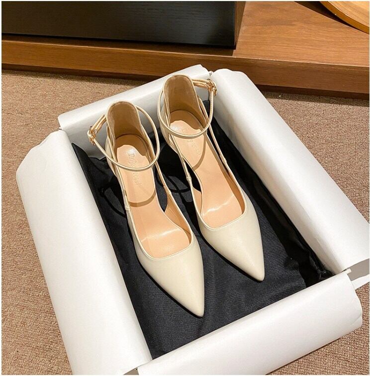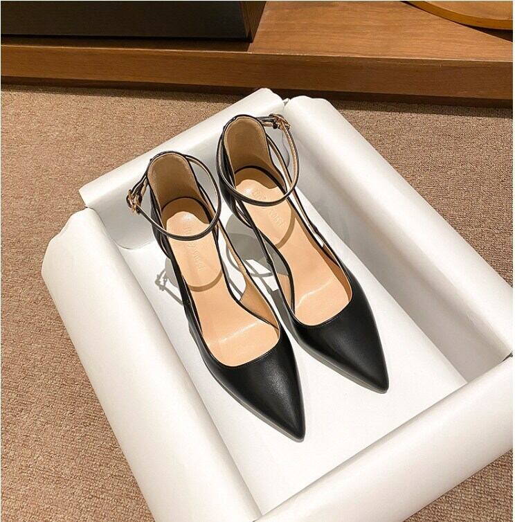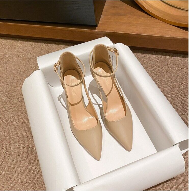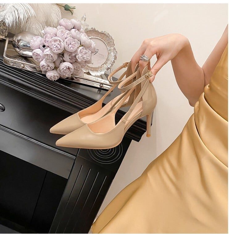 足元から女性らしさを引き立てる、ハイヒールのストラップ付きポインテッドトゥパンプス。