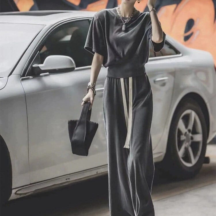 ストレートパンツとゆるトップスのバランスが絶妙で、動きやすさとトレンド感を兼ね備えた一着。