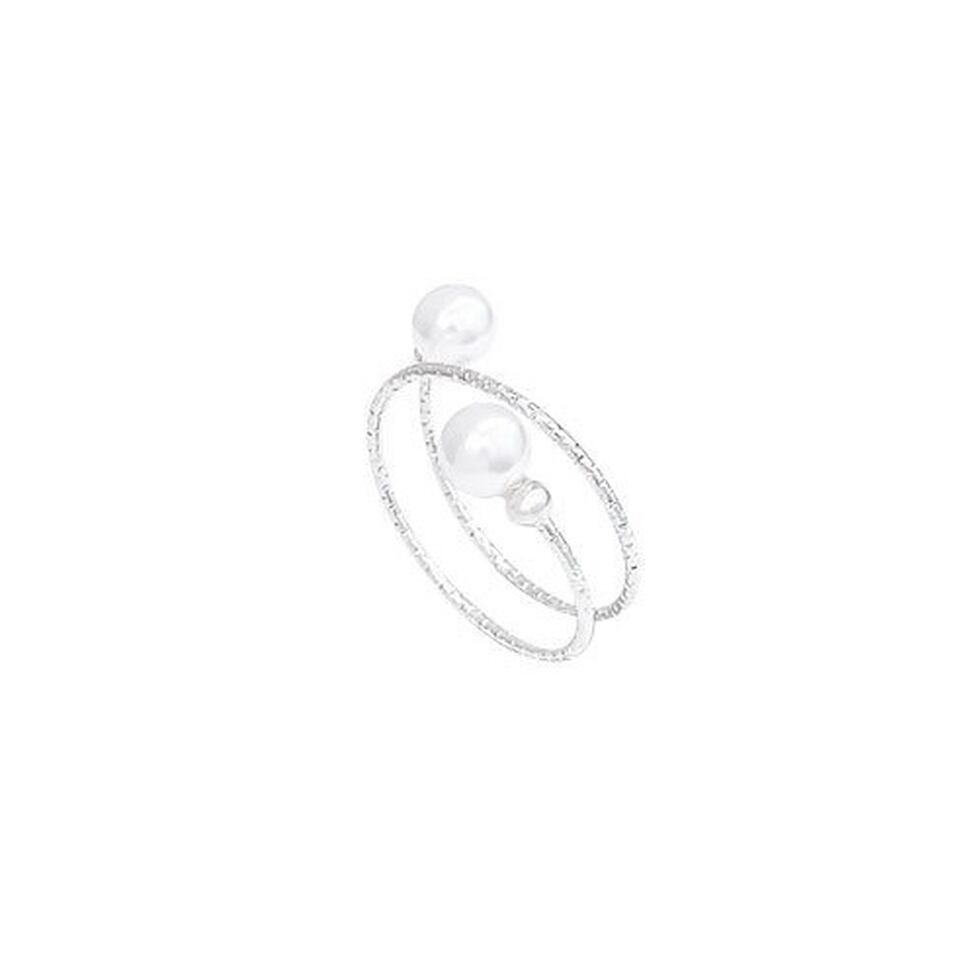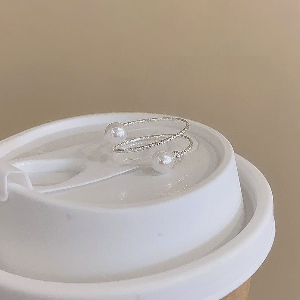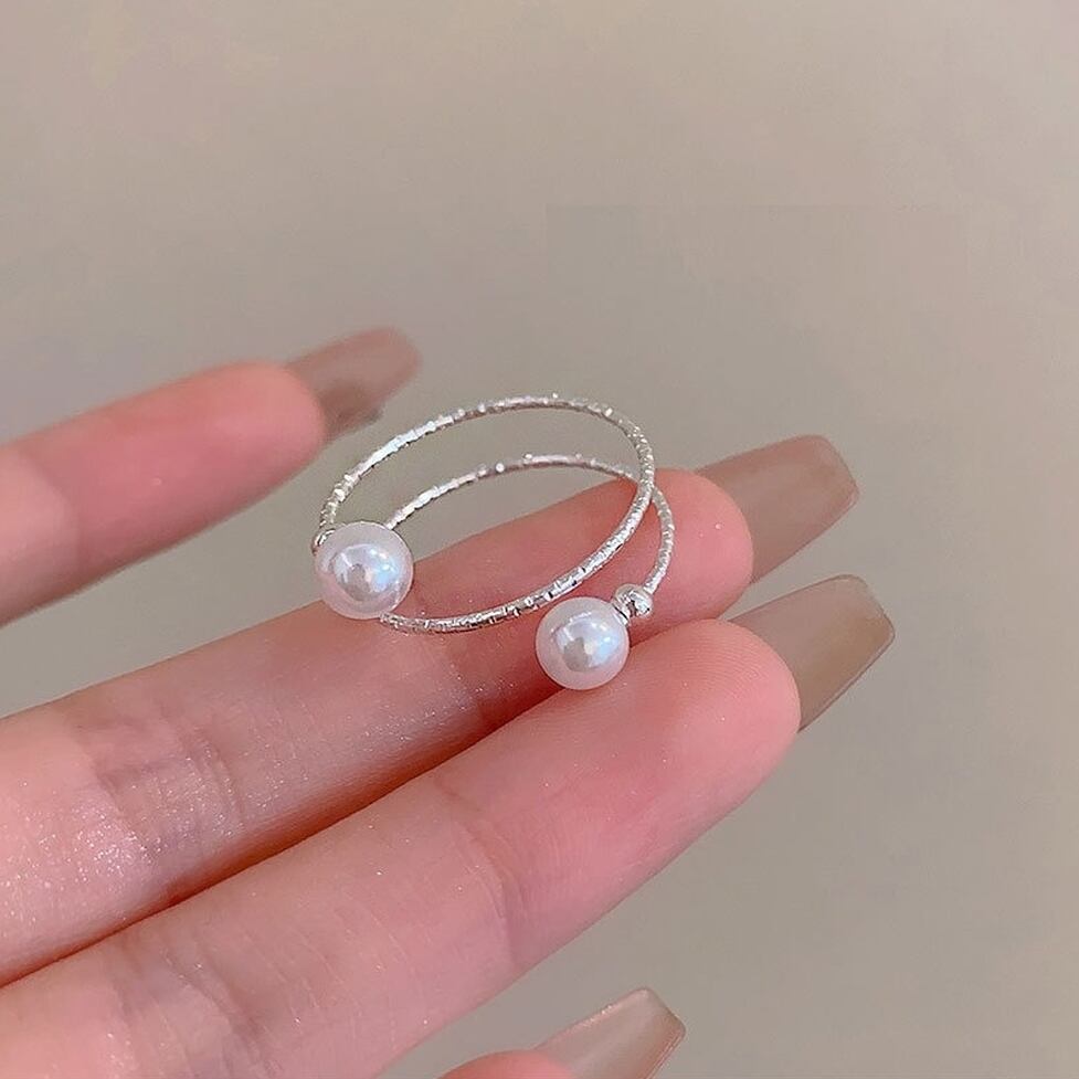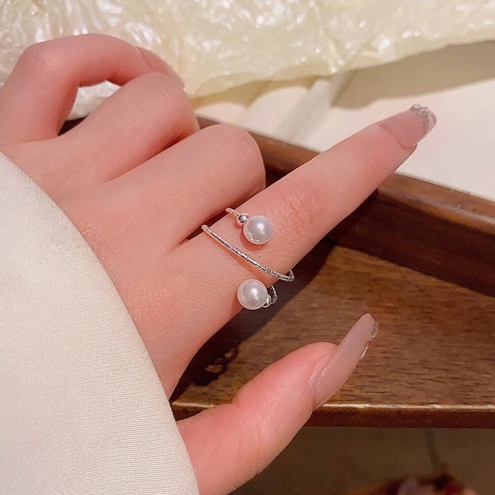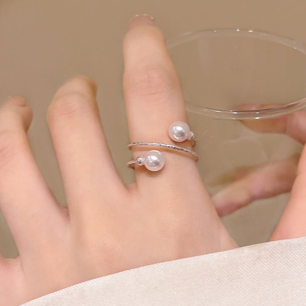 華奢な手元を演出するダブル&パールの指輪。もの足りなさをカバーしつつ部分的にデザイン性を足せる。デコラティブな装飾でベーシックなコーデも無理なく華やかな仕上がりに