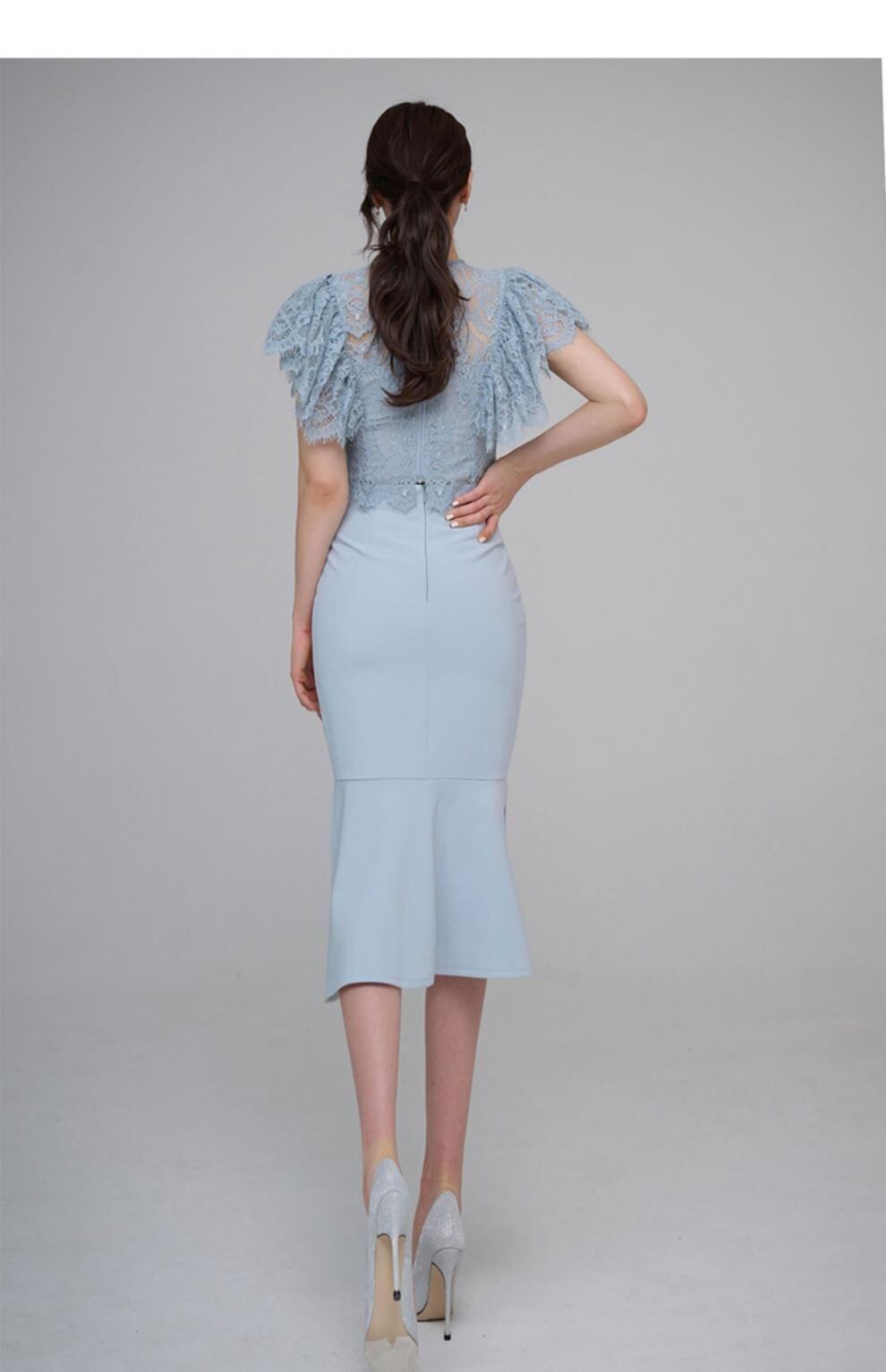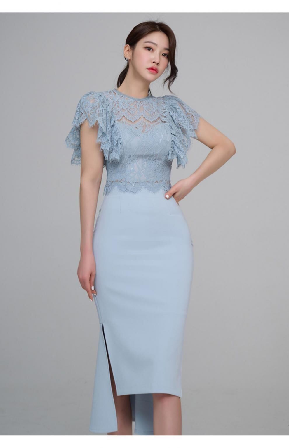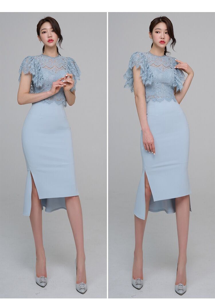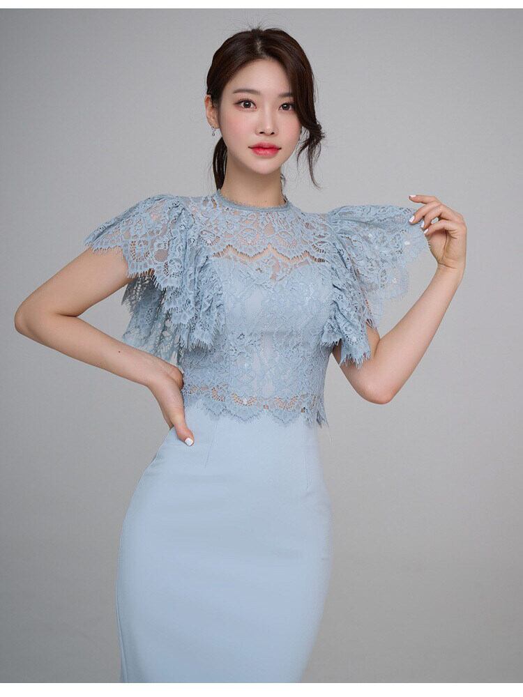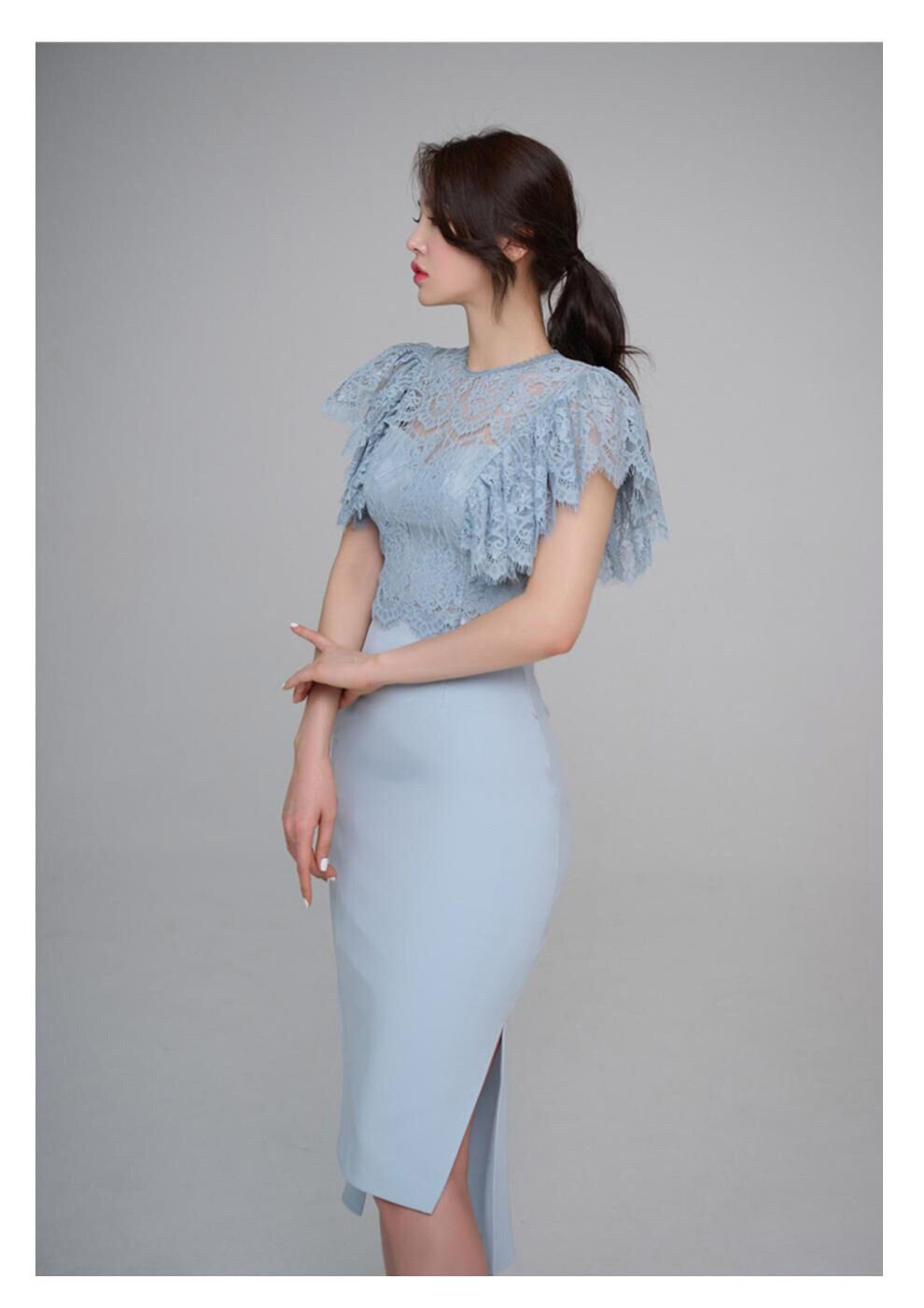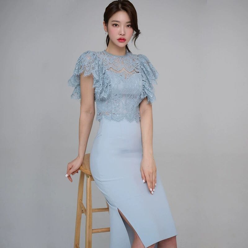 クルーネックとフレアスリーブのレーストップスに、タイトなラインのスカートが美しいメリハリを生み出します。