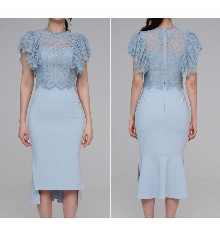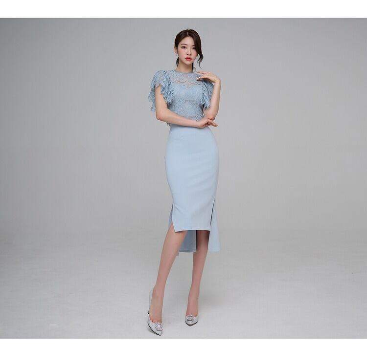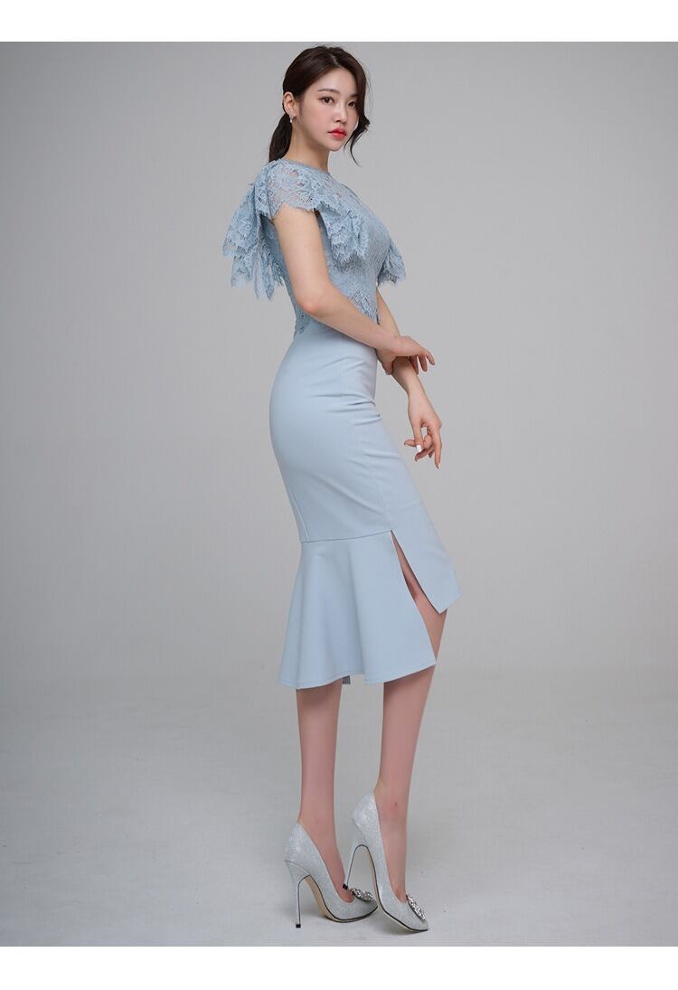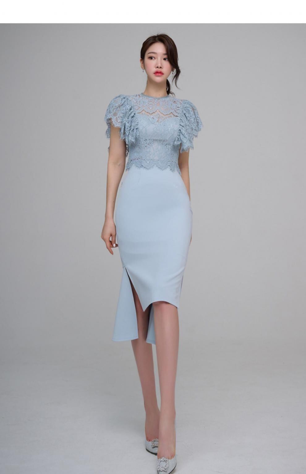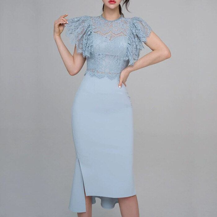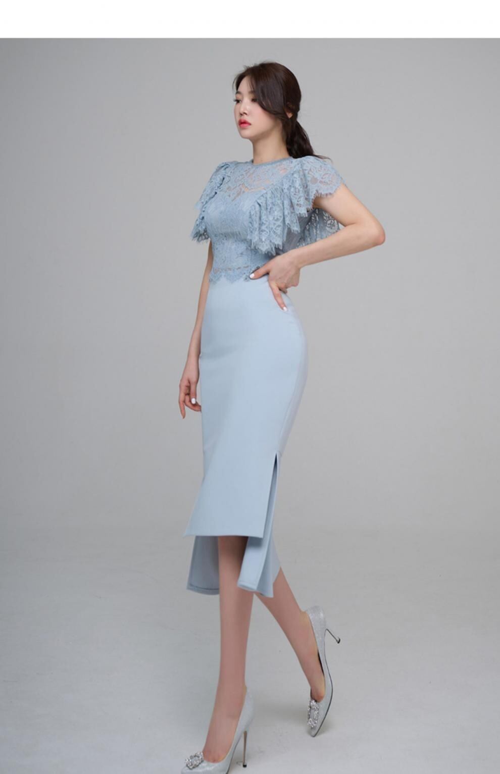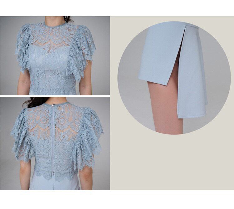 クルーネックとフレアスリーブのレーストップスに、タイトなラインのスカートが美しいメリハリを生み出します。