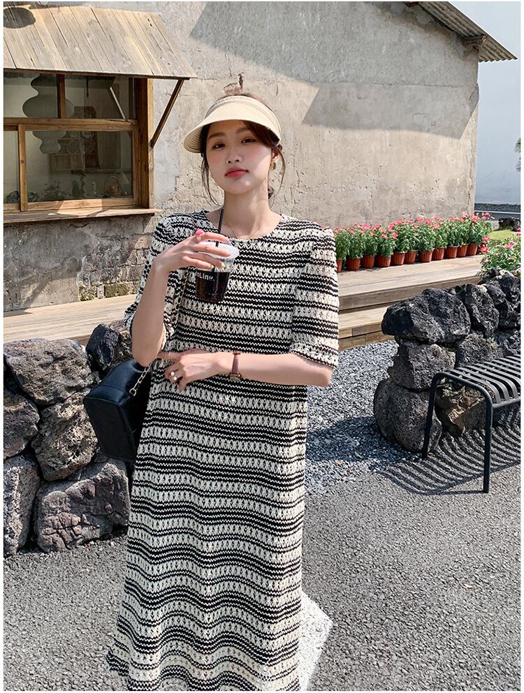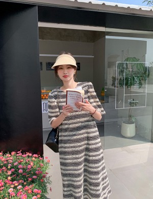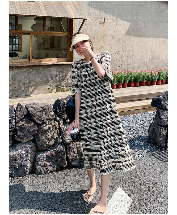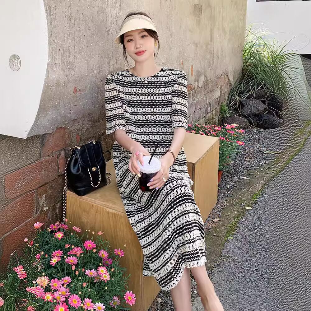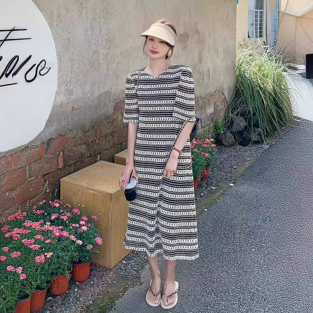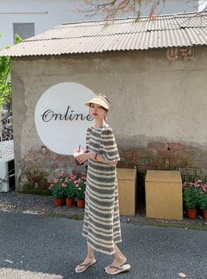 トレンド感たっぷりのボーダー柄が魅力の、ミディアム丈Aラインワンピース。