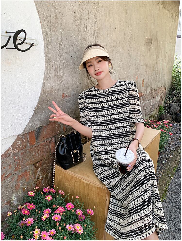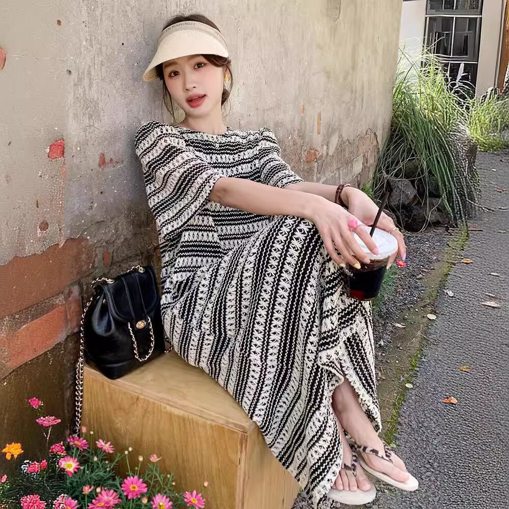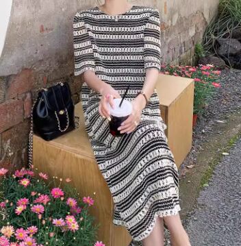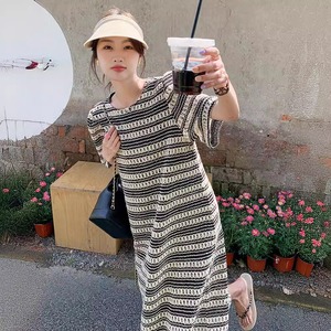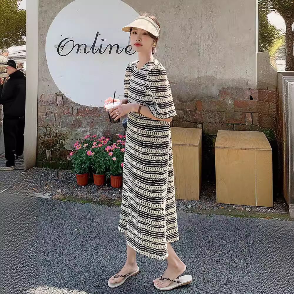 トレンド感たっぷりのボーダー柄が魅力の、ミディアム丈Aラインワンピース。