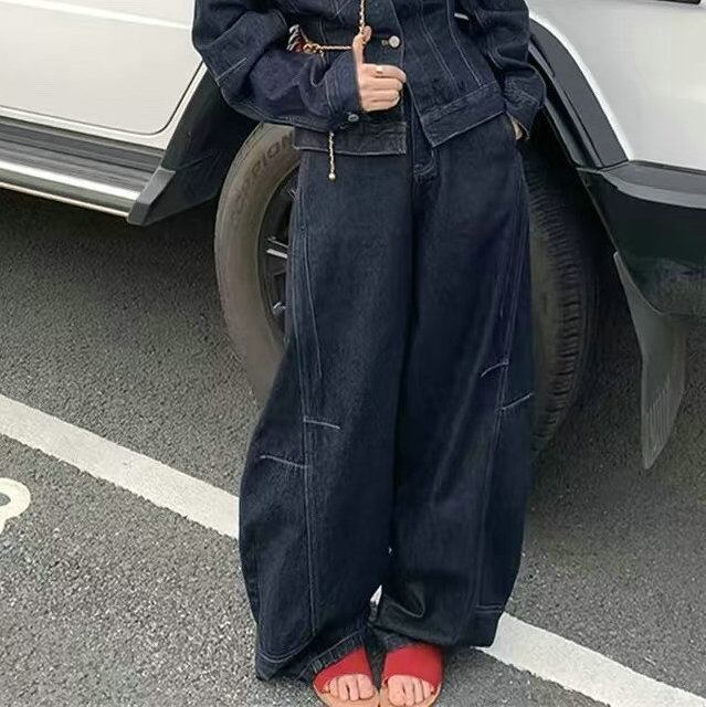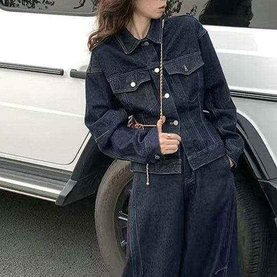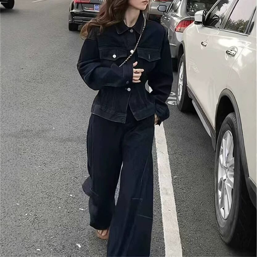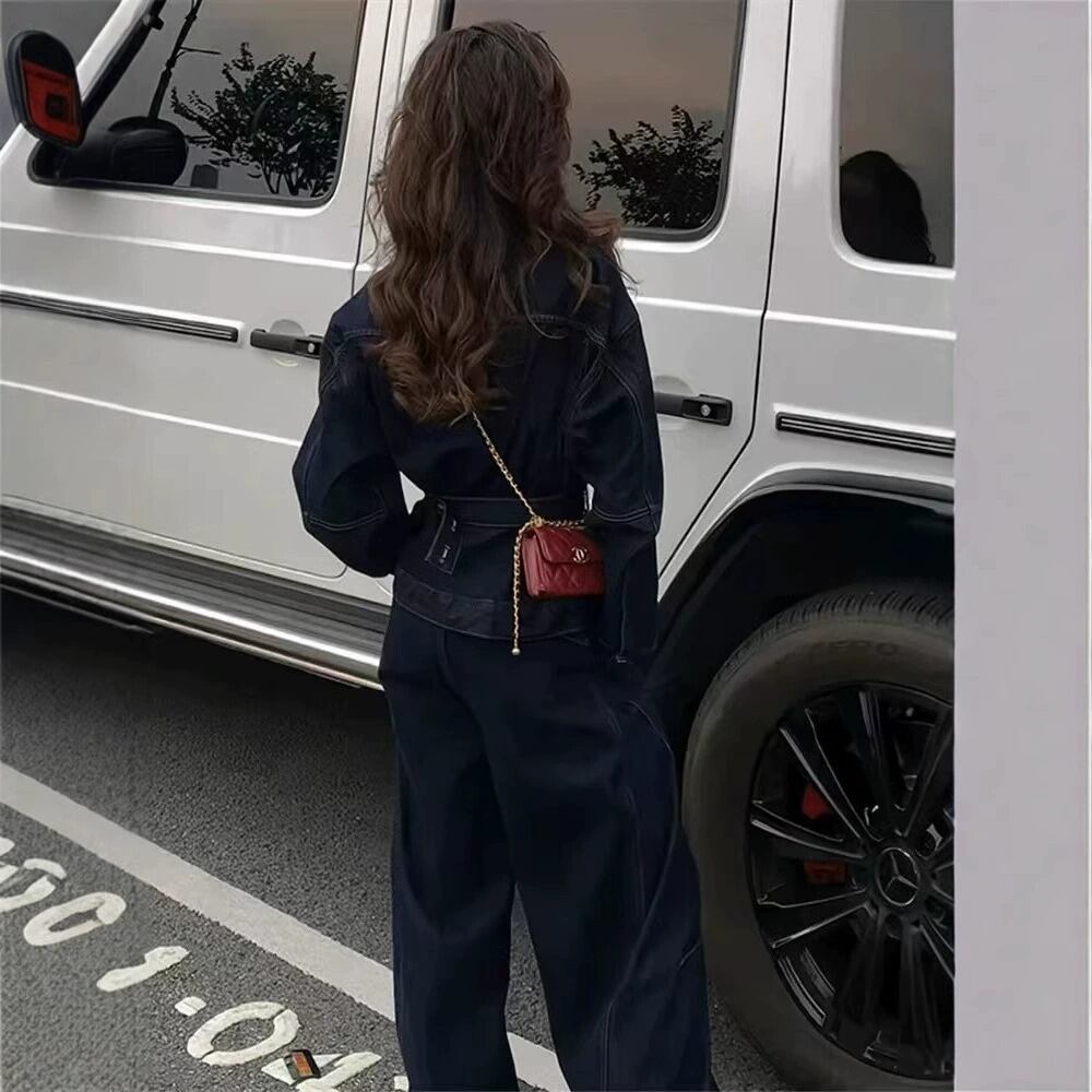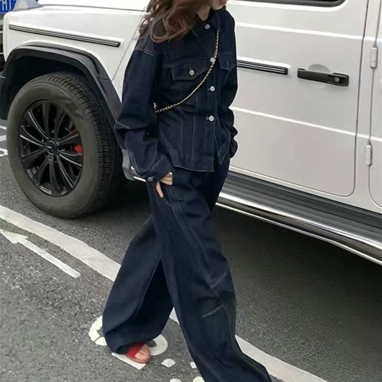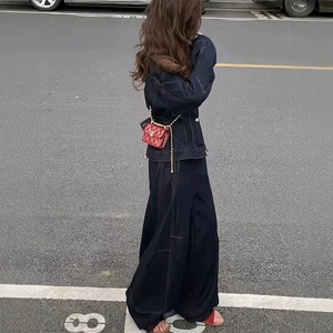 シンプルながらも洗練された印象を与える、ネイビーのデニムセットアップ。