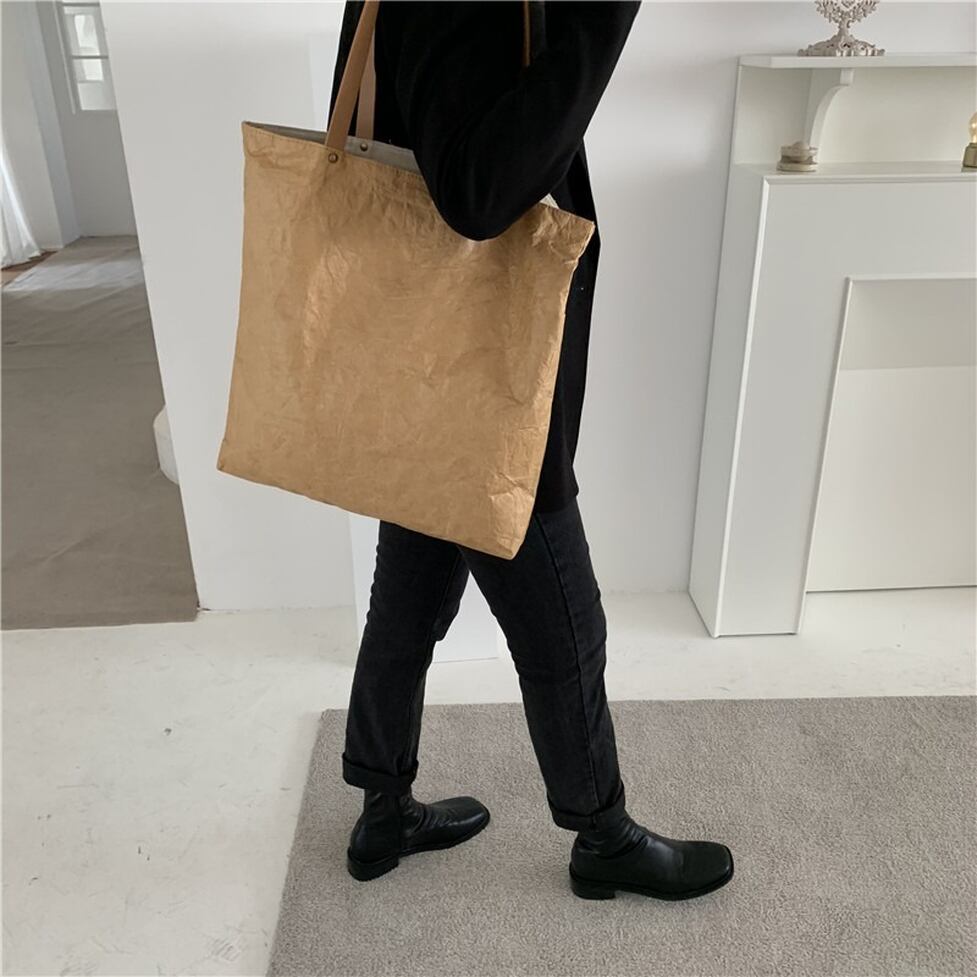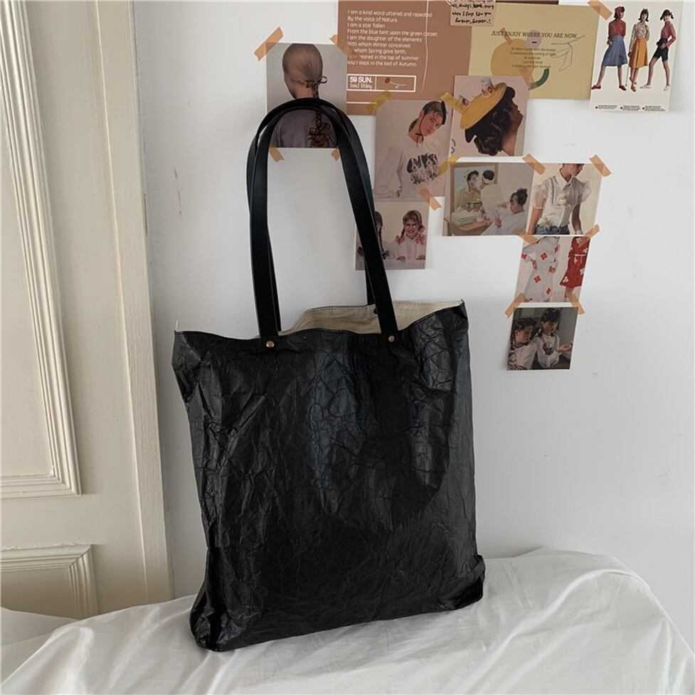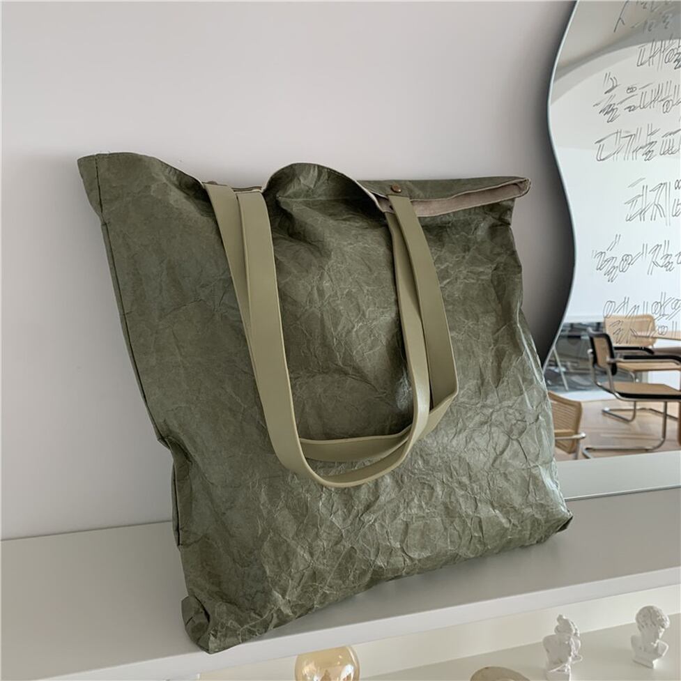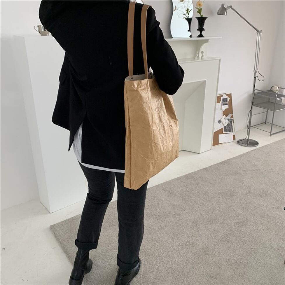 独特のシワ加工でペーパーバッグのような質感が特徴のトートバッグ。シンプルな形で実用性の高さも魅力。抱えてもさまになるし大胆で凛々しいルックスへ昇華