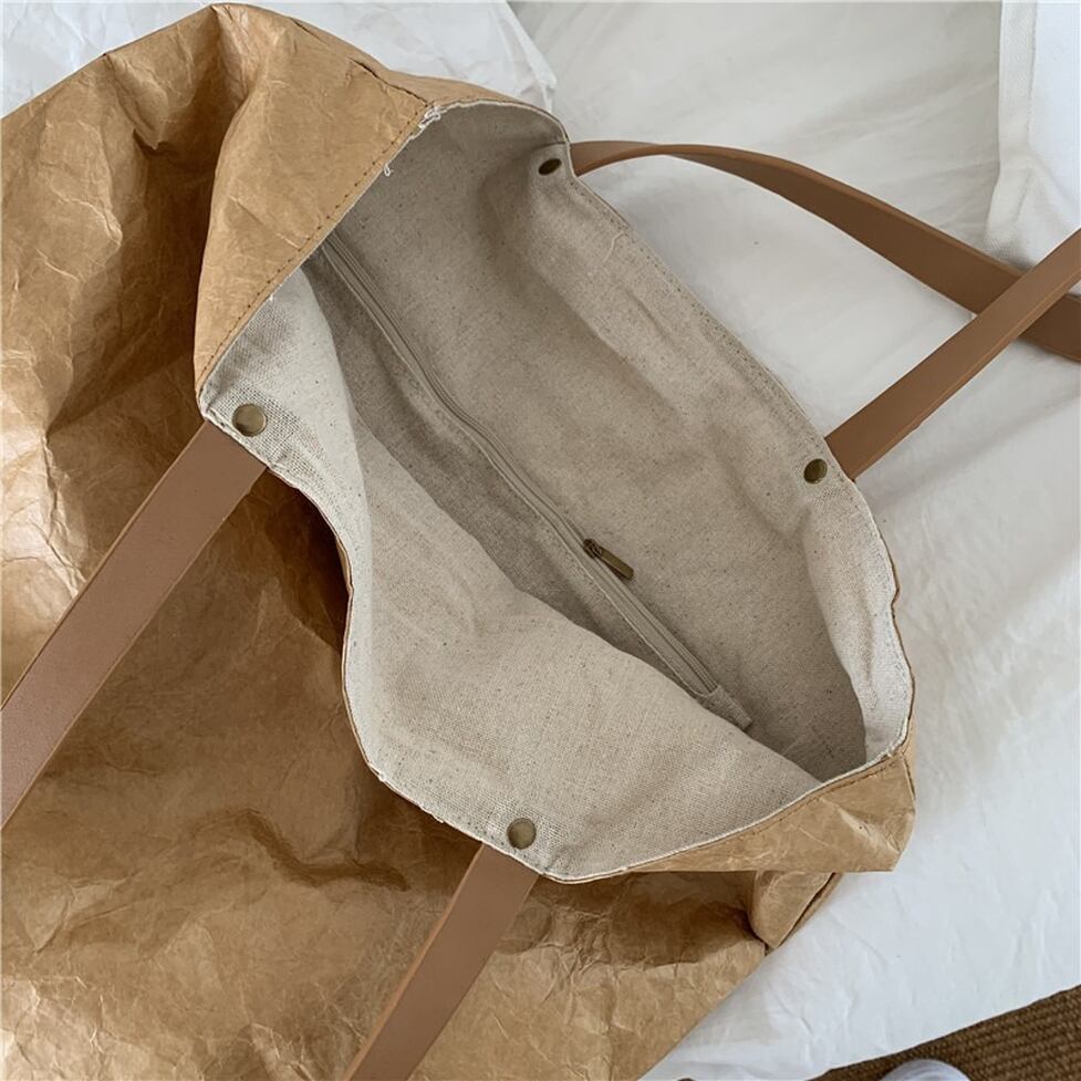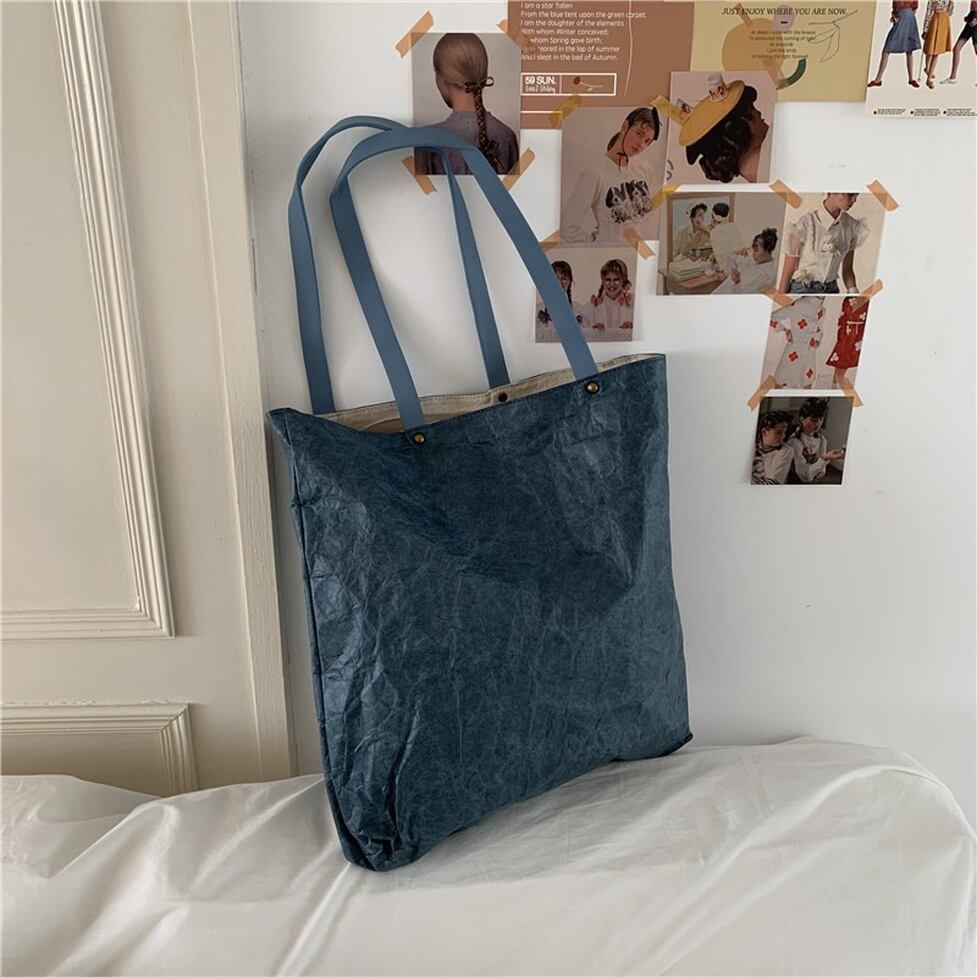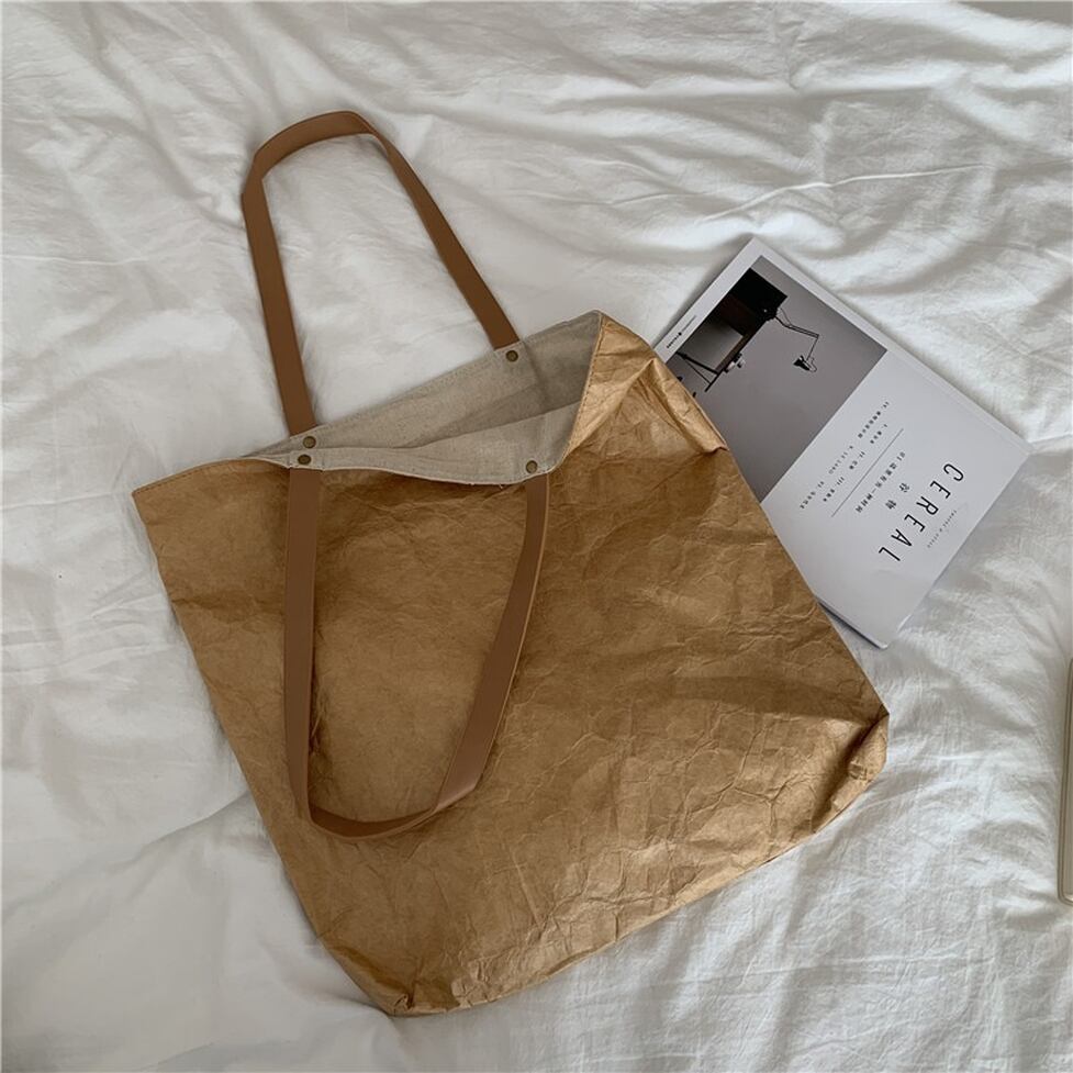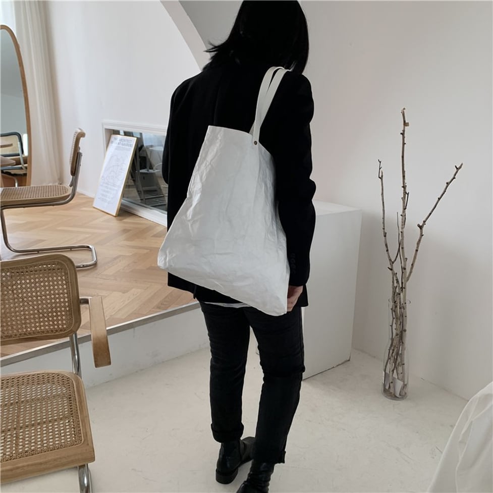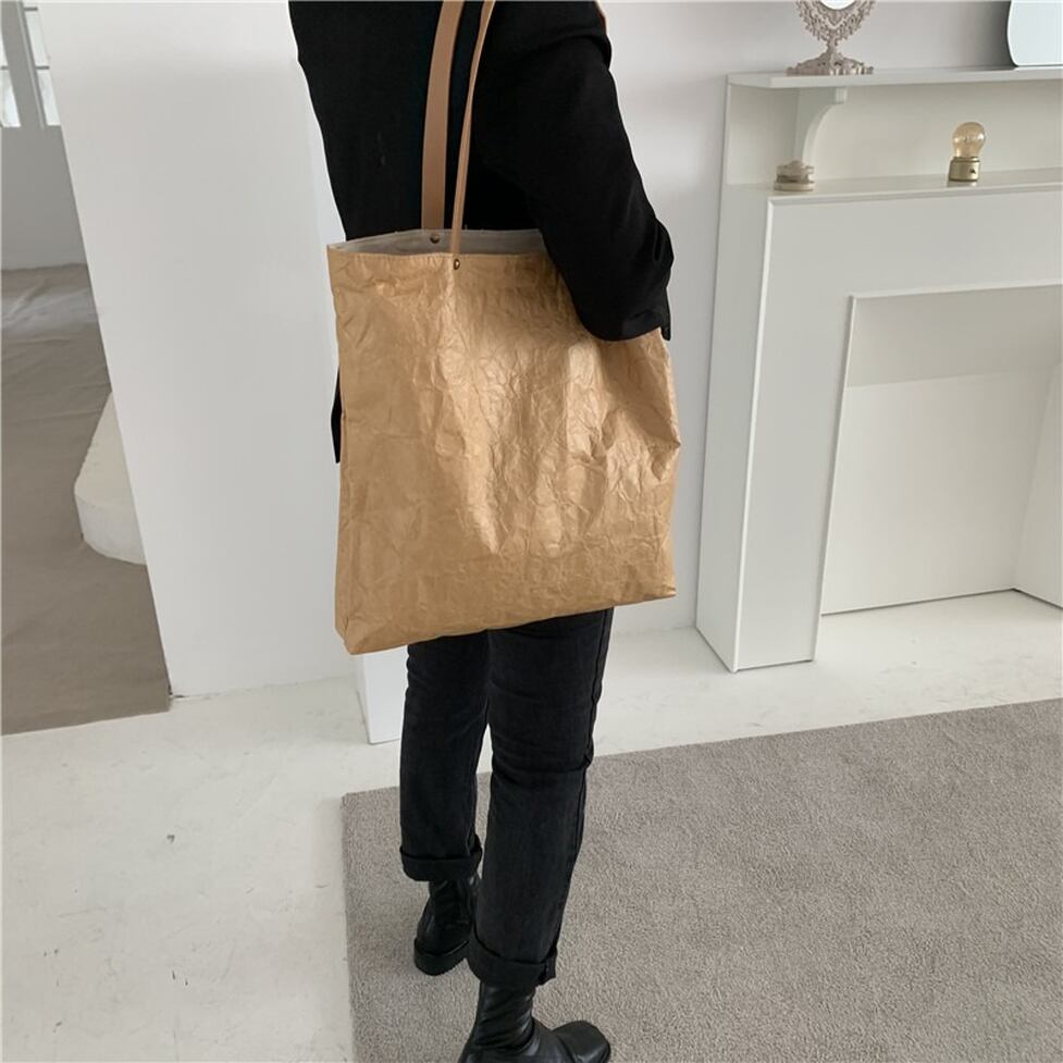 独特のシワ加工でペーパーバッグのような質感が特徴のトートバッグ。シンプルな形で実用性の高さも魅力。抱えてもさまになるし大胆で凛々しいルックスへ昇華