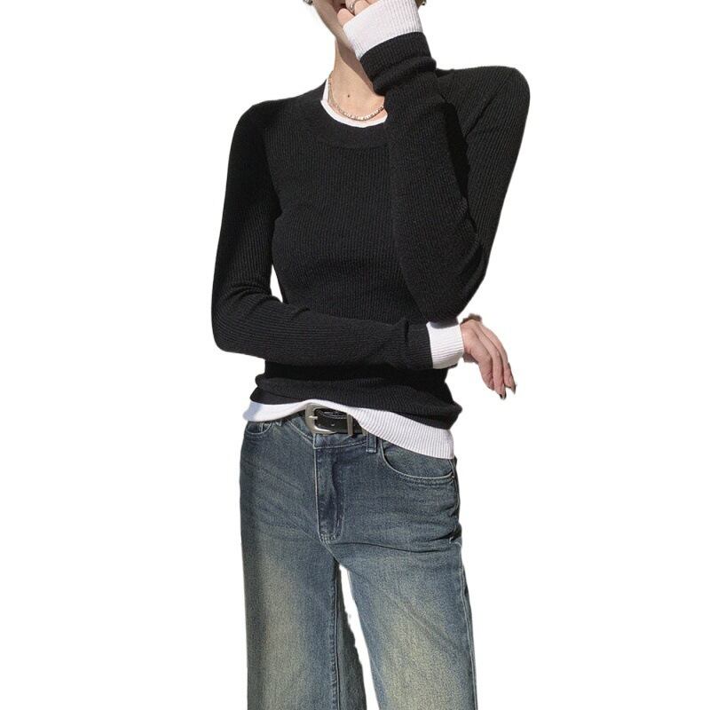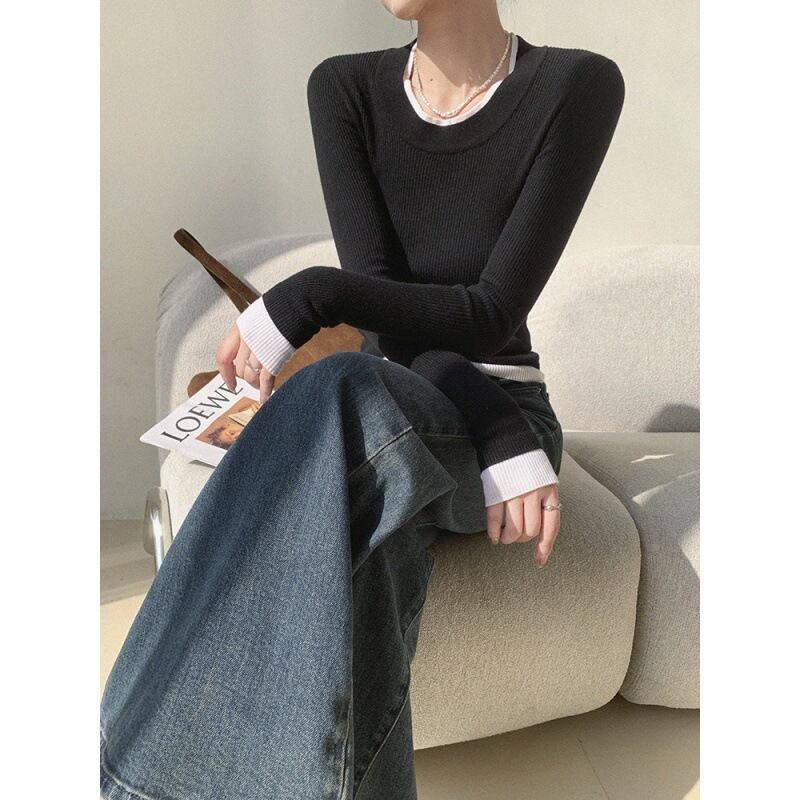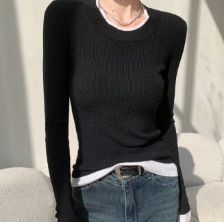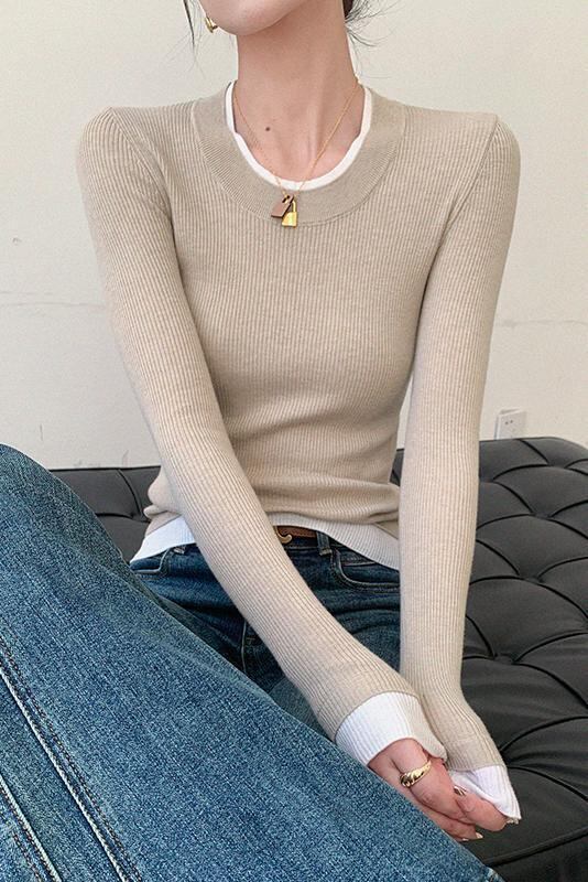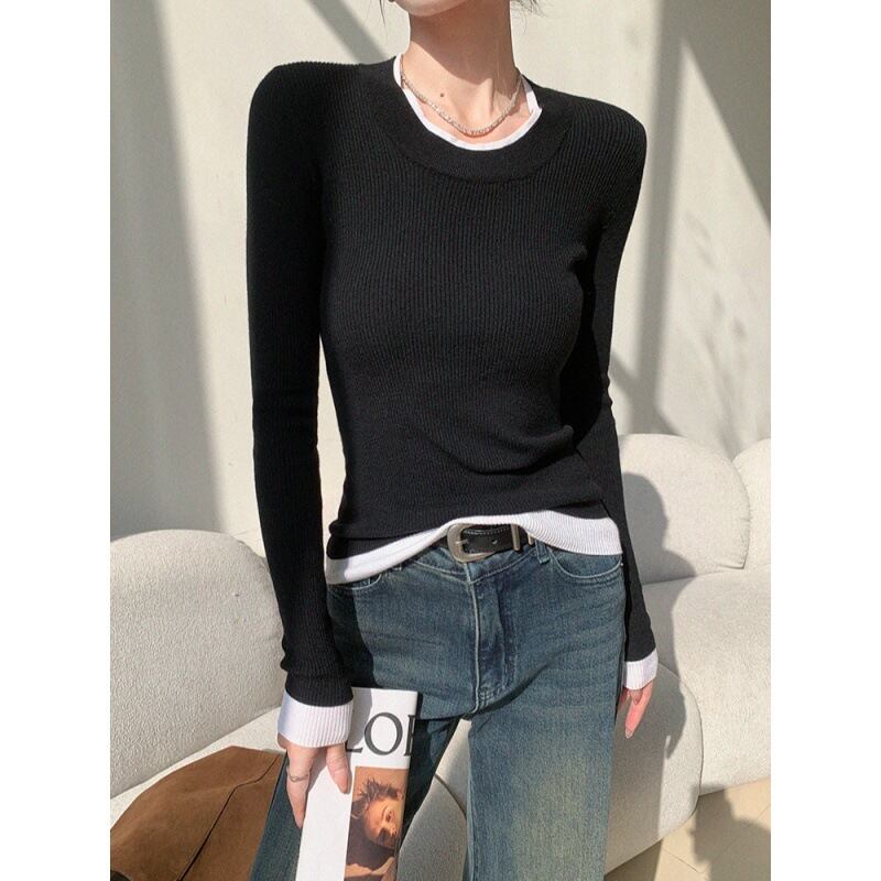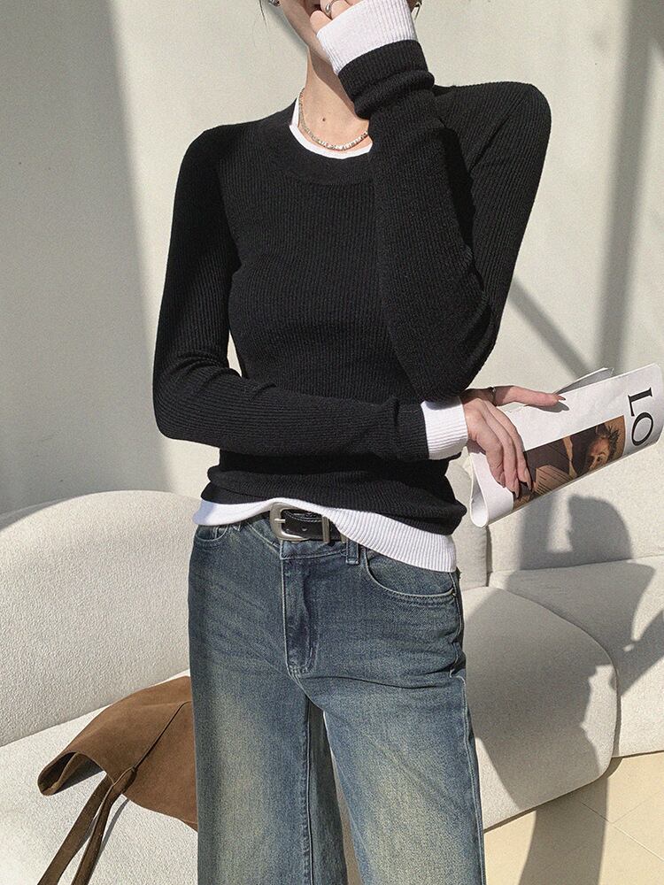 モノトーンの配色デザインが洗練された印象を与える、リブ編みニットトップス。