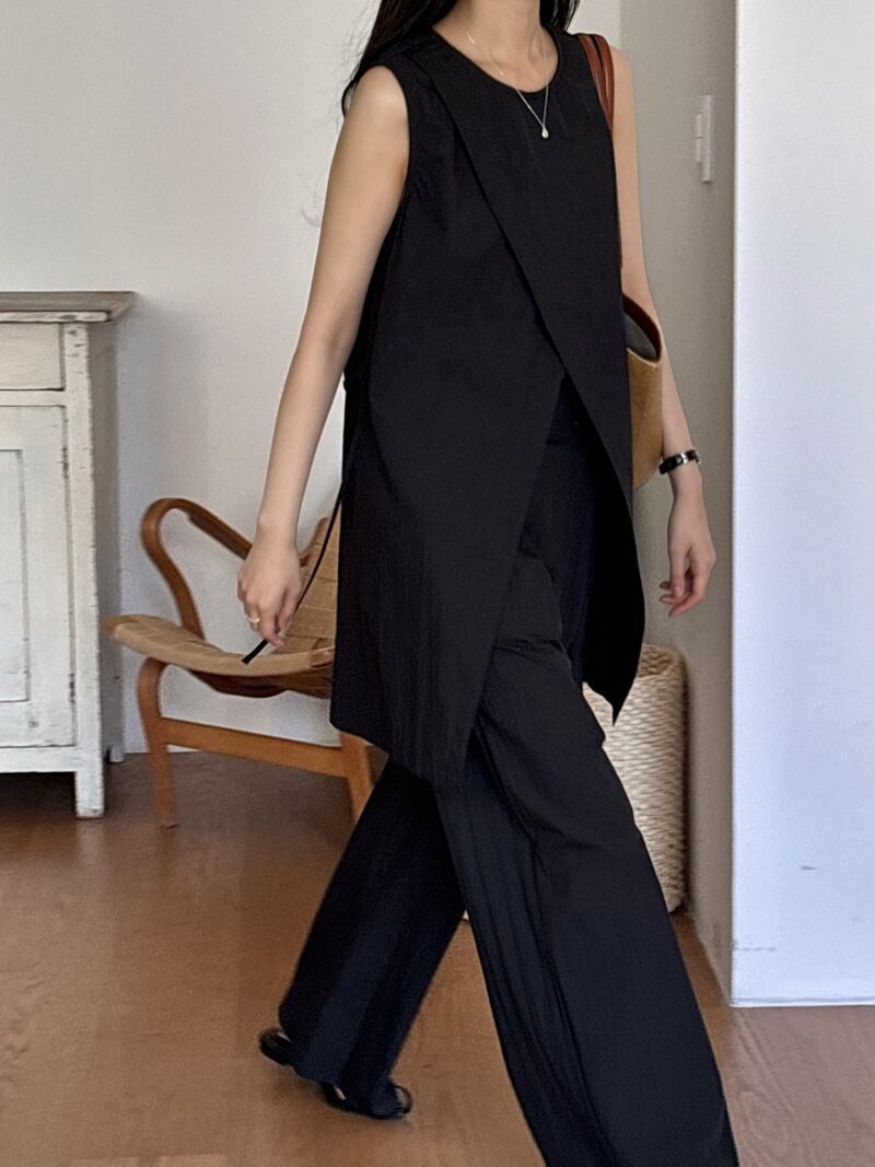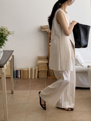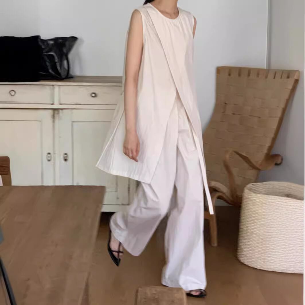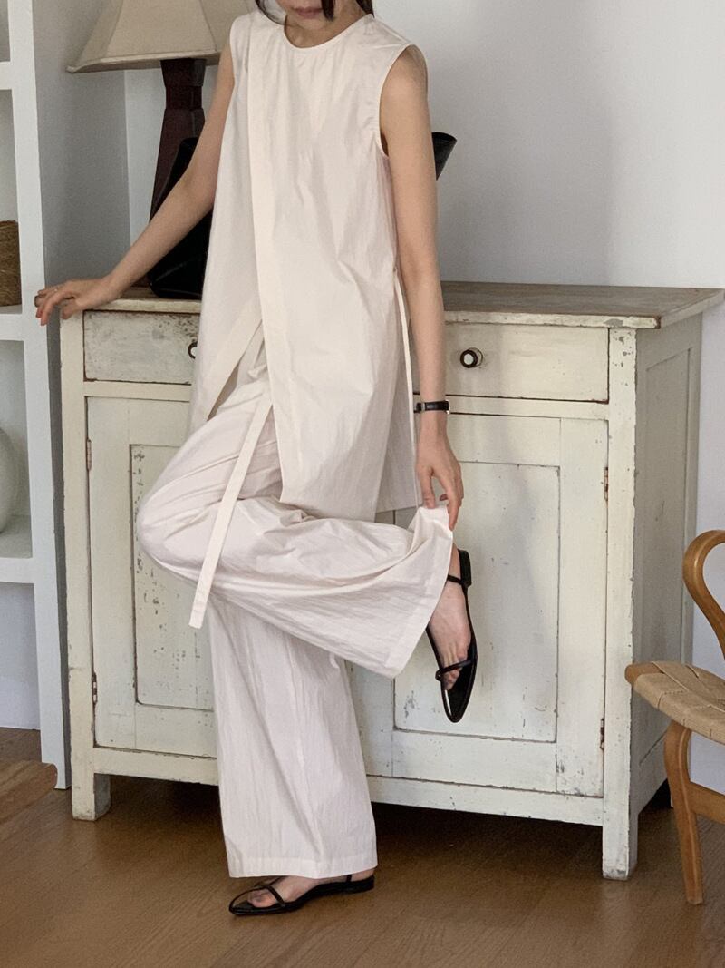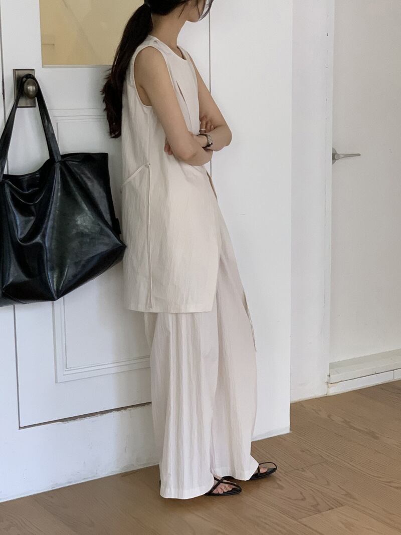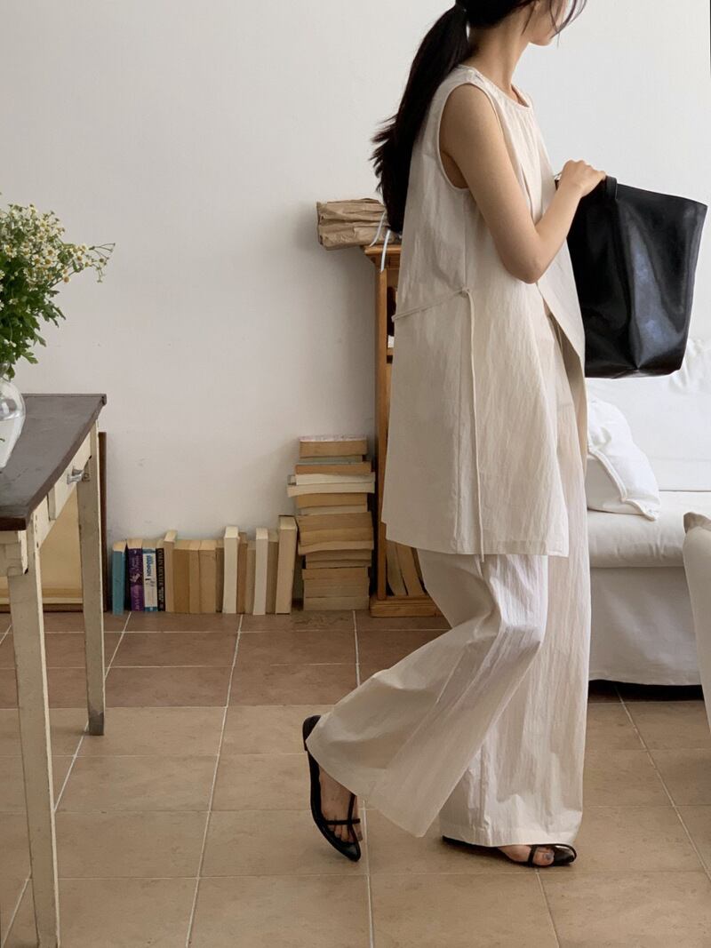 ナチュラルな風合いとモードなシルエットが融合した、ノースリーブチュニック×ワイドパンツのセットアップ。