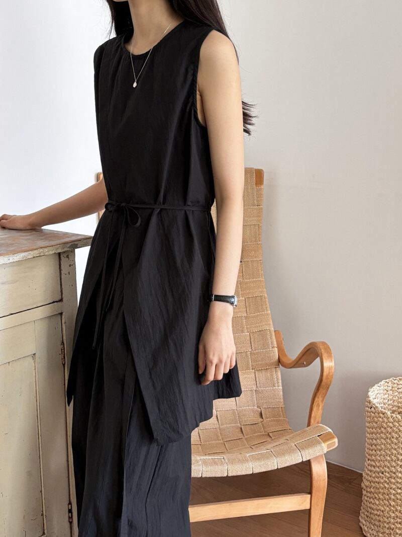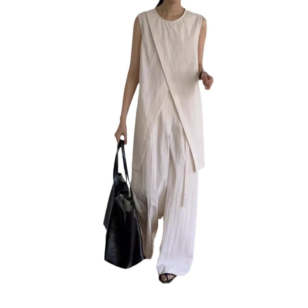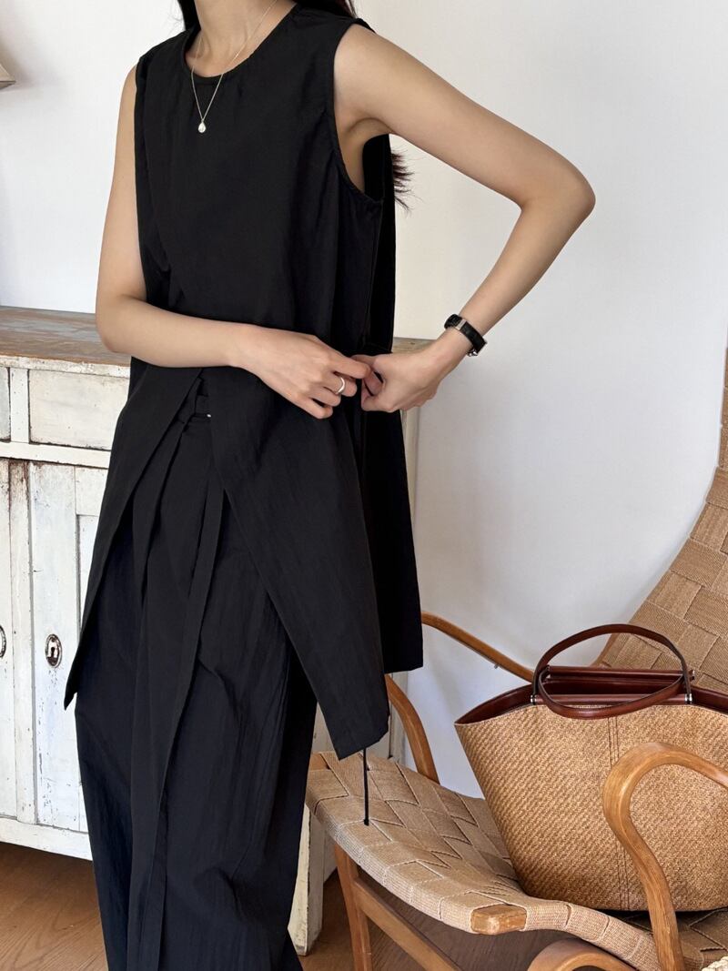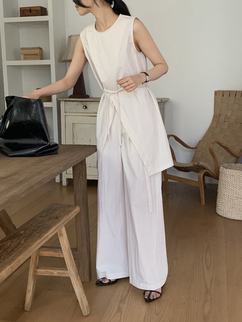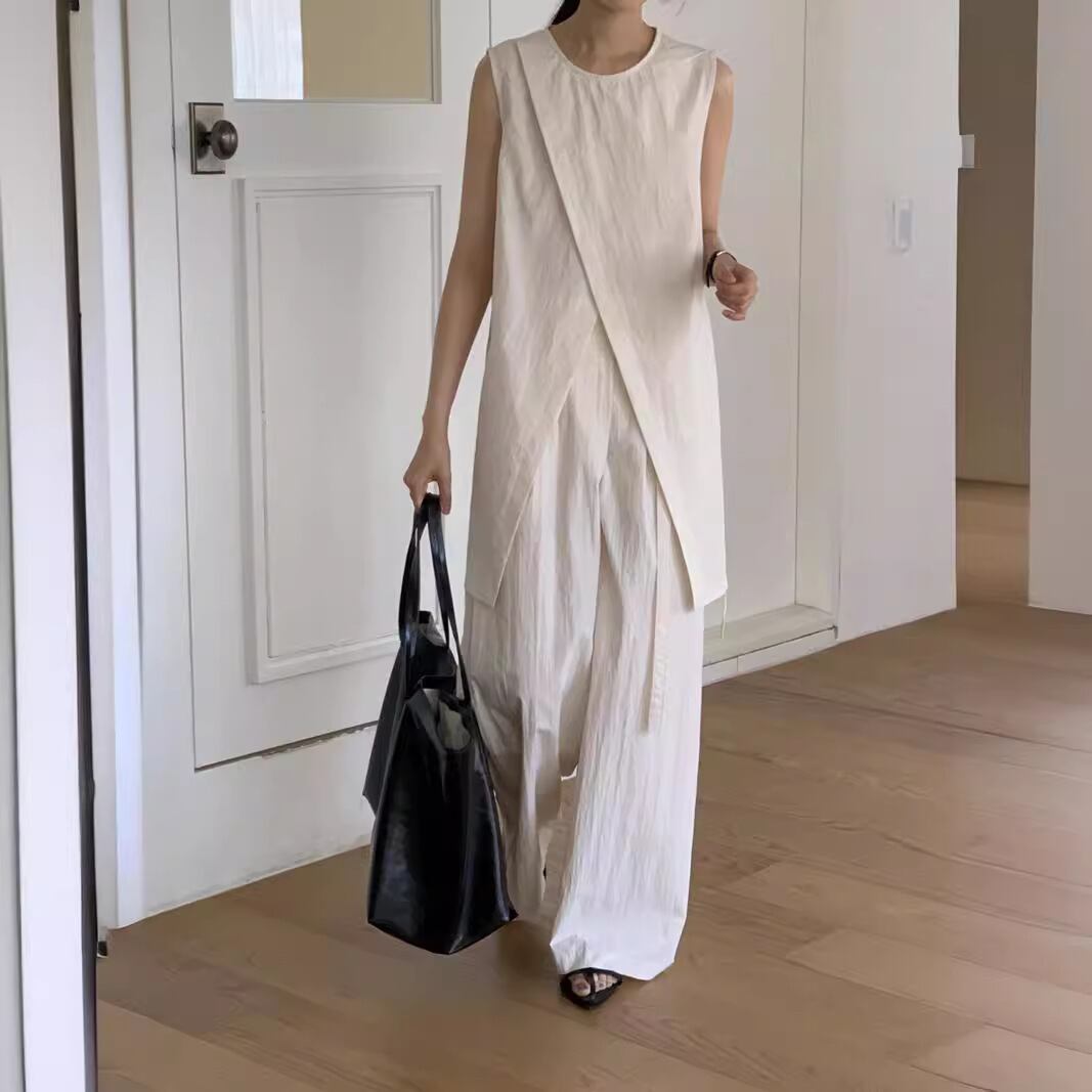 ナチュラルな風合いとモードなシルエットが融合した、ノースリーブチュニック×ワイドパンツのセットアップ。