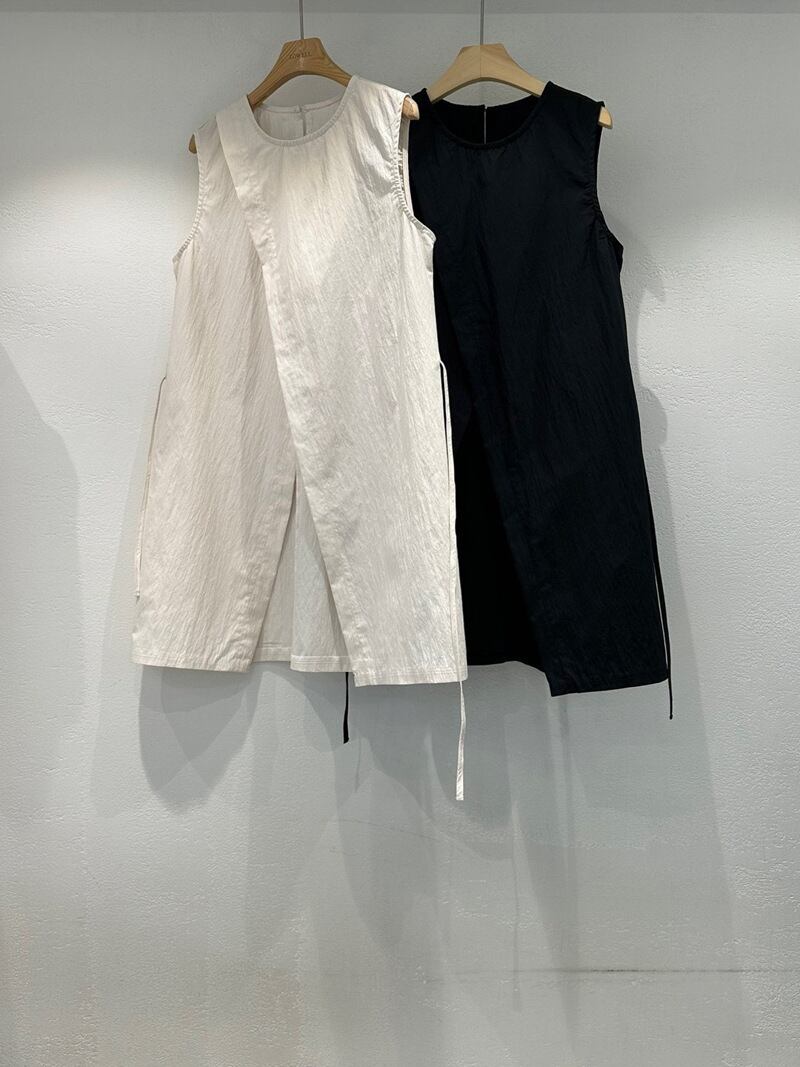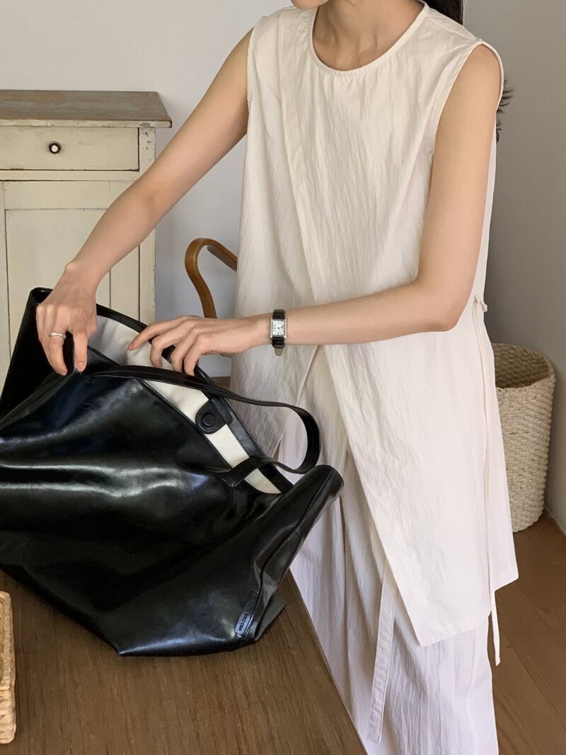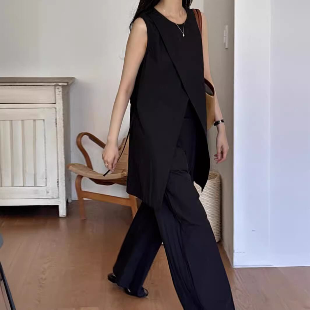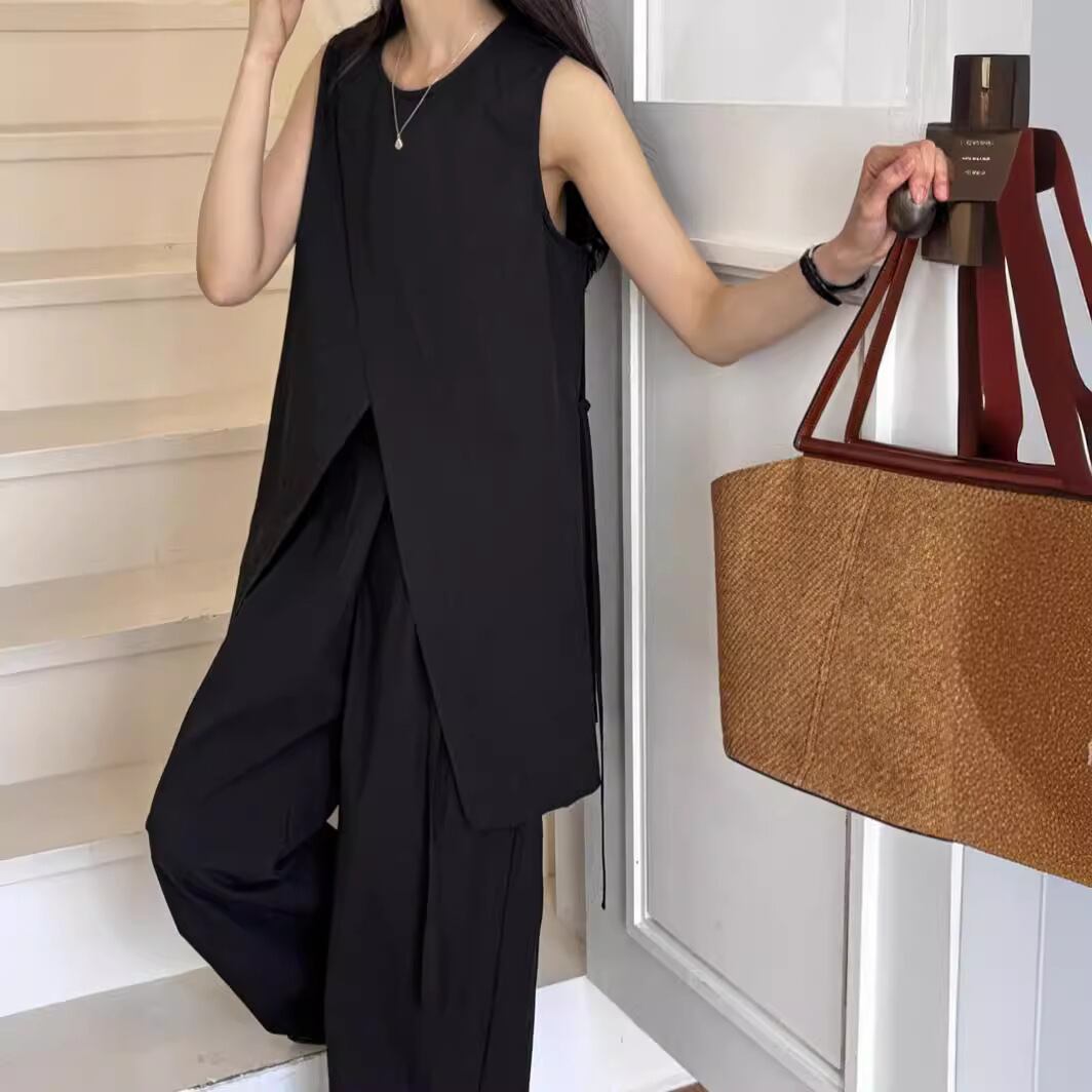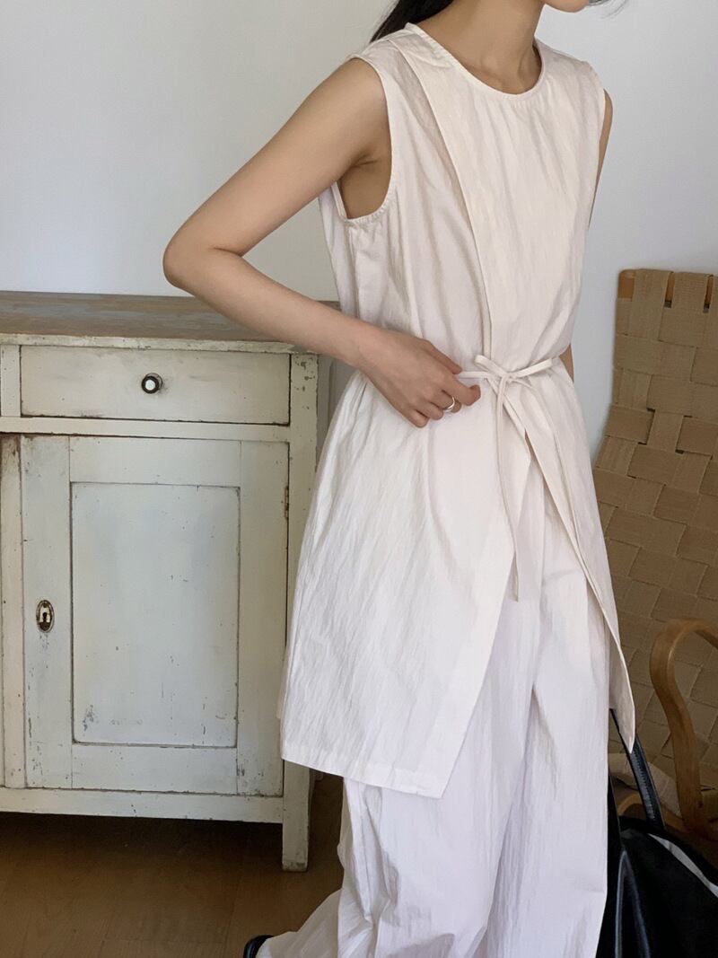 ナチュラルな風合いとモードなシルエットが融合した、ノースリーブチュニック×ワイドパンツのセットアップ。