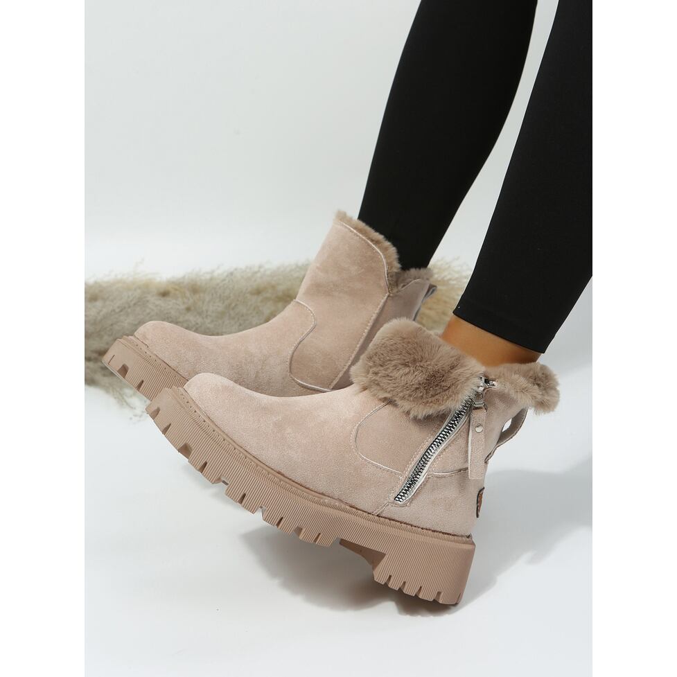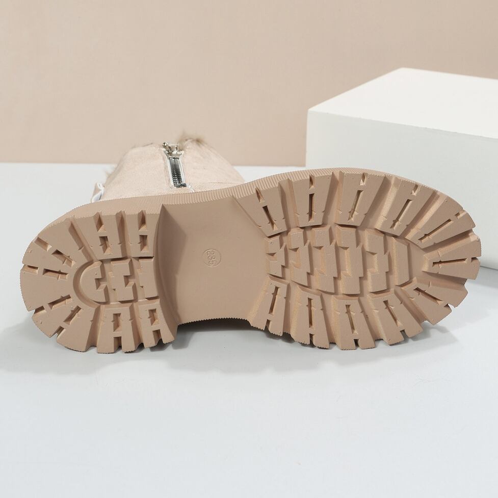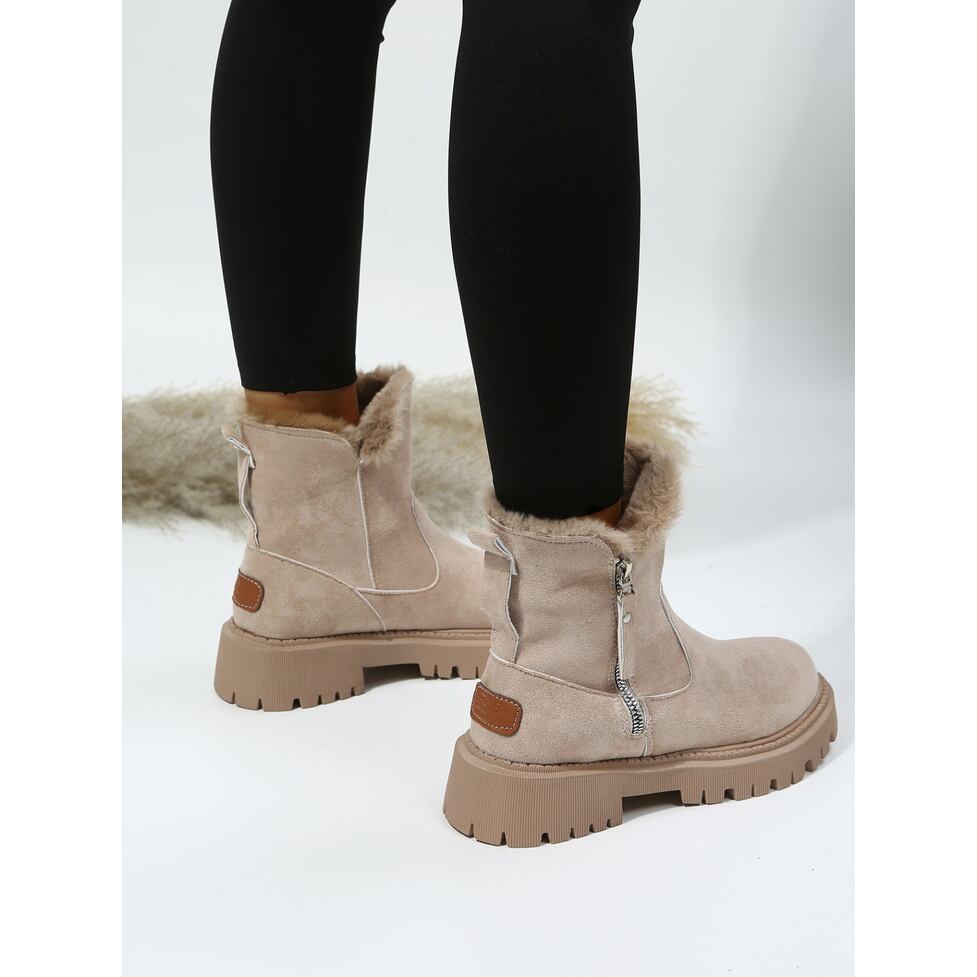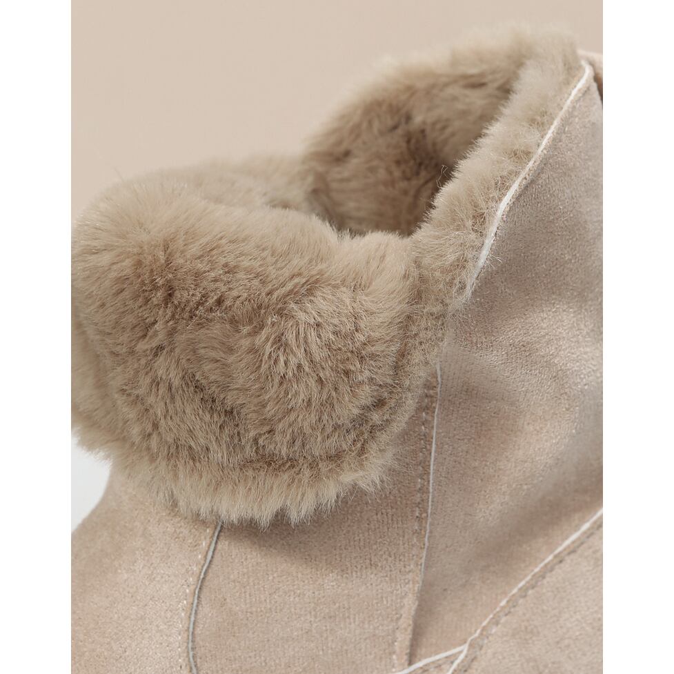 ボリュームのあるシルエットで存在感のあるスエード調のショートブーツ。履き口のボアが品の良さをプラス。フラットだから幅広いコーデのスパイスにおすすめ。モードな足元を飾ってくれます