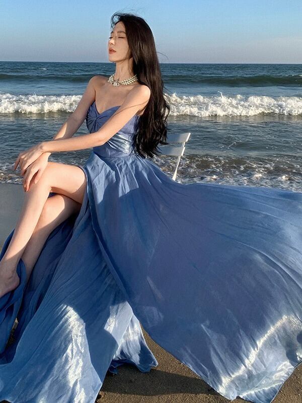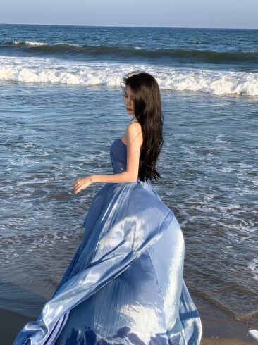 控えめながら存在感のあるブルーが、上品な女性らしさを引き立て、特別な日を格上げ。