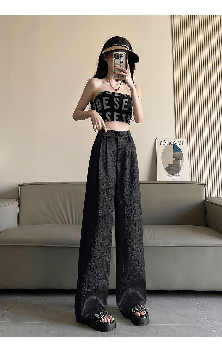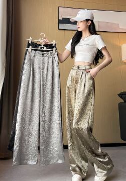 ハイウエスト&ワイドシルエットが脚長効果を演出し、モードな雰囲気を引き立てます。
