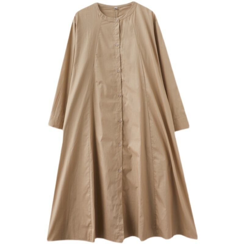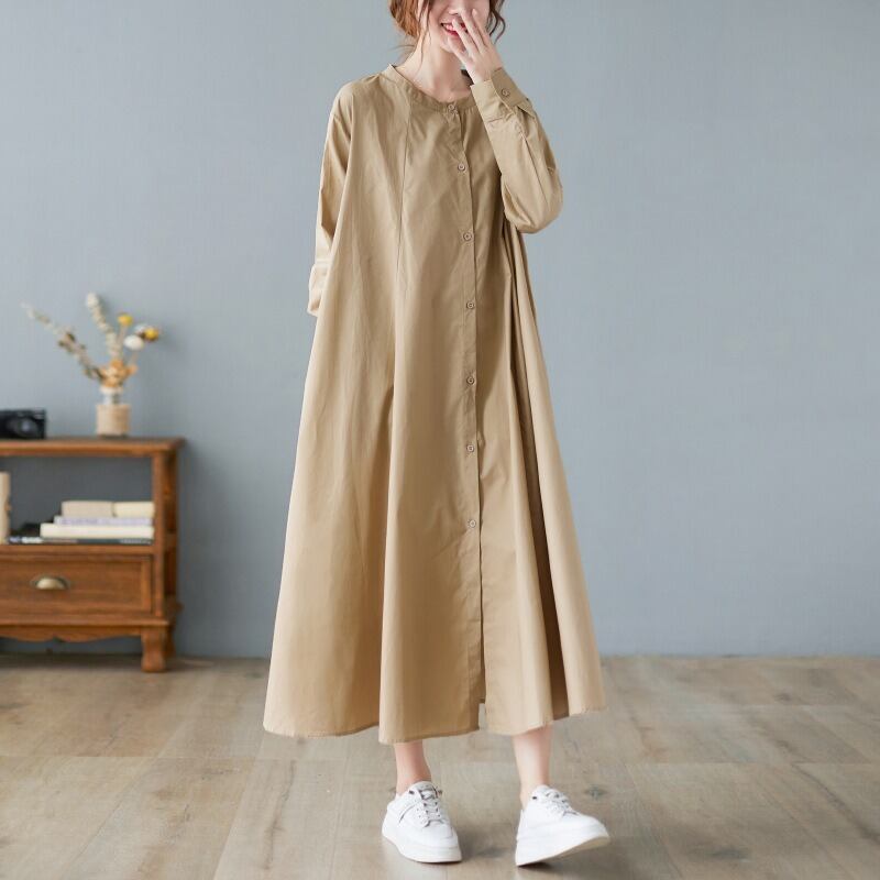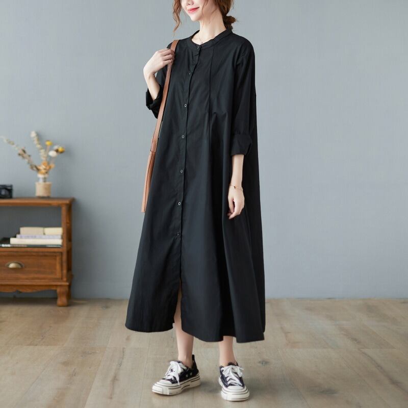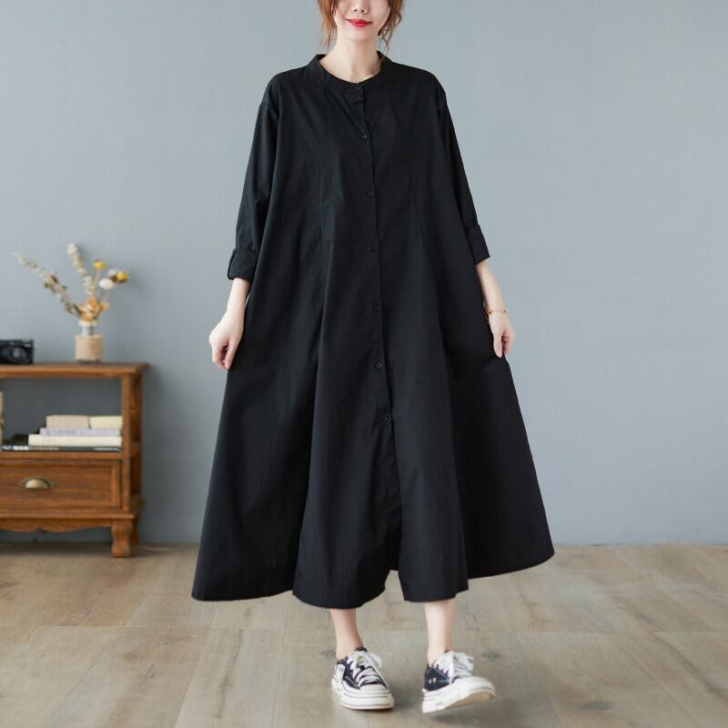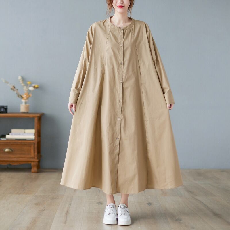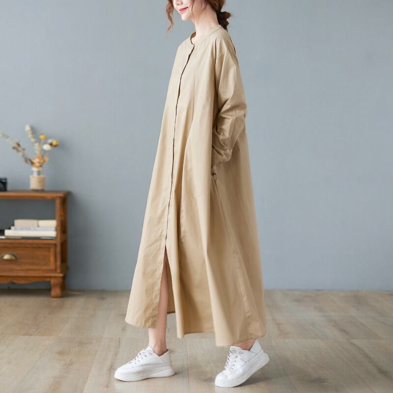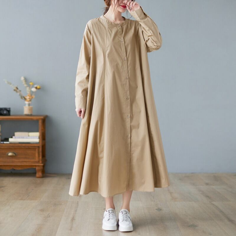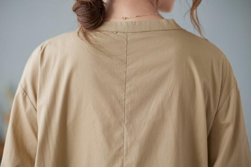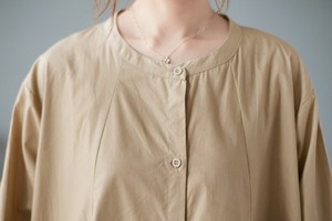 襟なしのクルーネックとワイドな袖は、カジュアルな、そしてリラックスした着心地を実現。体型カバー効果もあり、美脚効果が期待できる一着です。