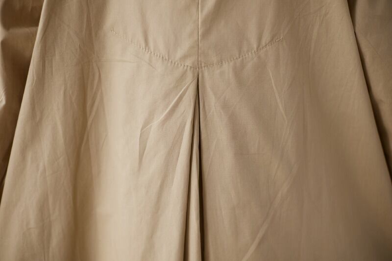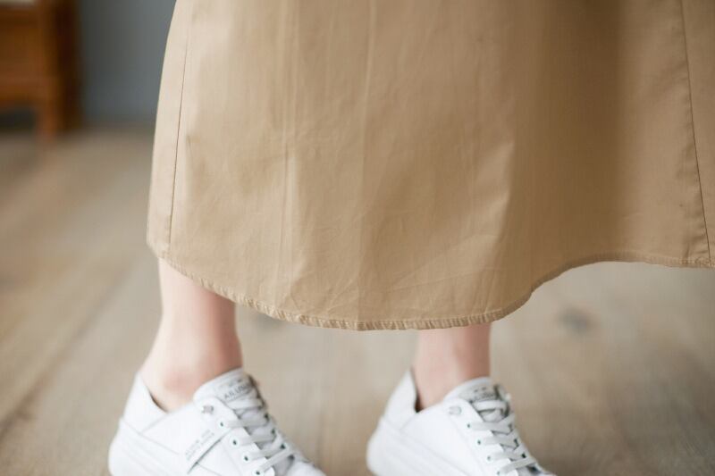 膝下のロング丈とフレアシルエットが大人可愛い印象を与え、クールで上品な雰囲気を演出します。