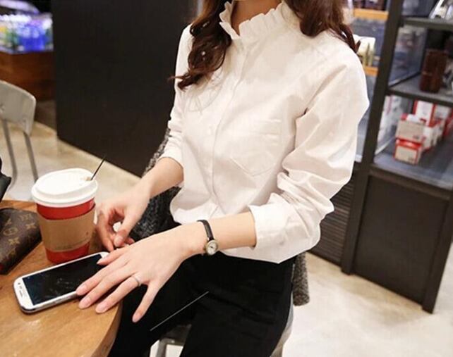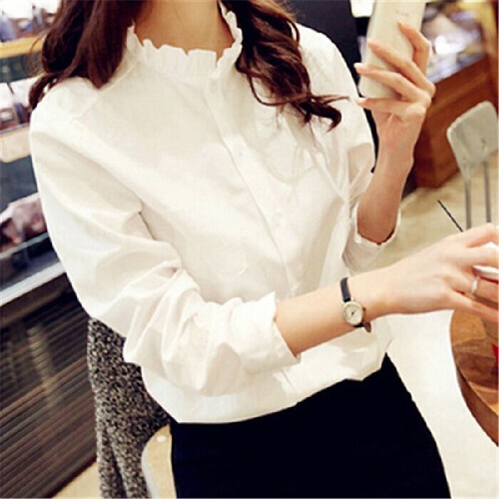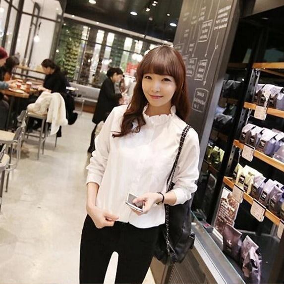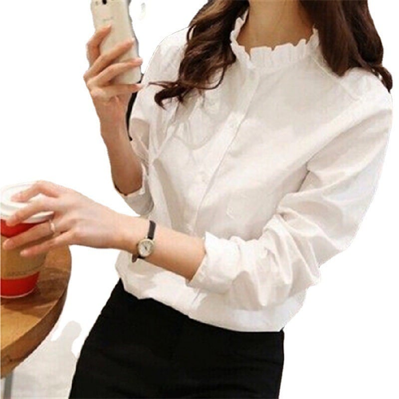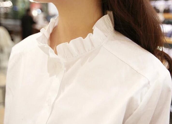 襟なしのハイネックデザインとフリルアクセントが上品さを引き立て、シンプルでありながら洗練された印象を与えます。