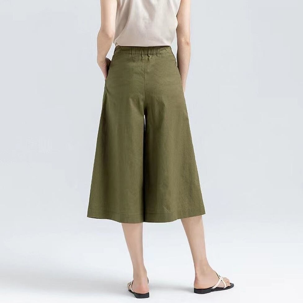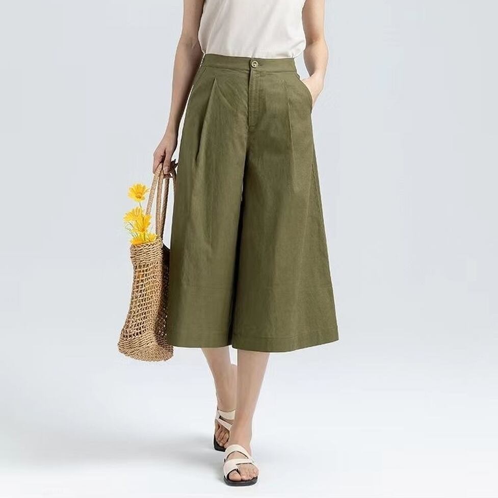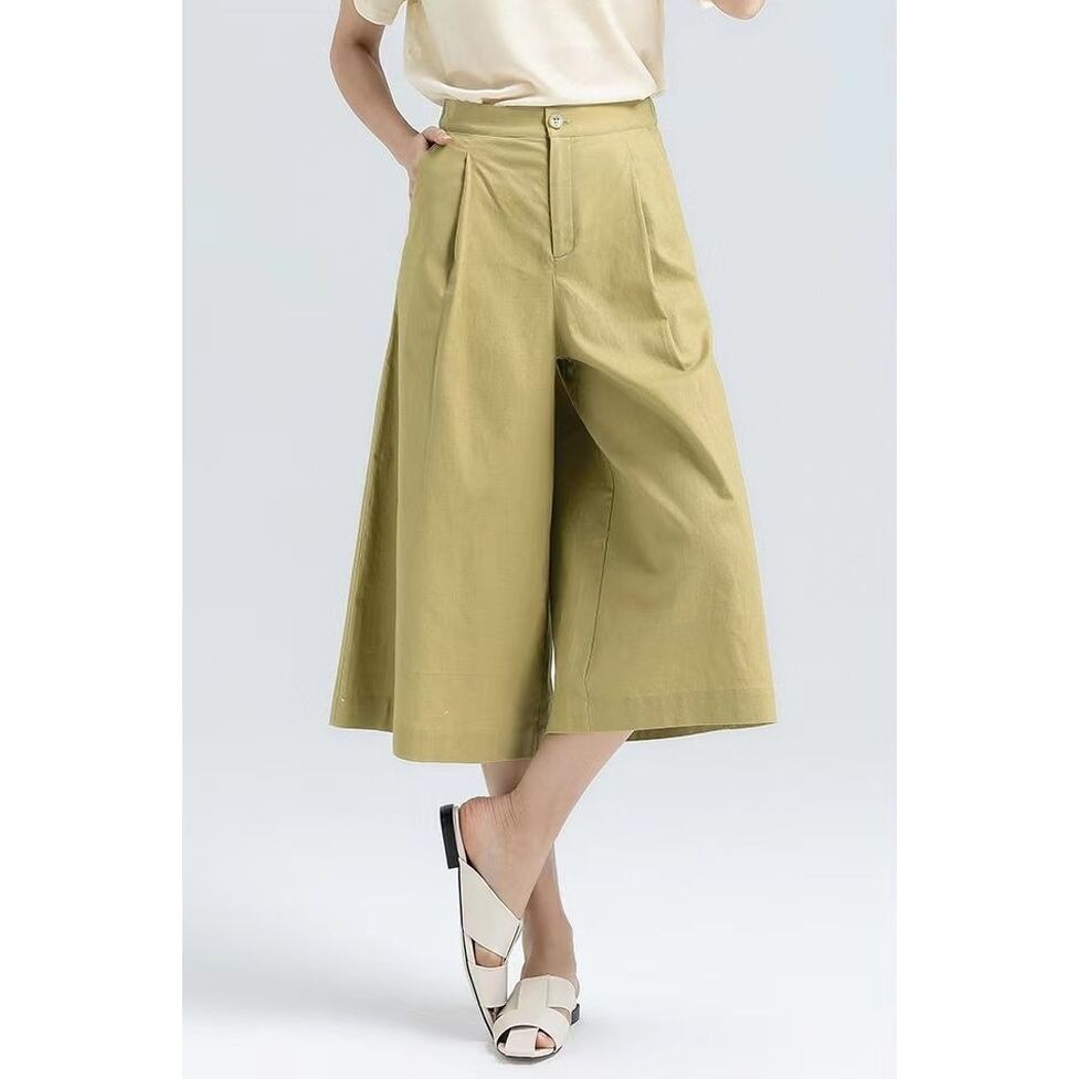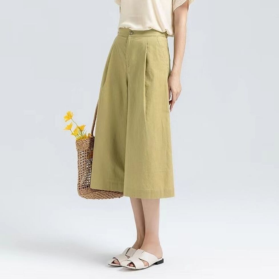 ツータック入りのナチュラル素材のフレアパンツです。ひざ下の丈感でヘルシーに着られる1枚。美しいAラインで適度なきちんと感を忘れずに演出。涼し気なコーデが完成します