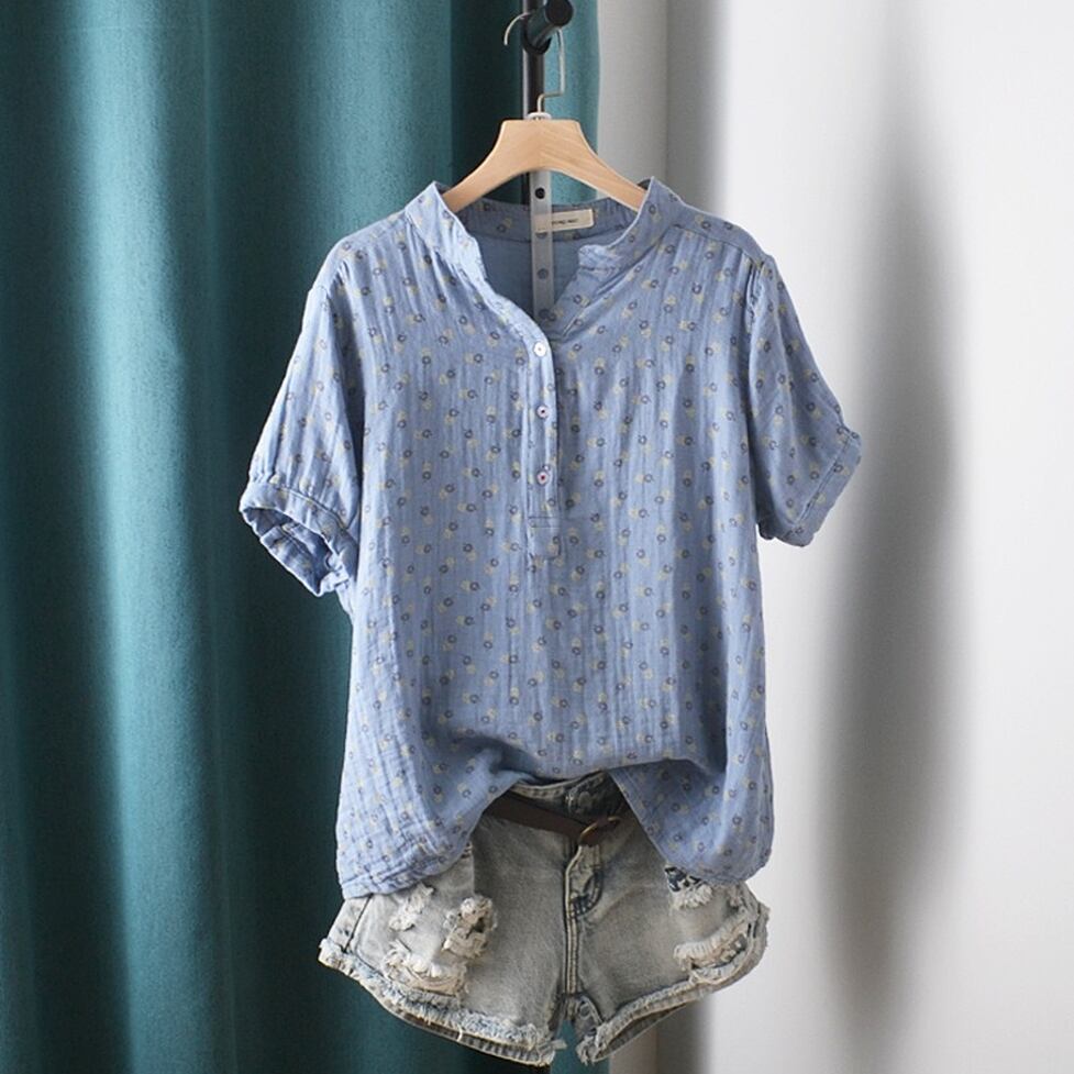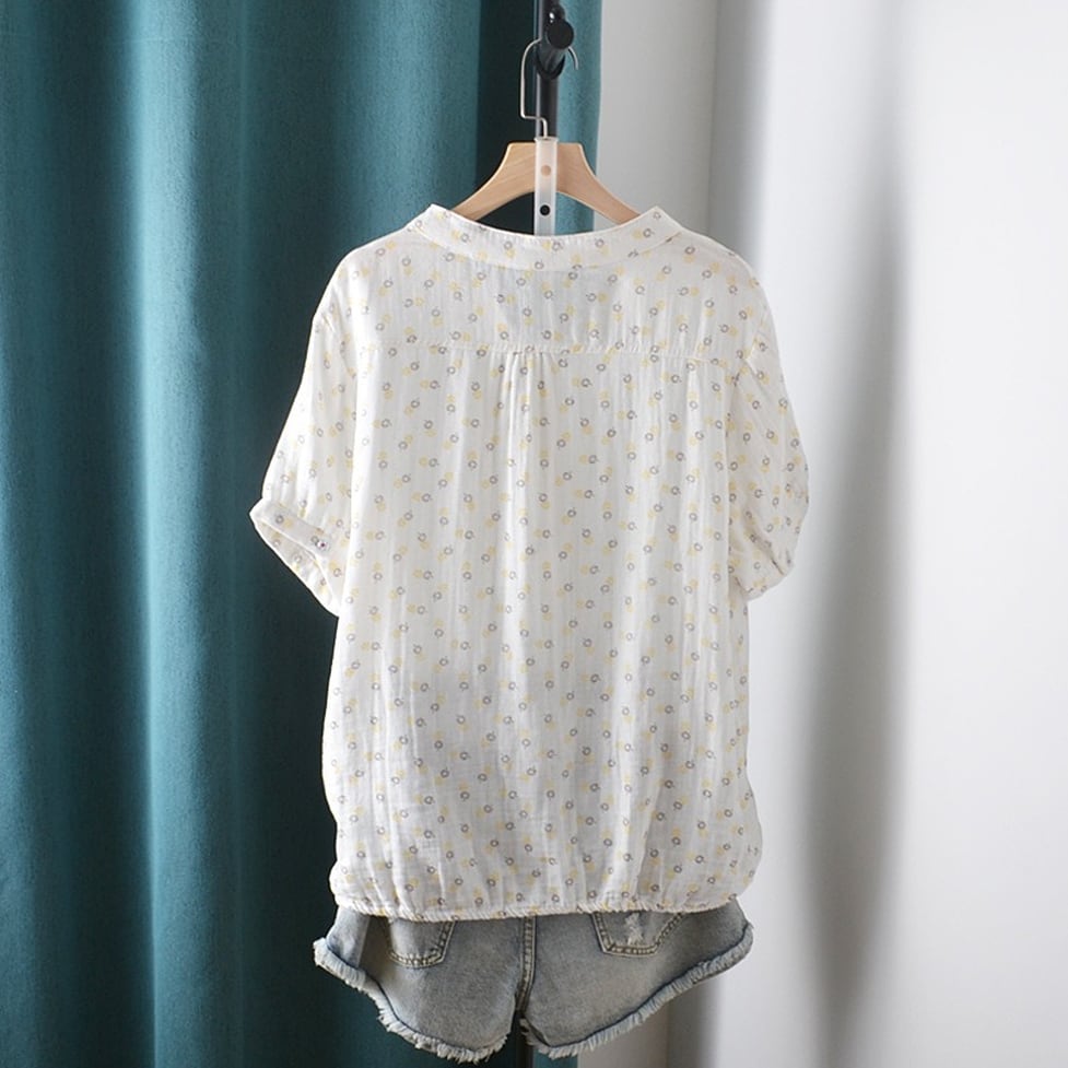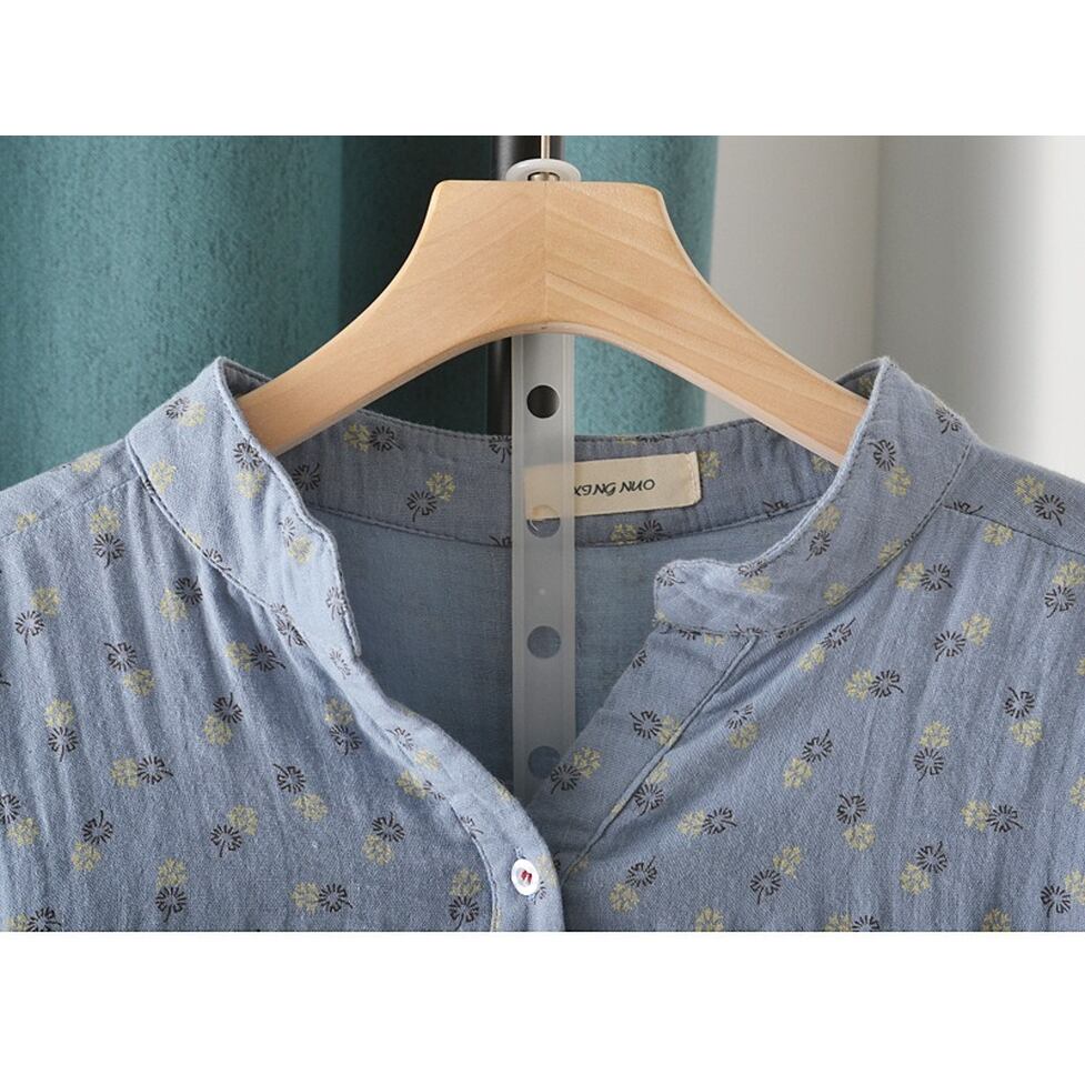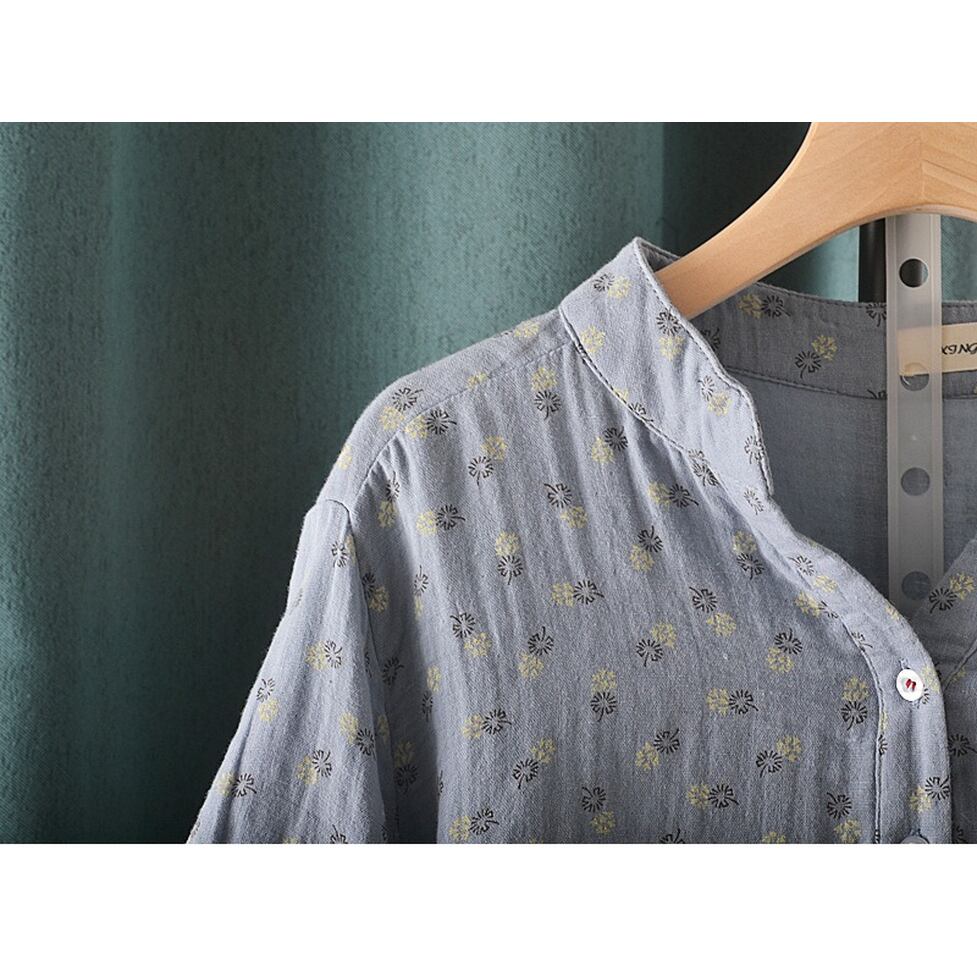 ナチュラル素材のスキッパーシャツブラウス。レトロな小花柄が可愛い1着。気楽に着られて着回し力も高くなります。すっきりしたシルエットに縦ラインのシワ加工がさりげないスタイルアップに効くシルエット