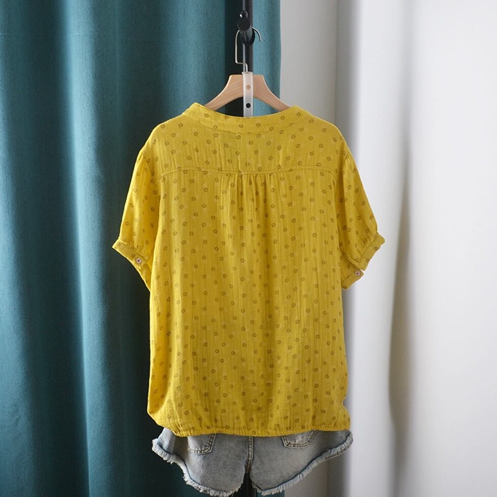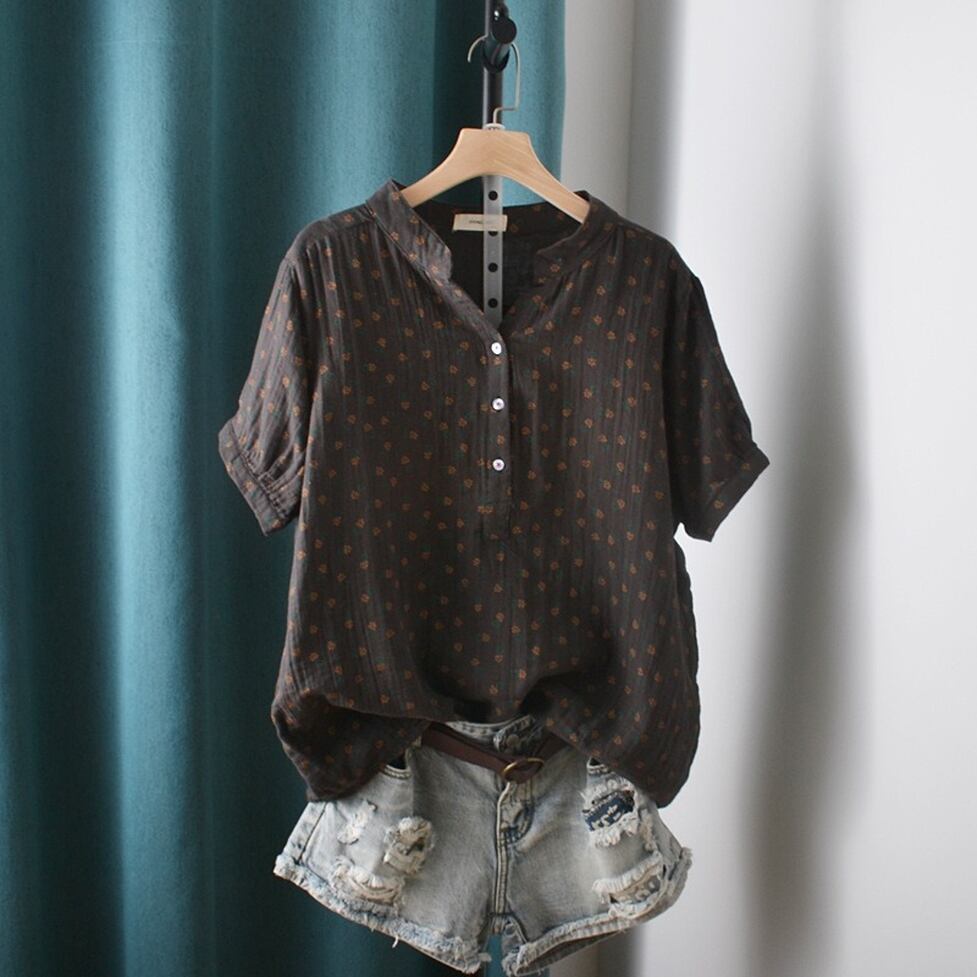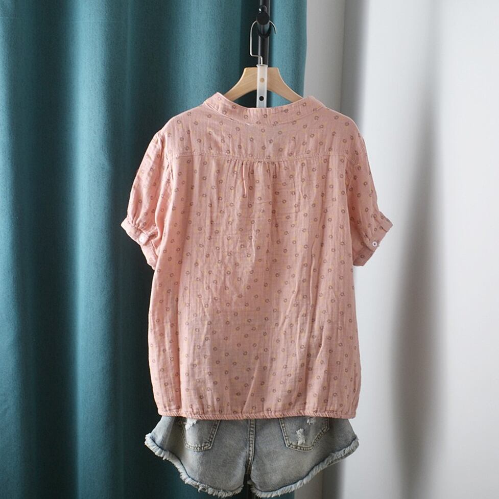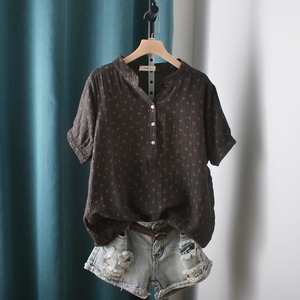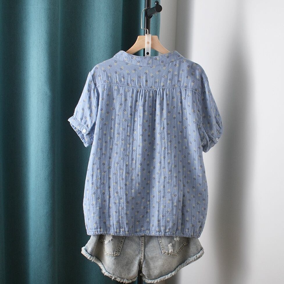ナチュラル素材のスキッパーシャツブラウス。レトロな小花柄が可愛い1着。気楽に着られて着回し力も高くなります。すっきりしたシルエットに縦ラインのシワ加工がさりげないスタイルアップに効くシルエット
