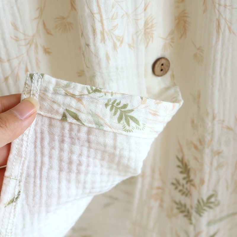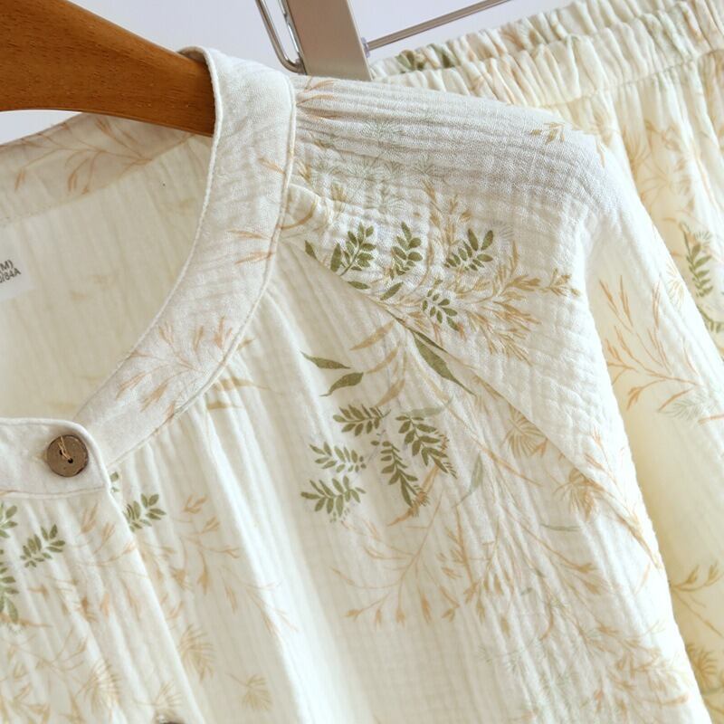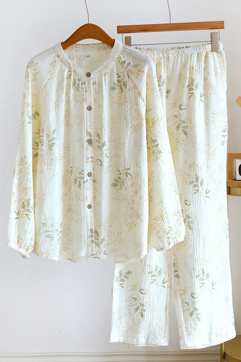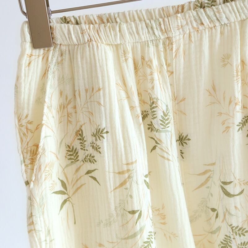 シンプルでありながら、女性らしさを引き立てるボタニカルデザインのルームウェアです。ゆったりとしたシルエットの前開き長袖カーディガンとストレートパンツがセットになっており、リラックスタイムにぴったり。薄手のコットンガーゼ素材を使用しているため、通気性が良く、春から秋にかけて快適にお楽しみいただけます。着心地は抜群で、袖口ゴムのデザインも嬉しいポイントです。ちょっとしたお出かけにも重宝する、ナチュラルでおしゃれなアイテムです。