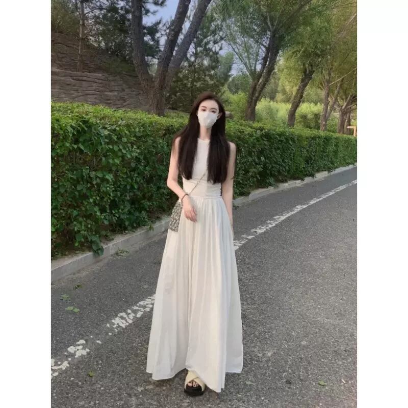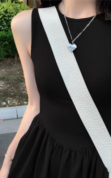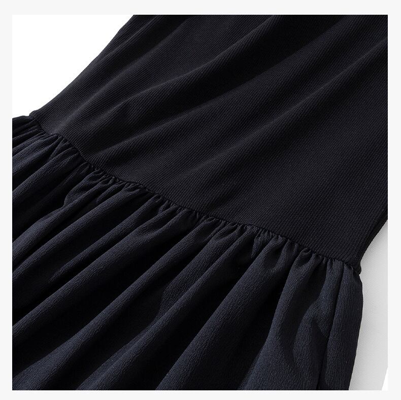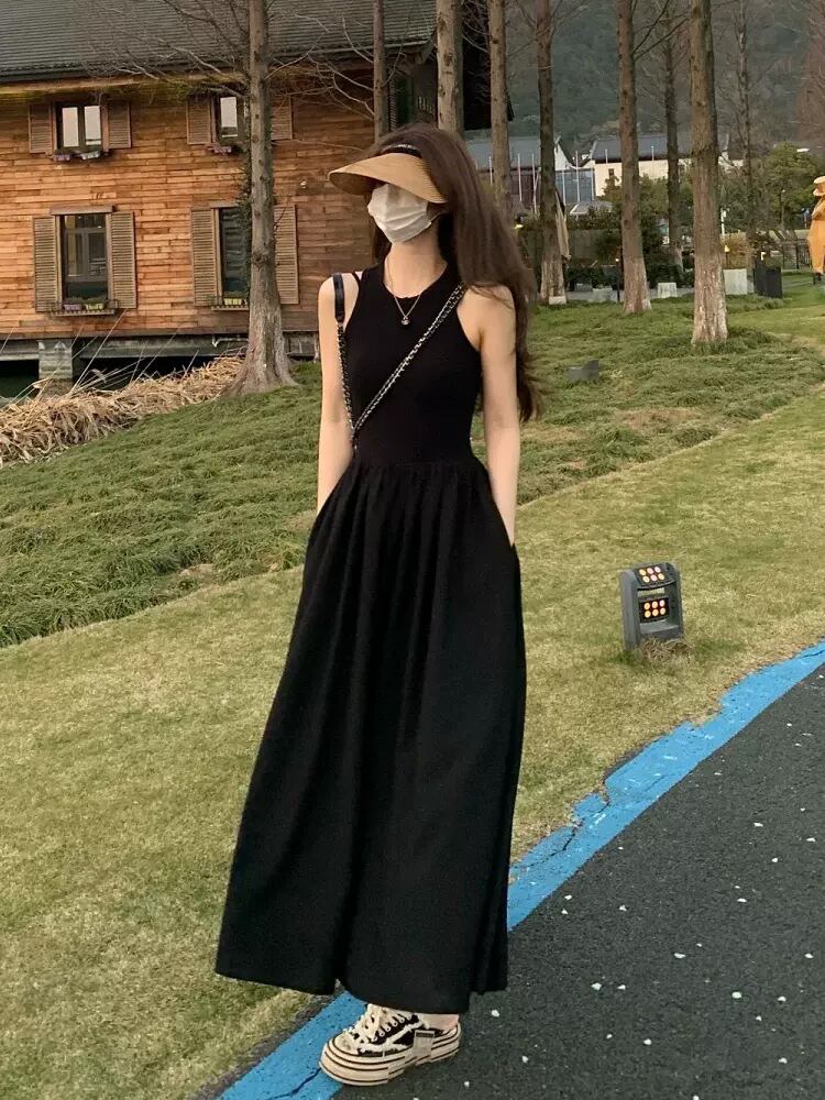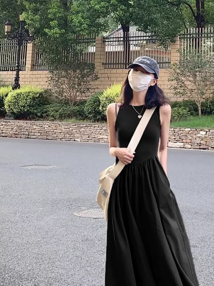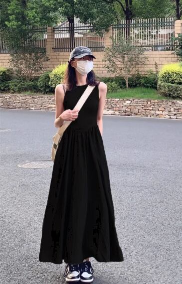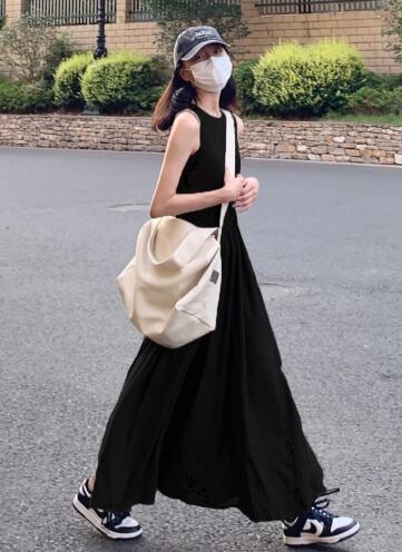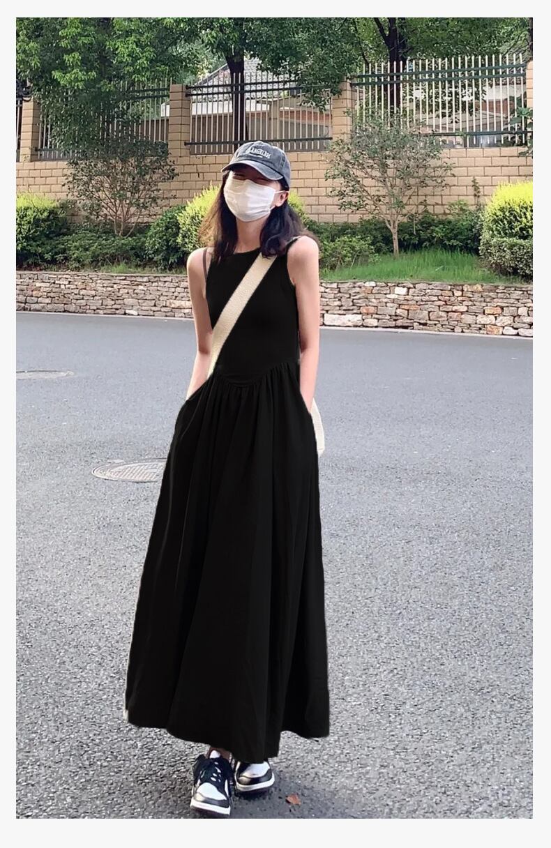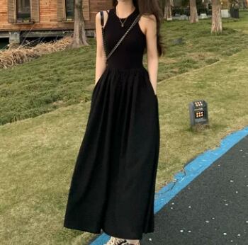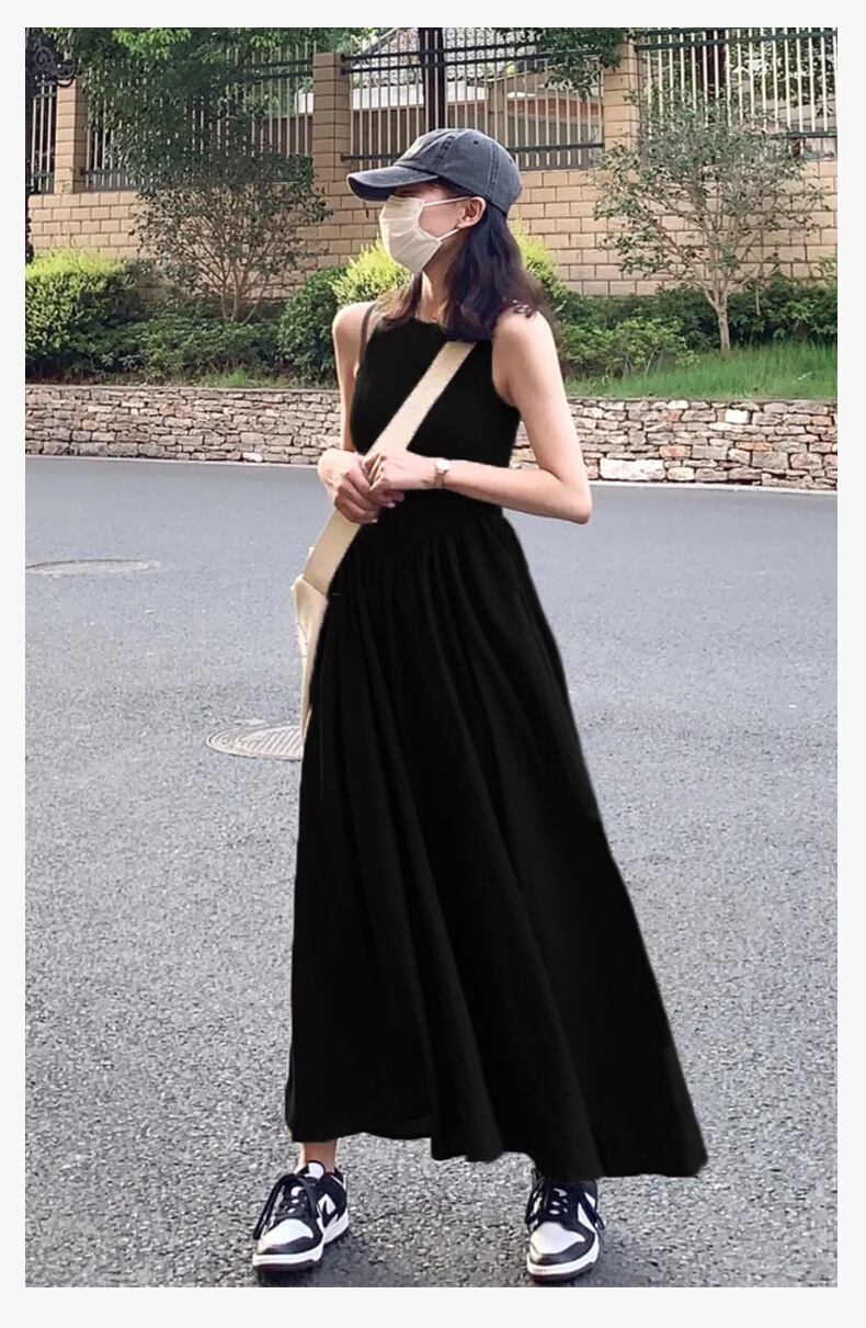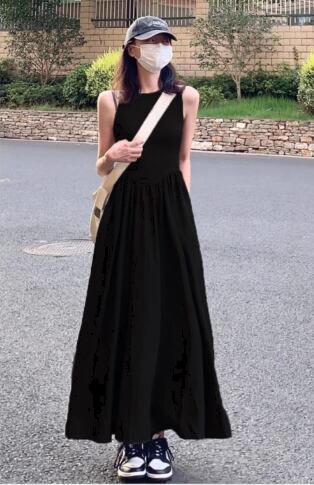 すとんと落ちるシルエットが美しい、ノースリーブのブラックロングワンピース。