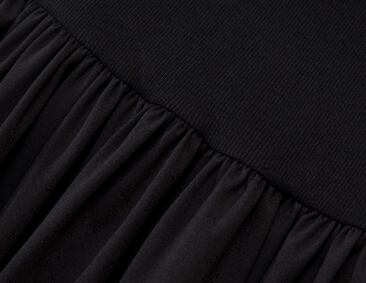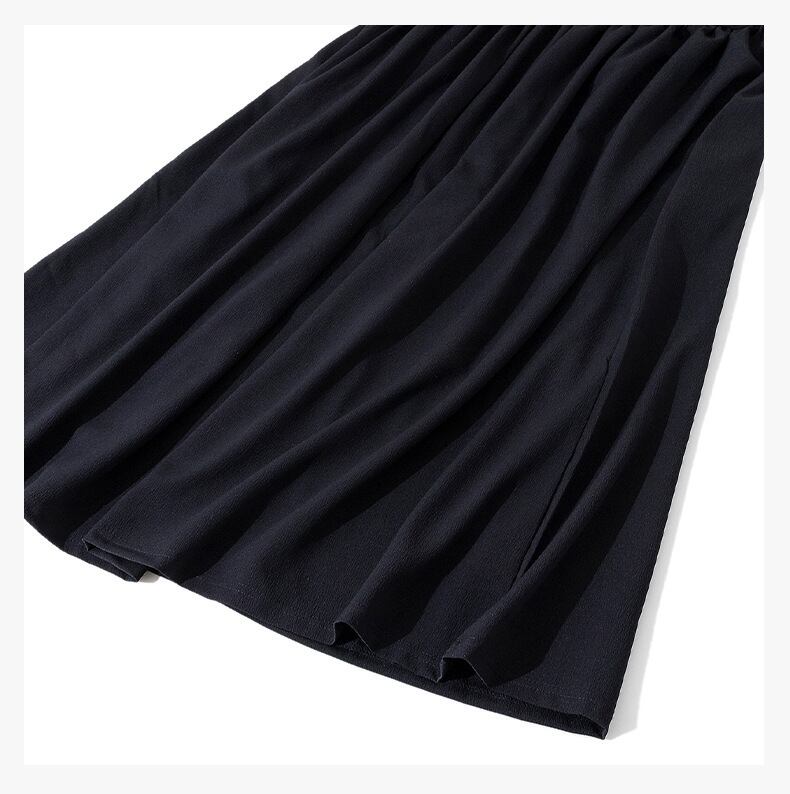高めのウエスト切り替えがスタイルアップを演出し、歩くたびに揺れるスカートが軽やかな印象を与えます。