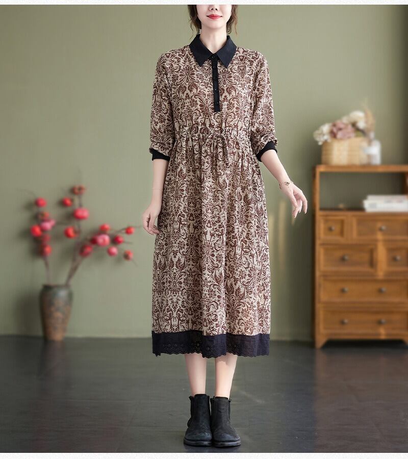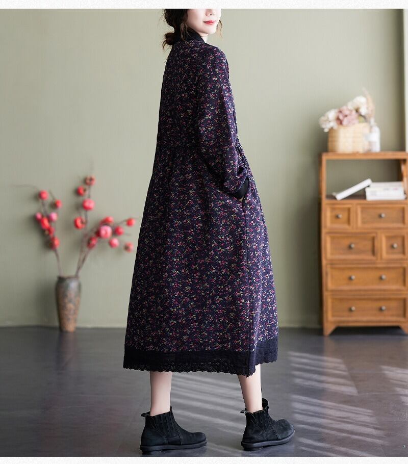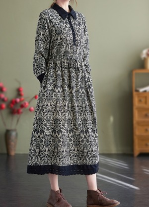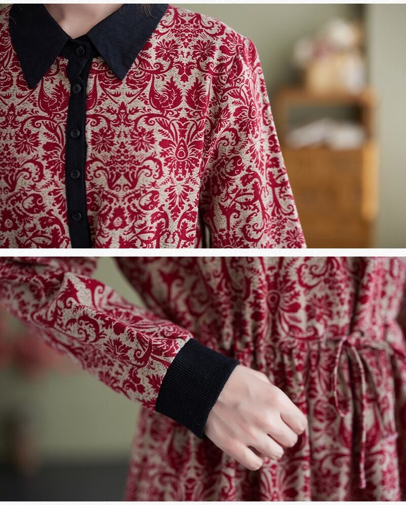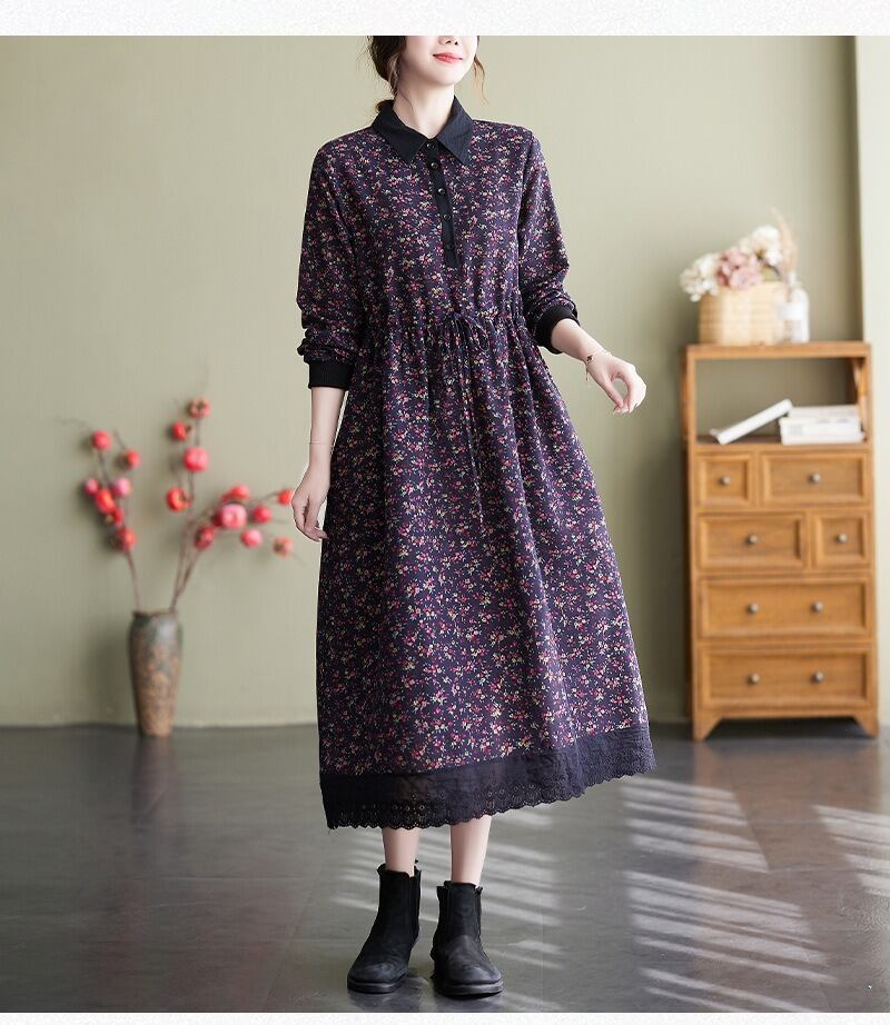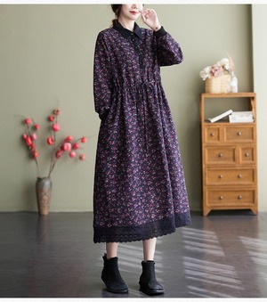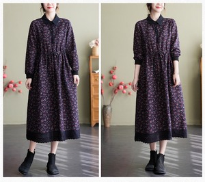 花柄で上品なミドル丈の長袖のシャツワンピースです。