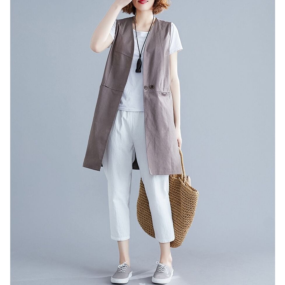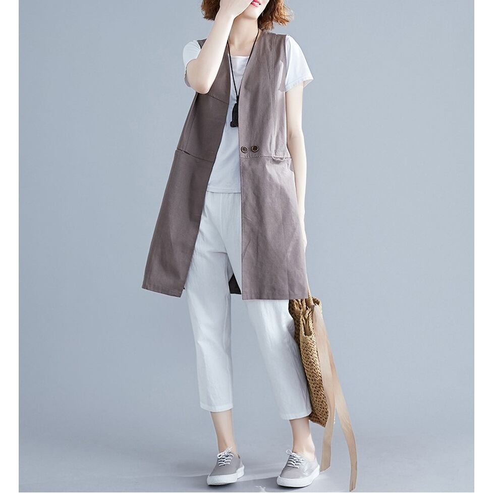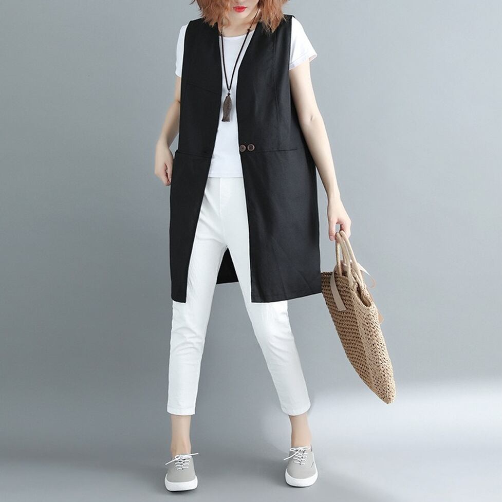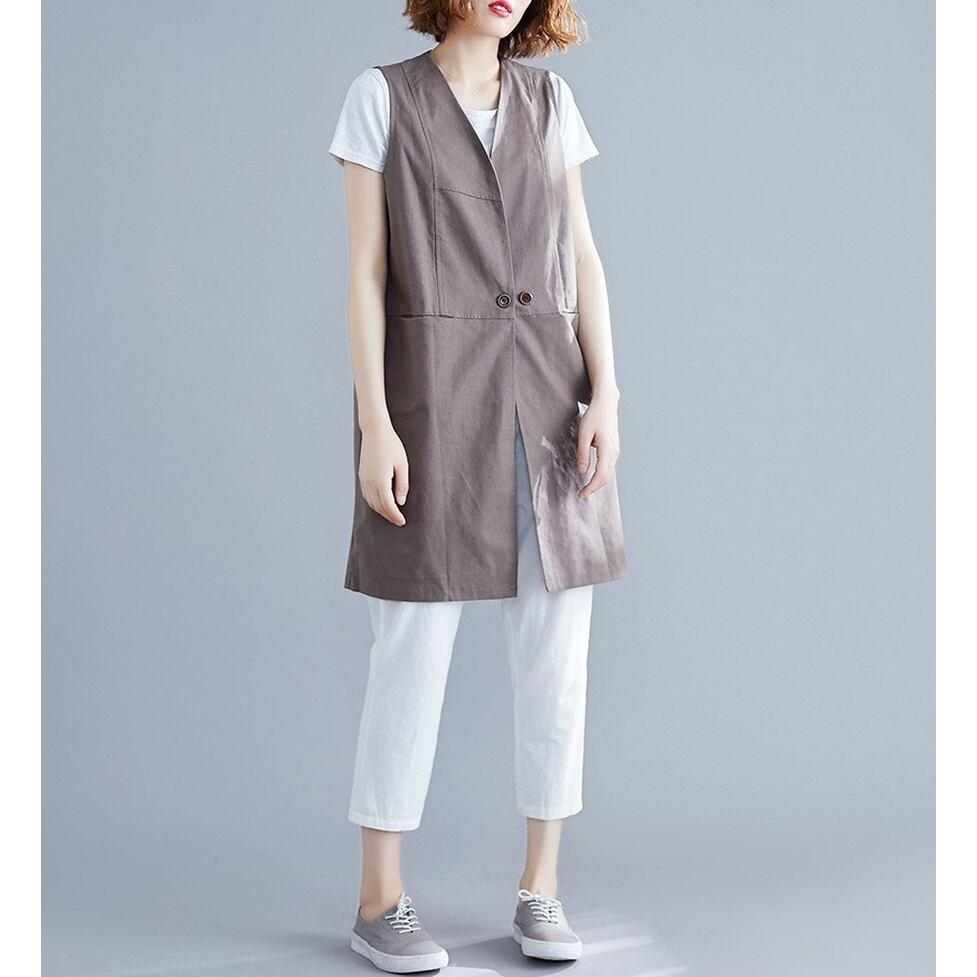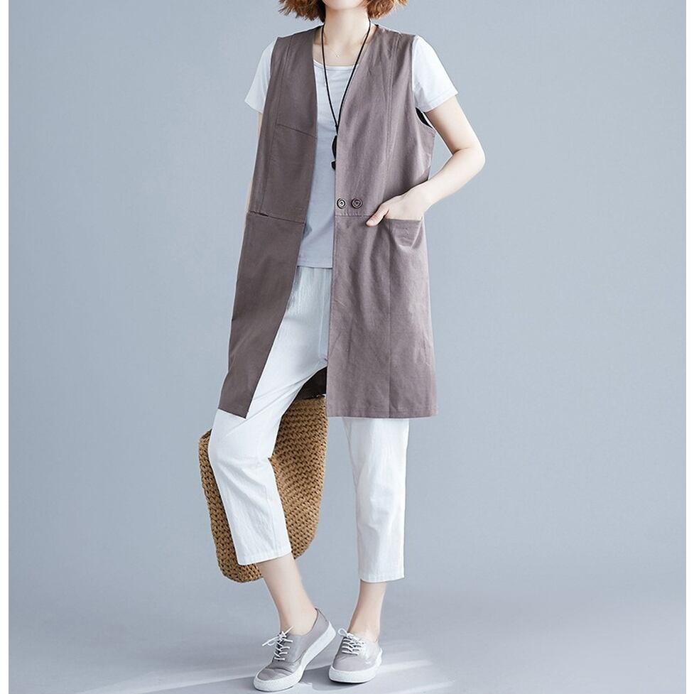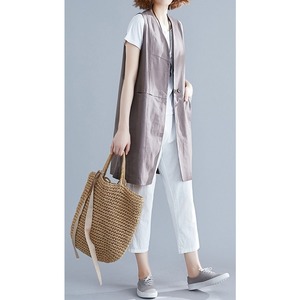 シンプルな切り替えデザインが特徴のロングジレ。涼しさときちんと感を両立するスマートな選択肢。コーディネートの完成度を高めてくれる名品。ほんのりマニッシュな印象を与えながら洗練と信頼感を演出する着こなしに