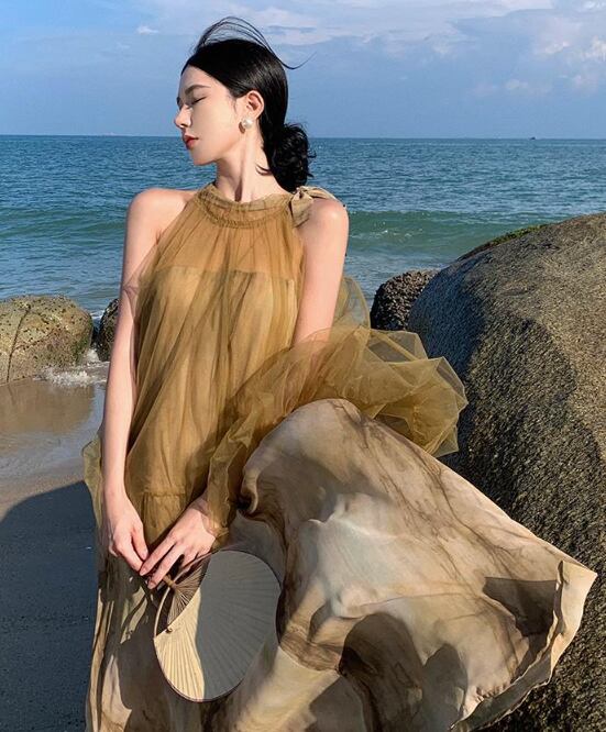 ホルダーネックとAラインのシルエットが、女性らしさを引き立てます。