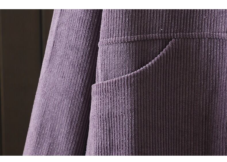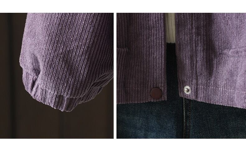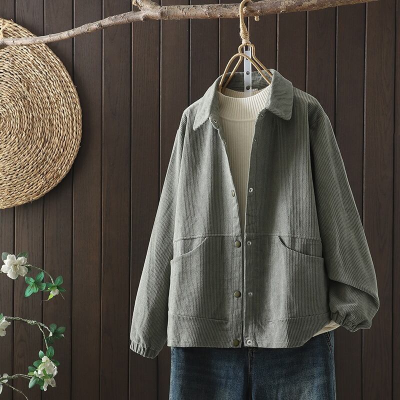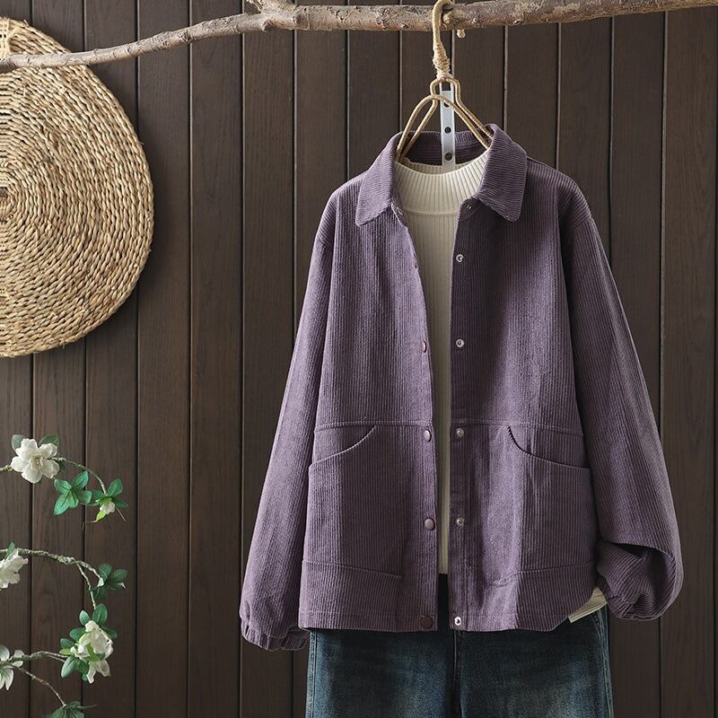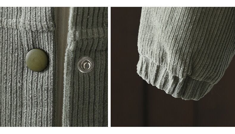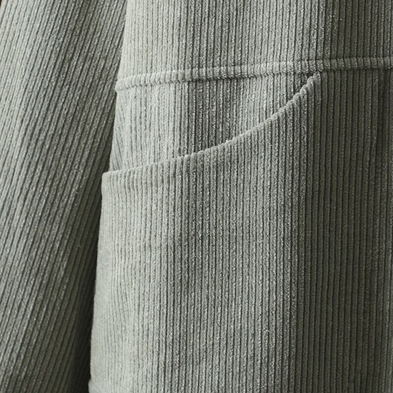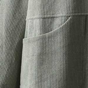 前開きデザインと襟付きの長袖で、普通丈ながらオーバーサイズのリラックス感が魅力です。中厚手のコーデュロイ素材を使用しているため、秋冬のコーディネートにもアクセントを加えてくれます。