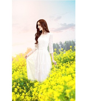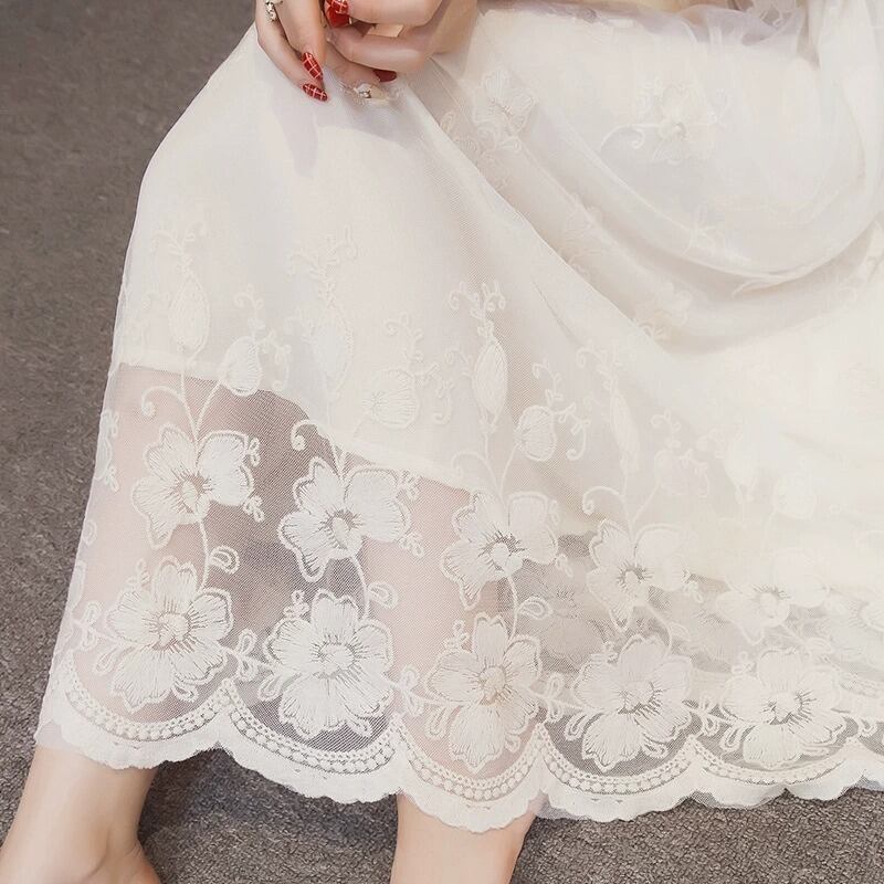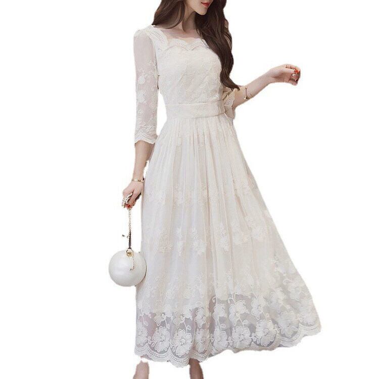 華やかな花柄の繊細なレースが絶妙に調和した、長袖マキシワンピース。