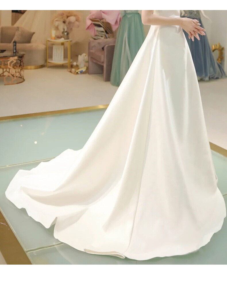 洗練された美しいシルエットが魅力のロングトレーンドレス。