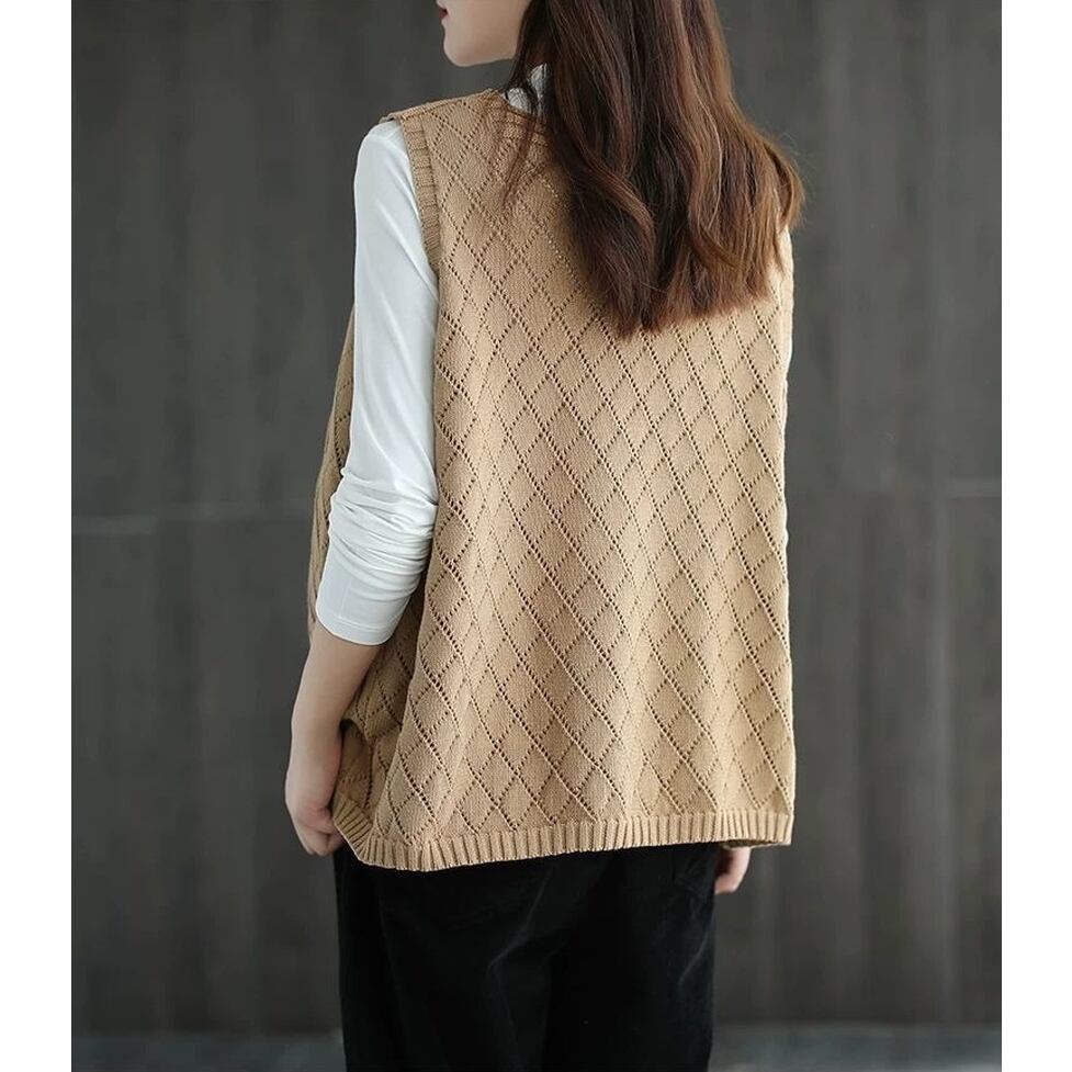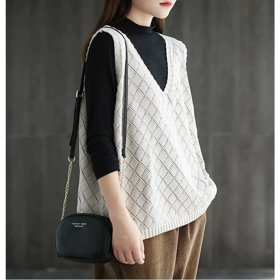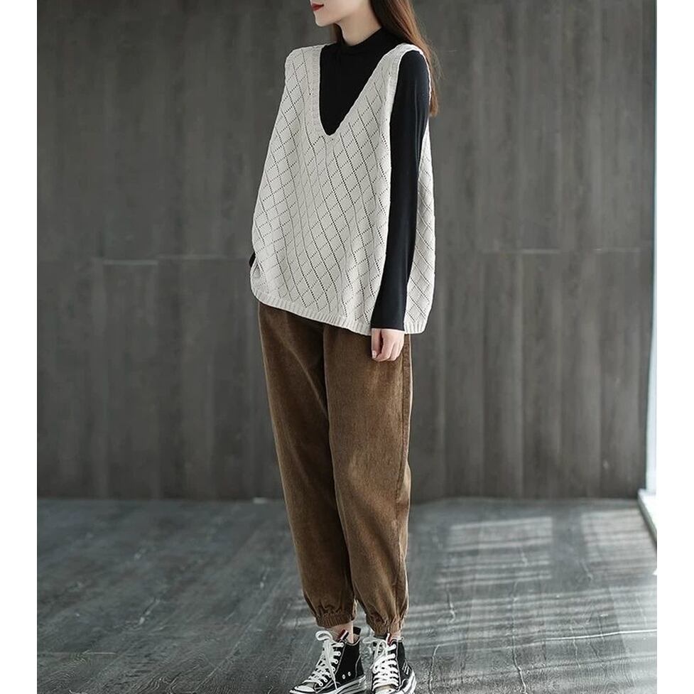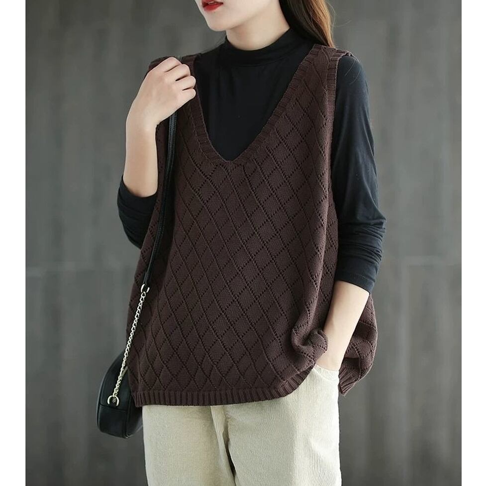 菱形ステッチでひそかに透けるややワイドなシルエットでカジュアルに装えるプルオーバーベスト。一点投入すると気分転換になるアイテム。シックでひかえめな柄が古着ライク。大人っぽいハズしに適任