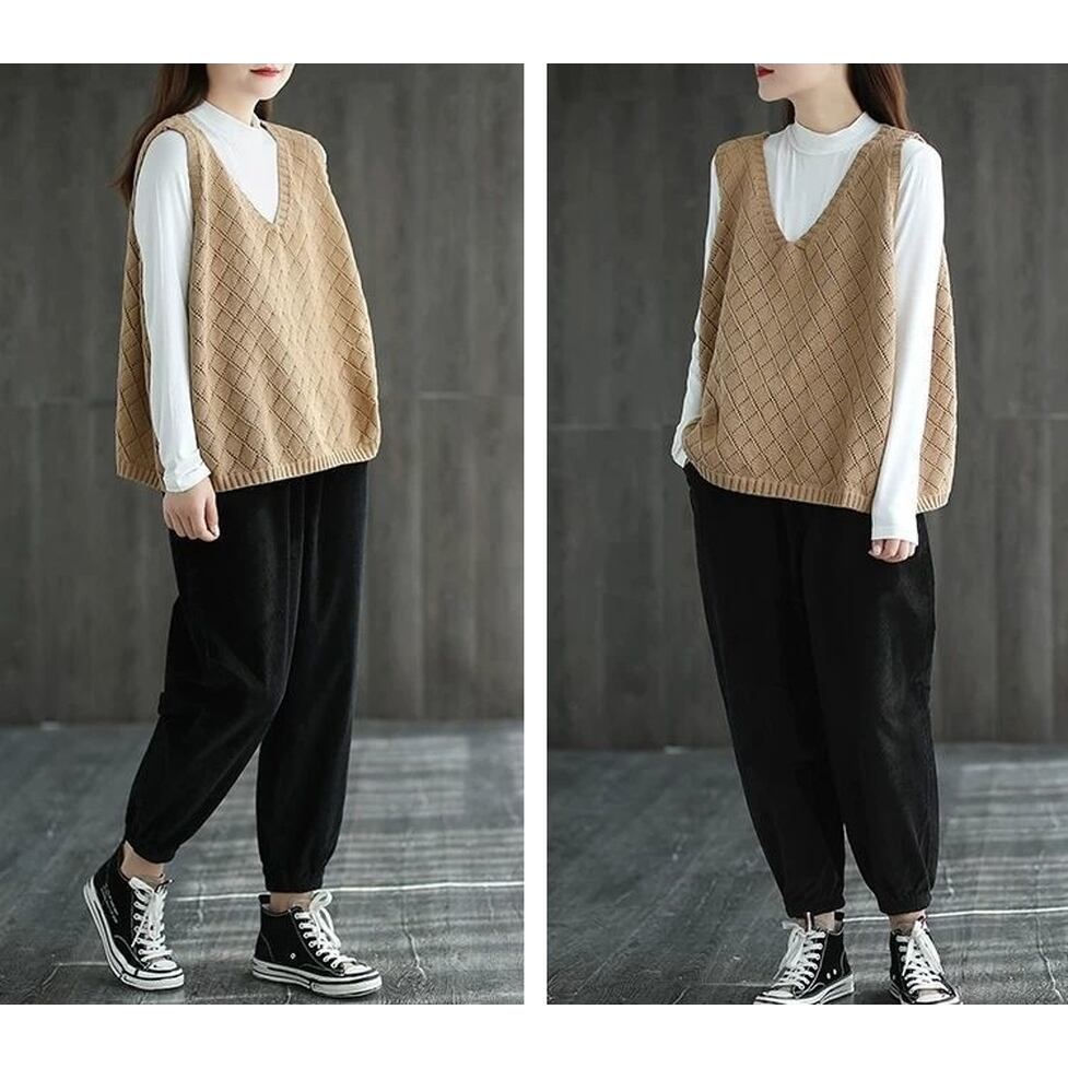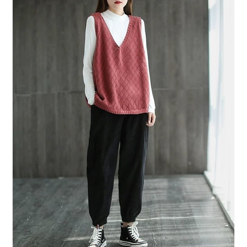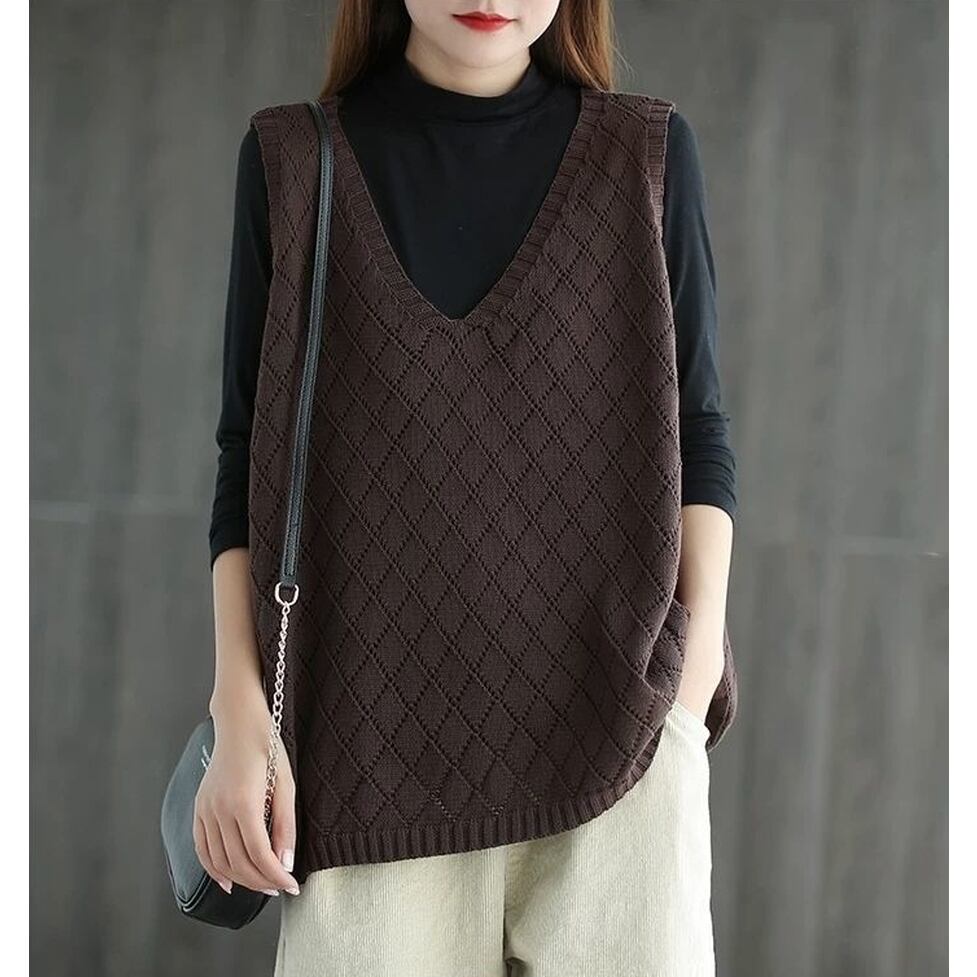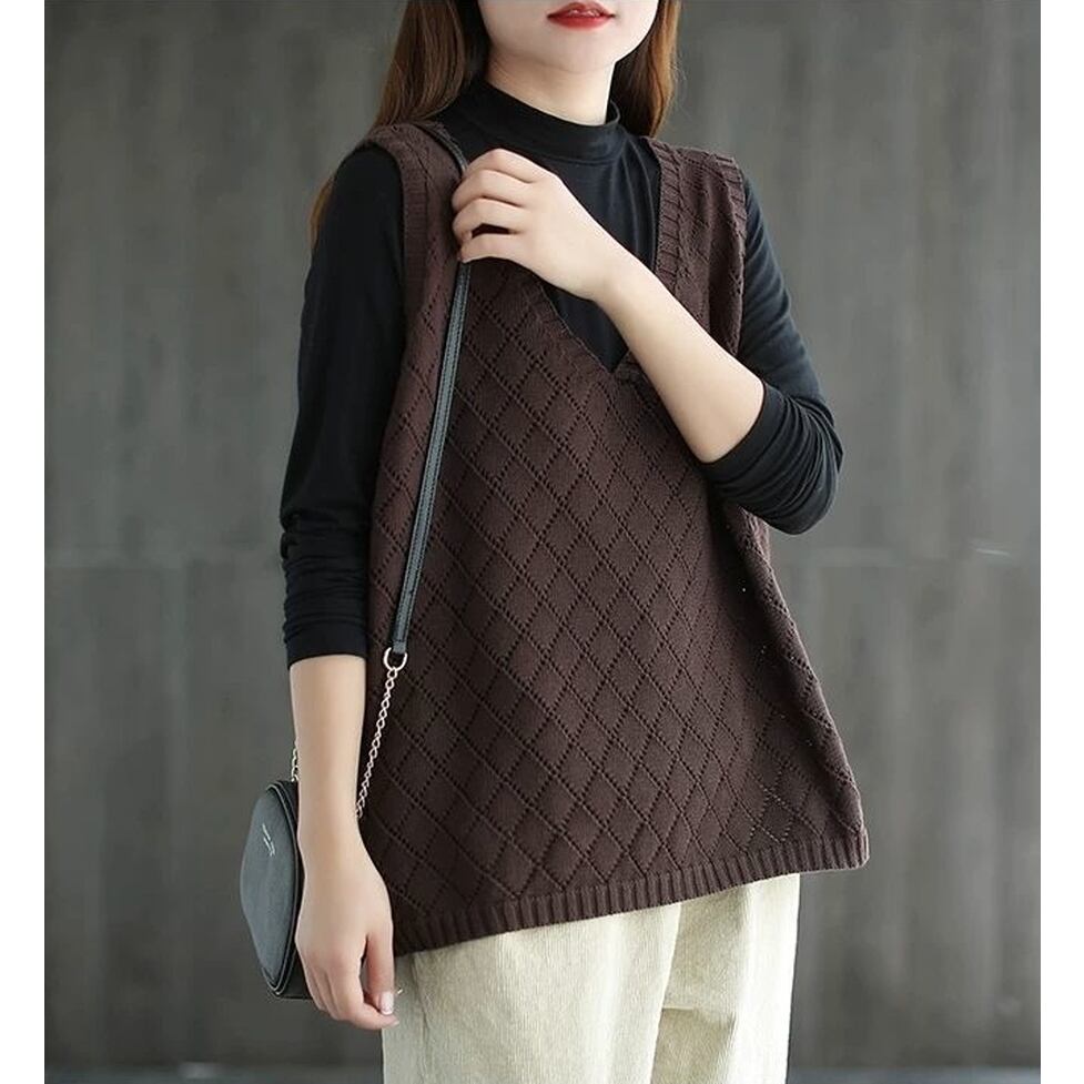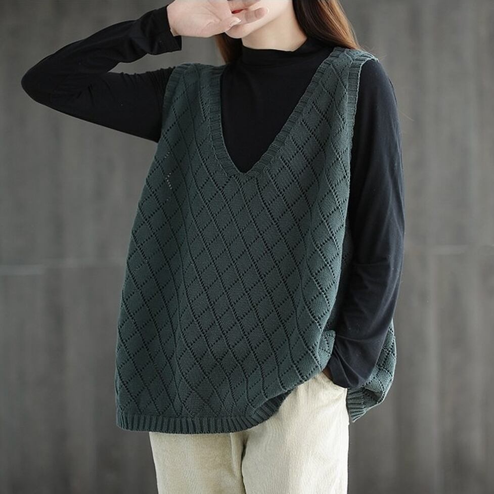 菱形ステッチでひそかに透けるややワイドなシルエットでカジュアルに装えるプルオーバーベスト。一点投入すると気分転換になるアイテム。シックでひかえめな柄が古着ライク。大人っぽいハズしに適任